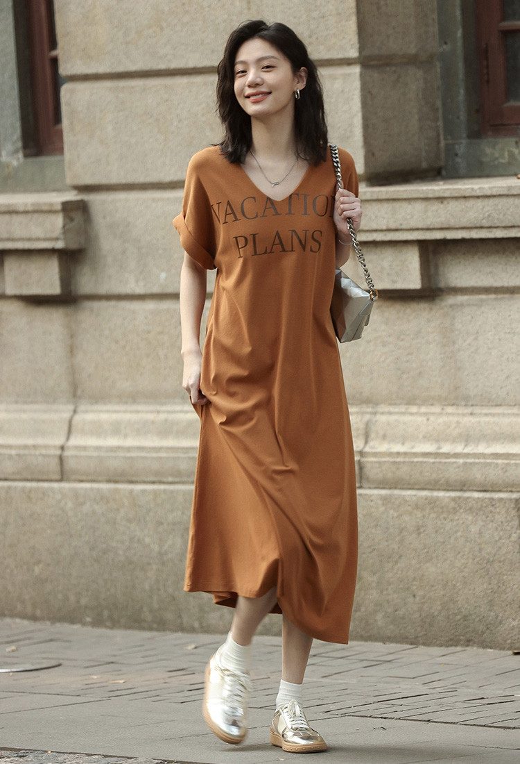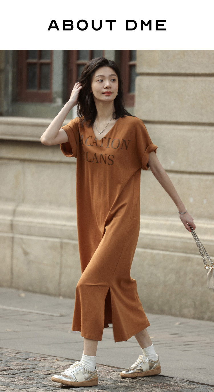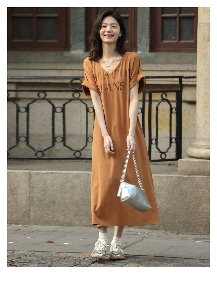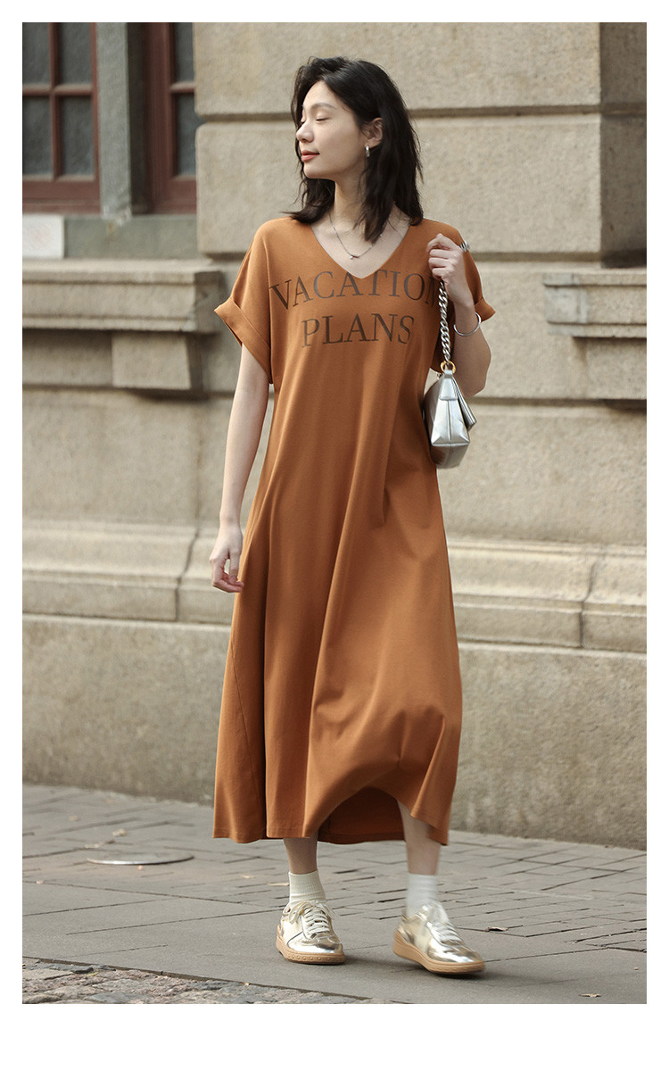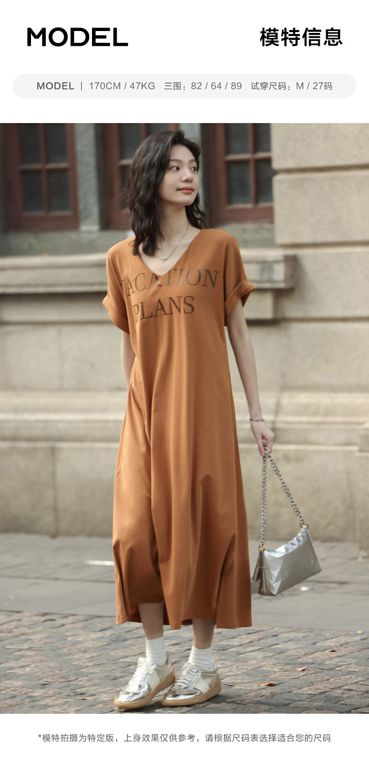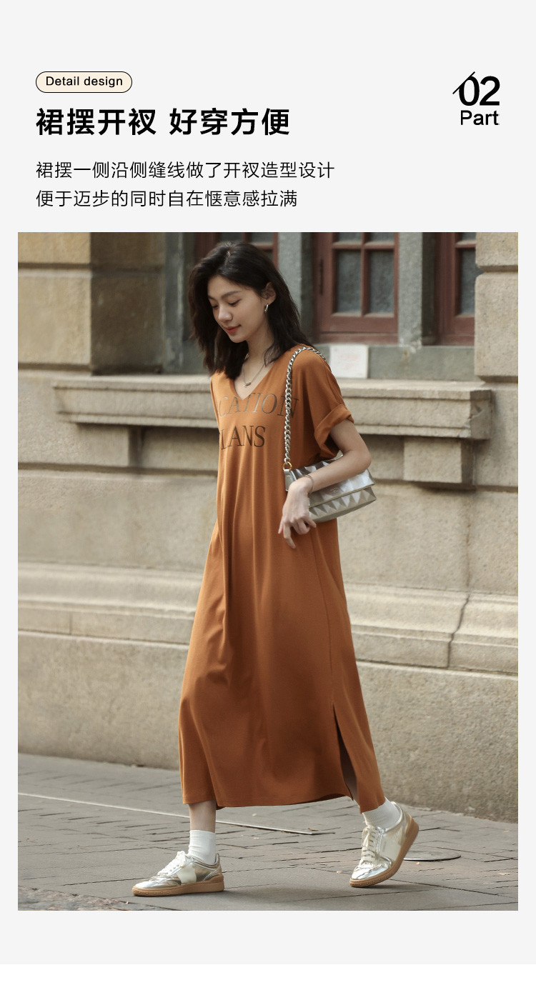 商品名称:【V领套头设计感长裙】夏印花短袖侧缝开衩长款连衣裙 017922