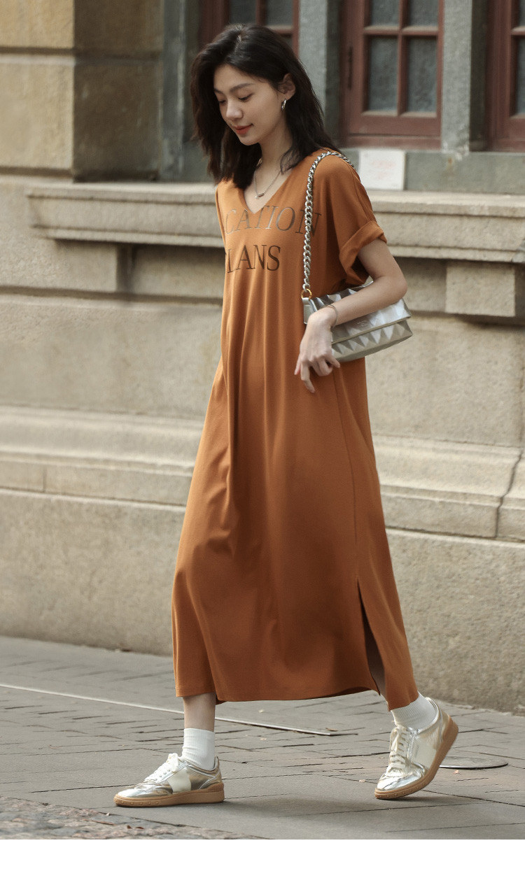 【V领套头设计感长裙】夏印花短袖侧缝开衩长款连衣裙 017922