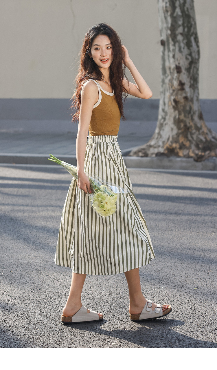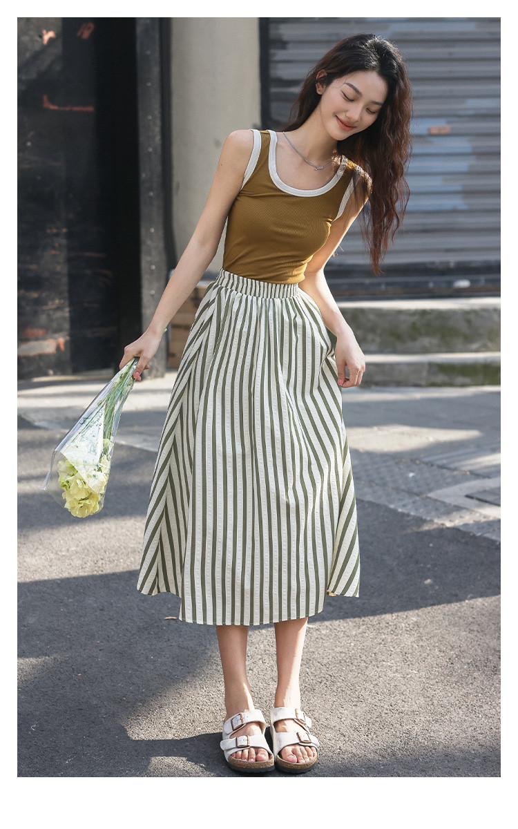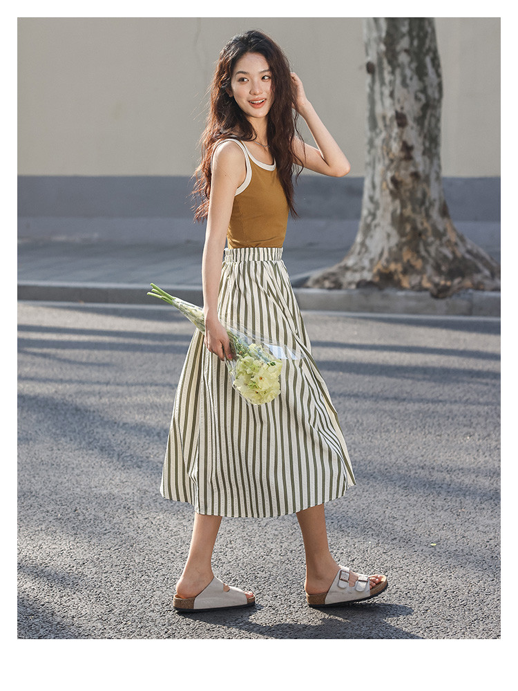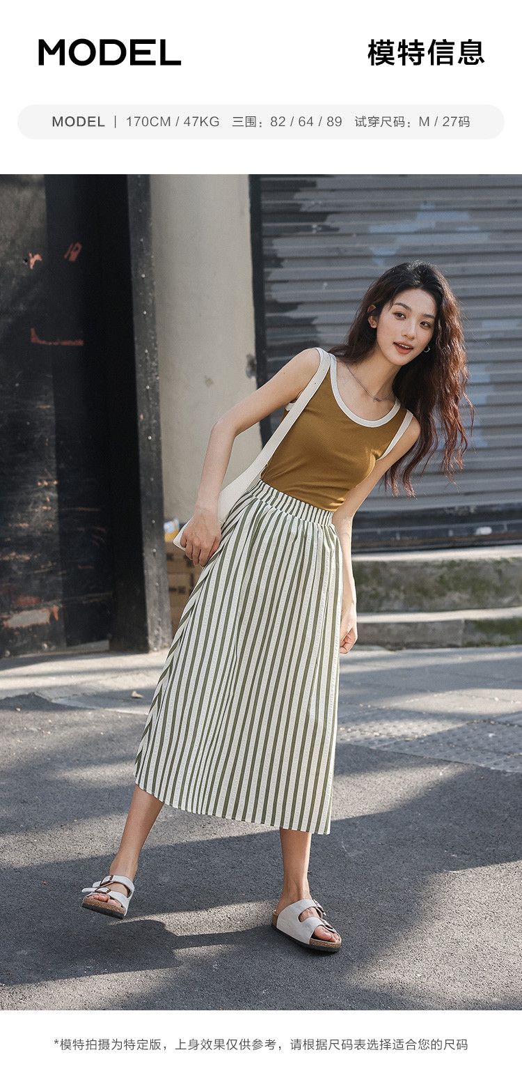 商品名称:【基础款条纹半身裙】夏松紧绿条纹基础百搭长款半身裙 165762