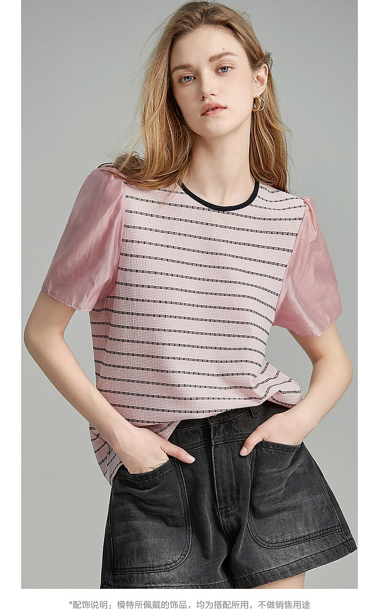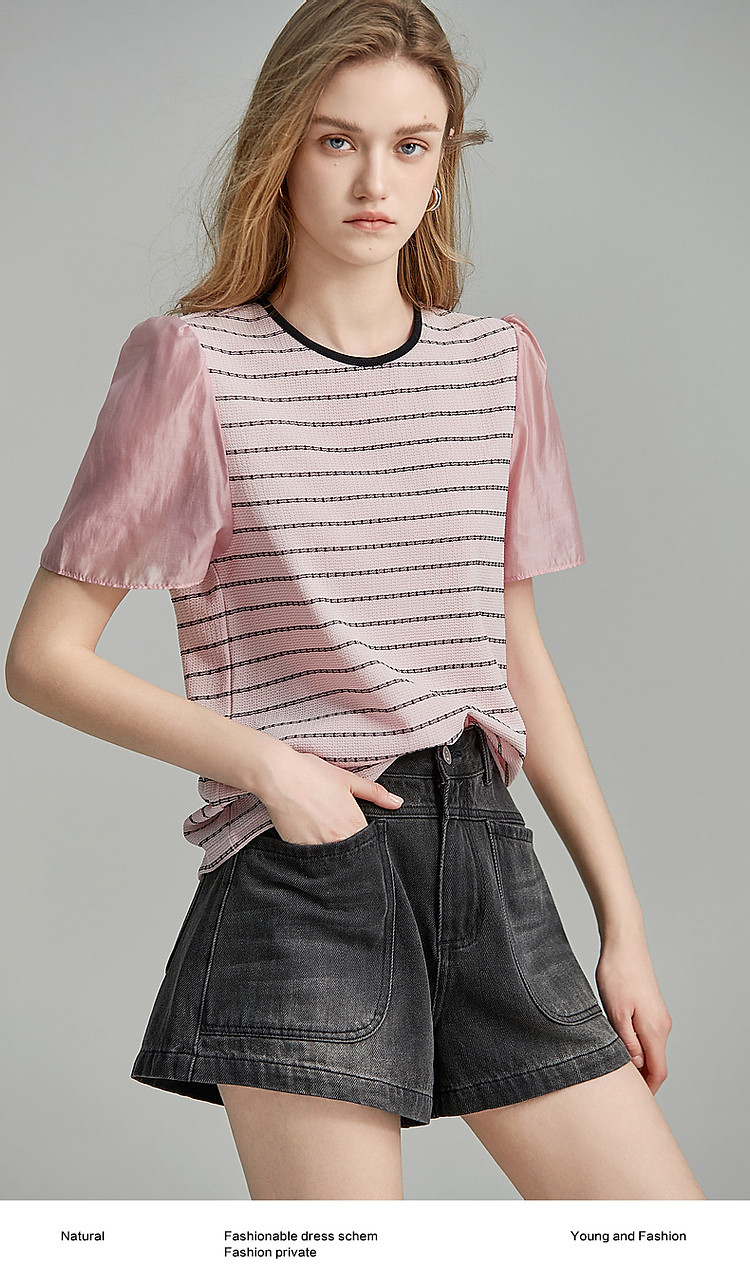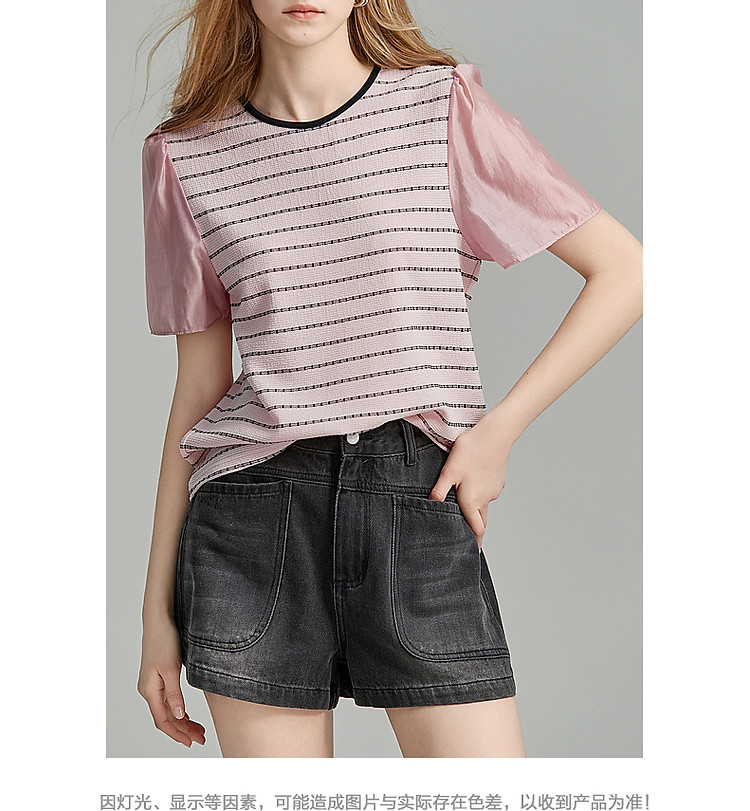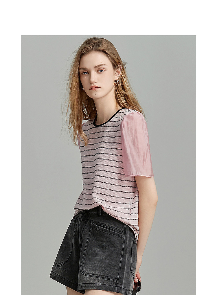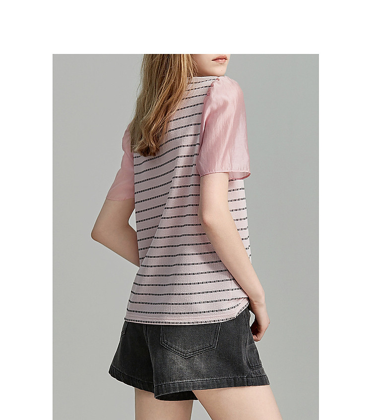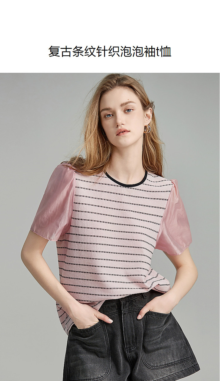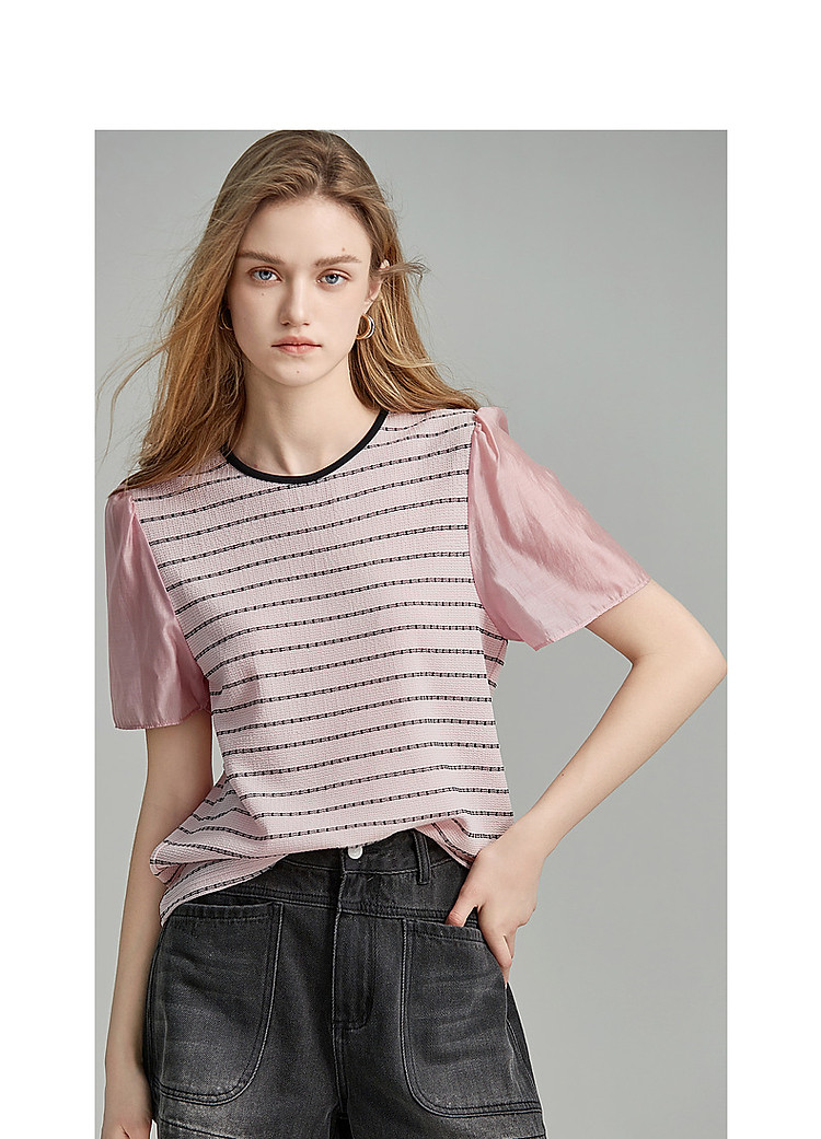 商品名称:【环保莱赛尔】夏季复古风圆领条纹泡泡袖拼接小个子气质女式t恤 142785