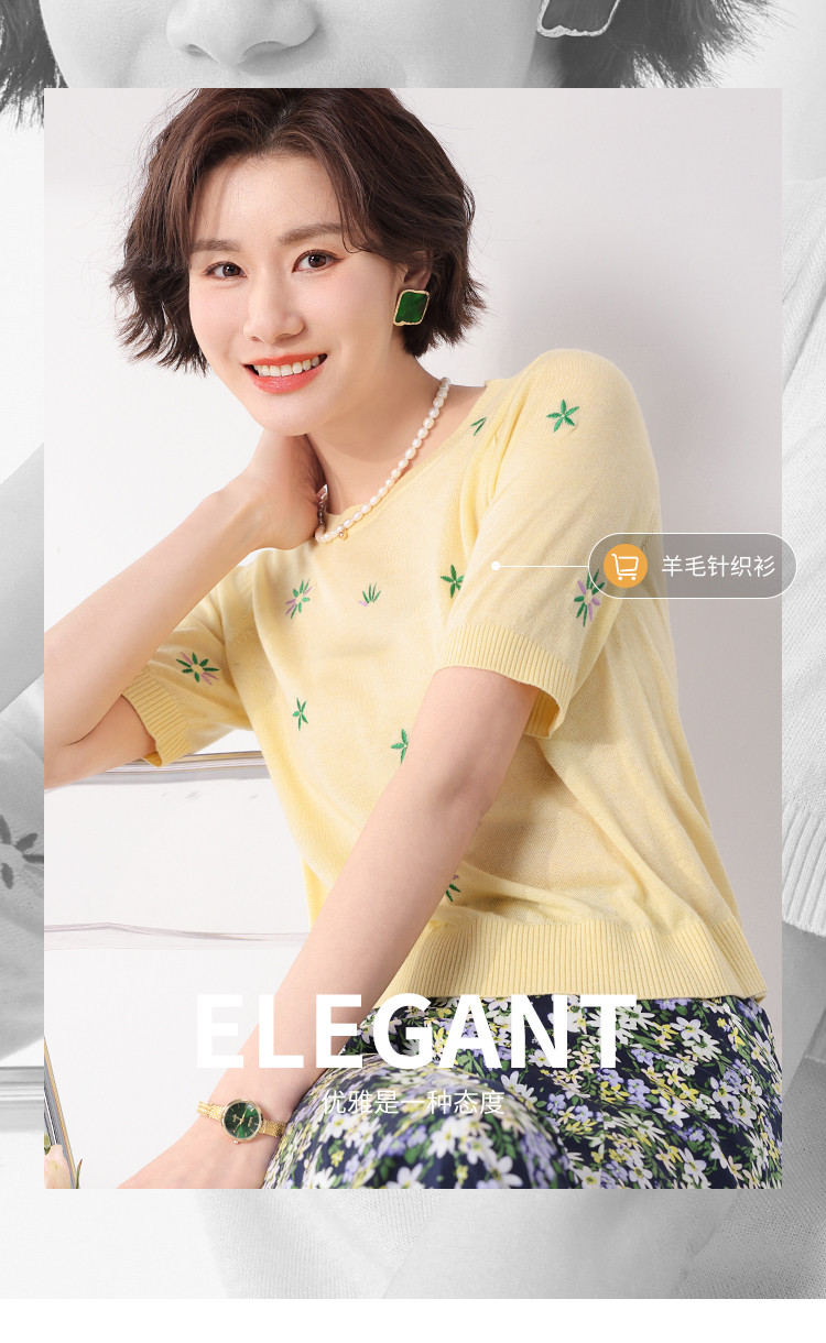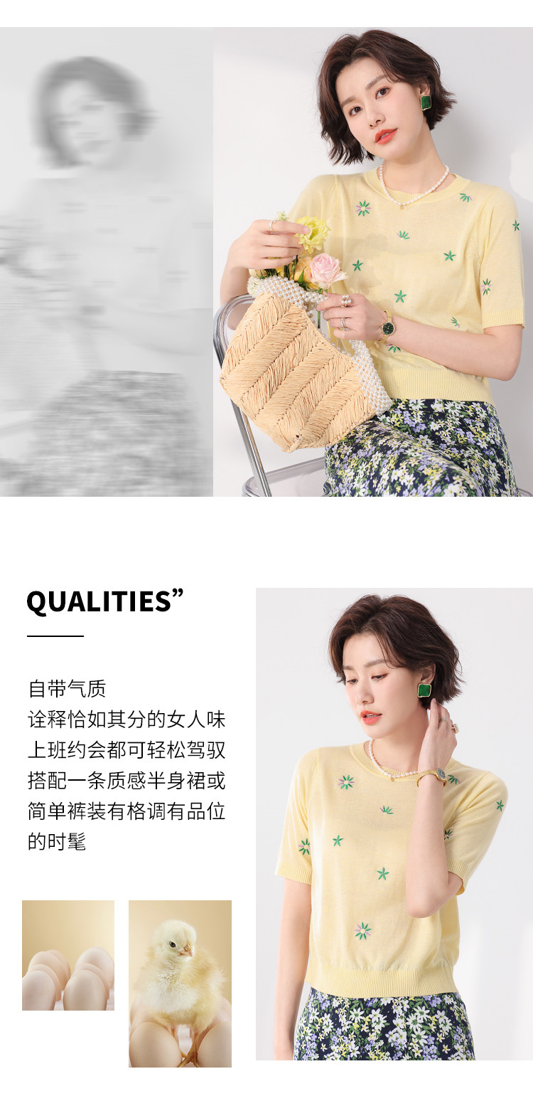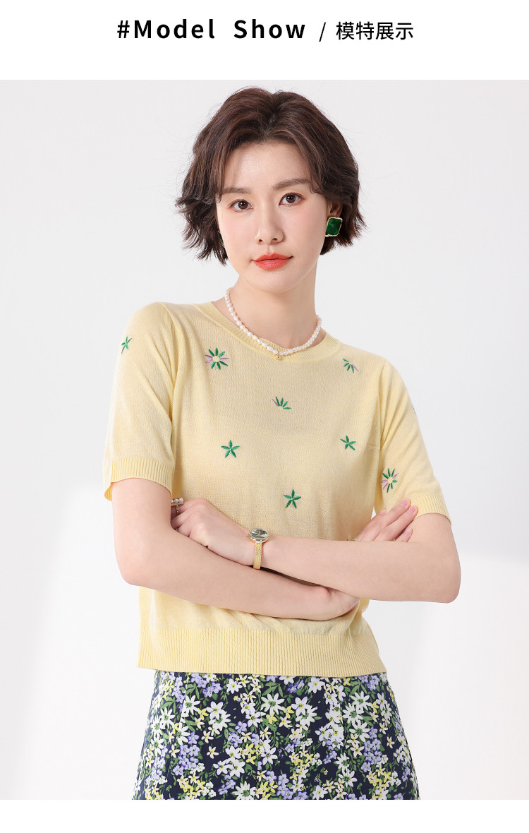 商品名称:轻薄透气简约绣花圆领针织打底短袖T恤羊毛衫毛衣 069139