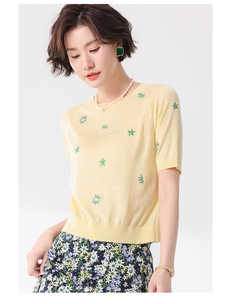 轻薄透气简约绣花圆领针织打底短袖T恤羊毛衫毛衣 069139