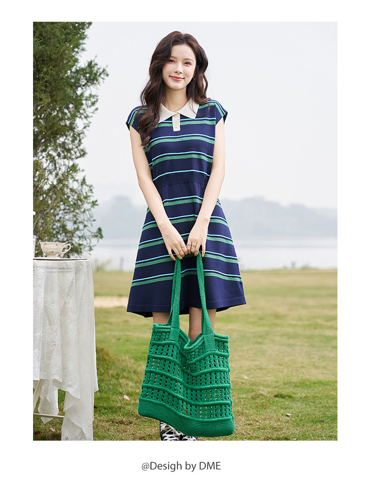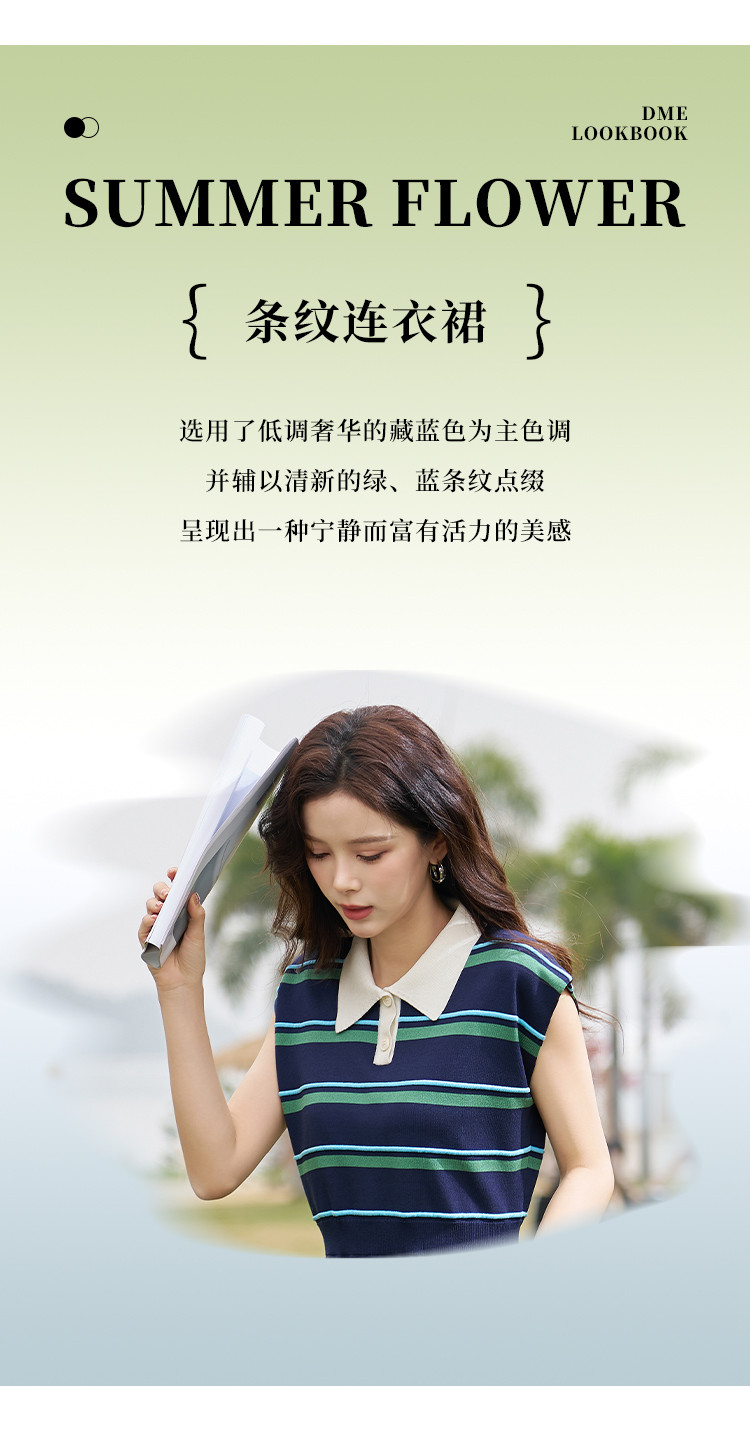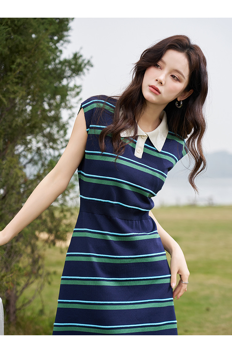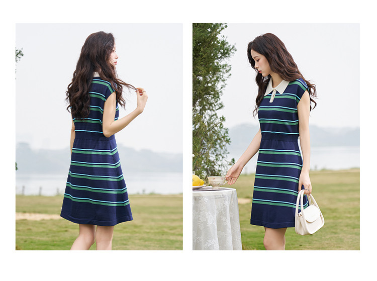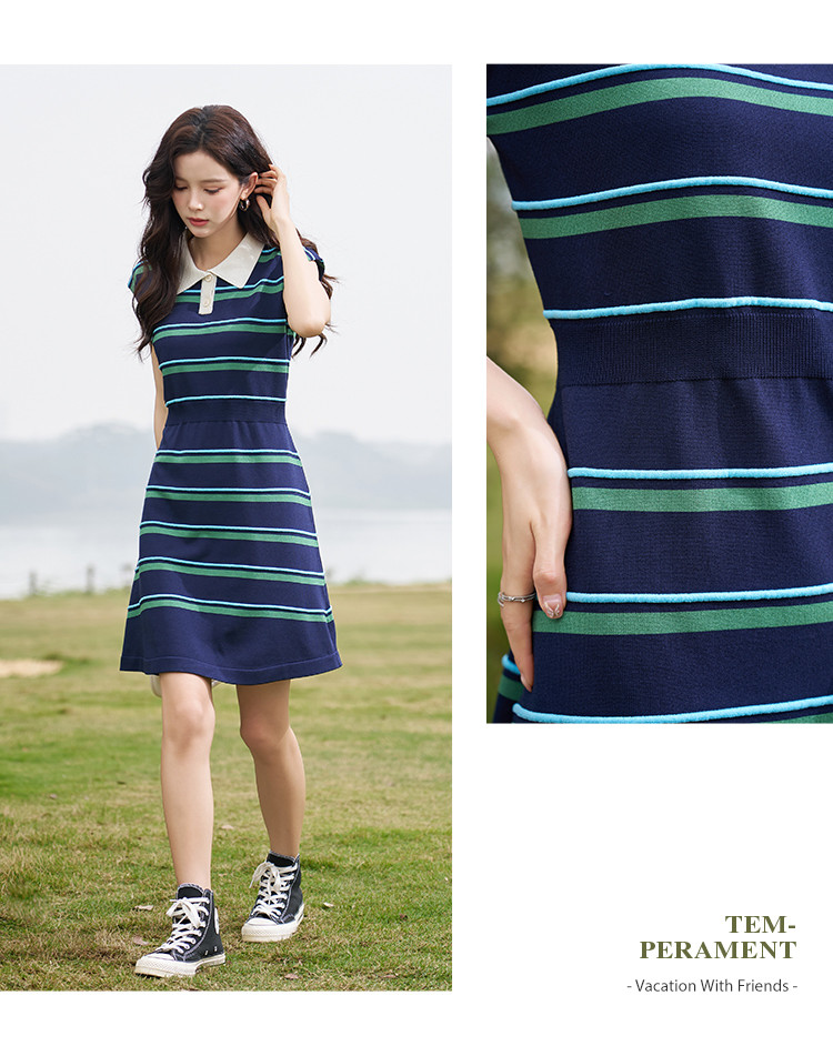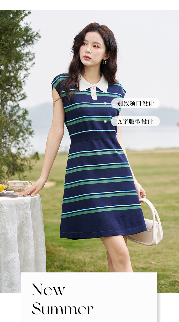 商品名称:【线条美学】春夏轻龄条纹学院风舒适松紧腰藏肉A字中长连衣裙女 697089