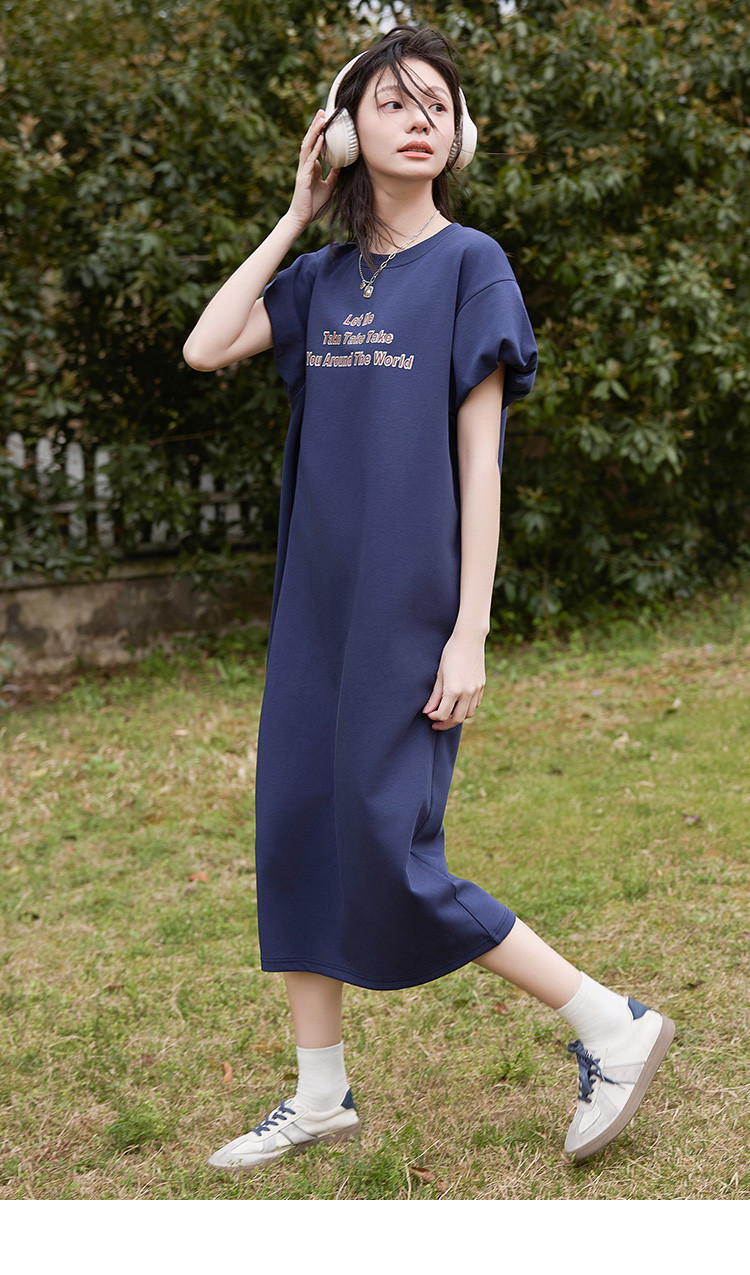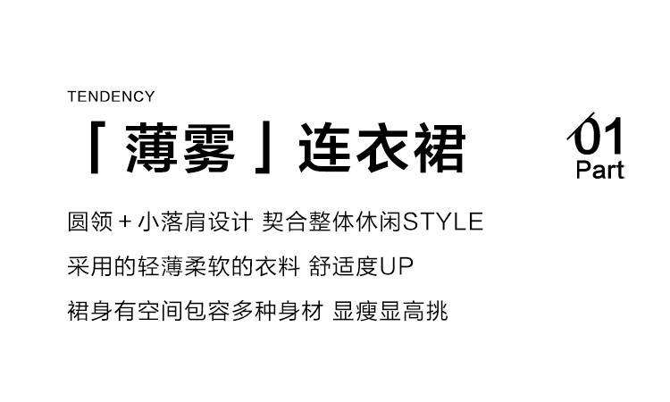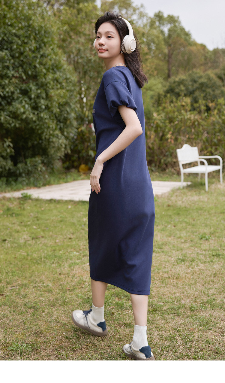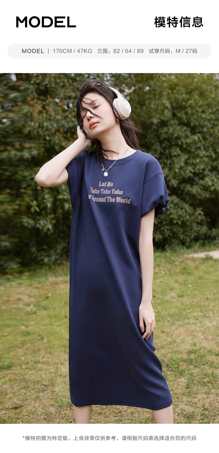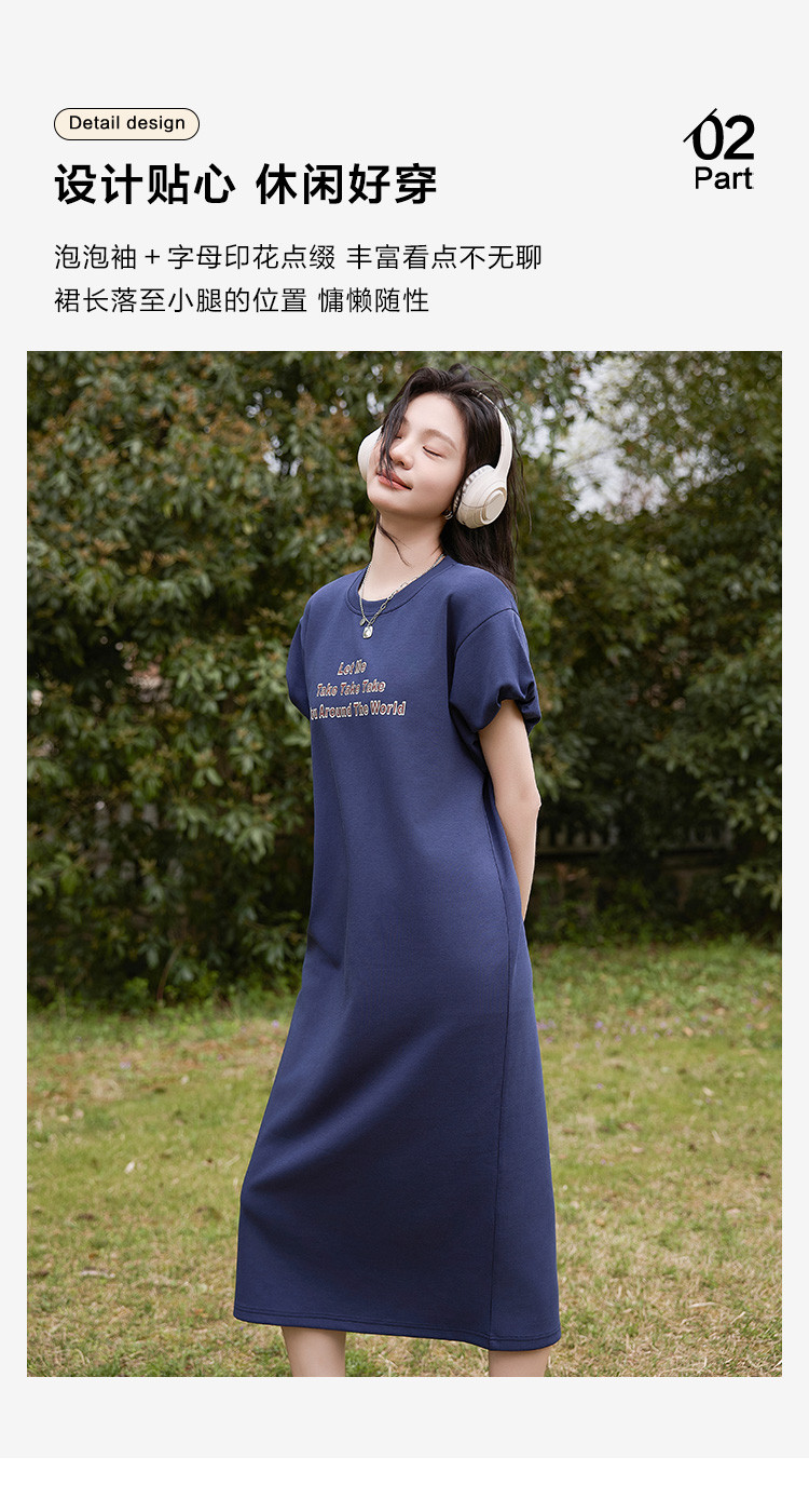 商品名称:【薄雾连衣裙】夏款圆领印花袖口抽绳短袖长款连衣裙 873858
