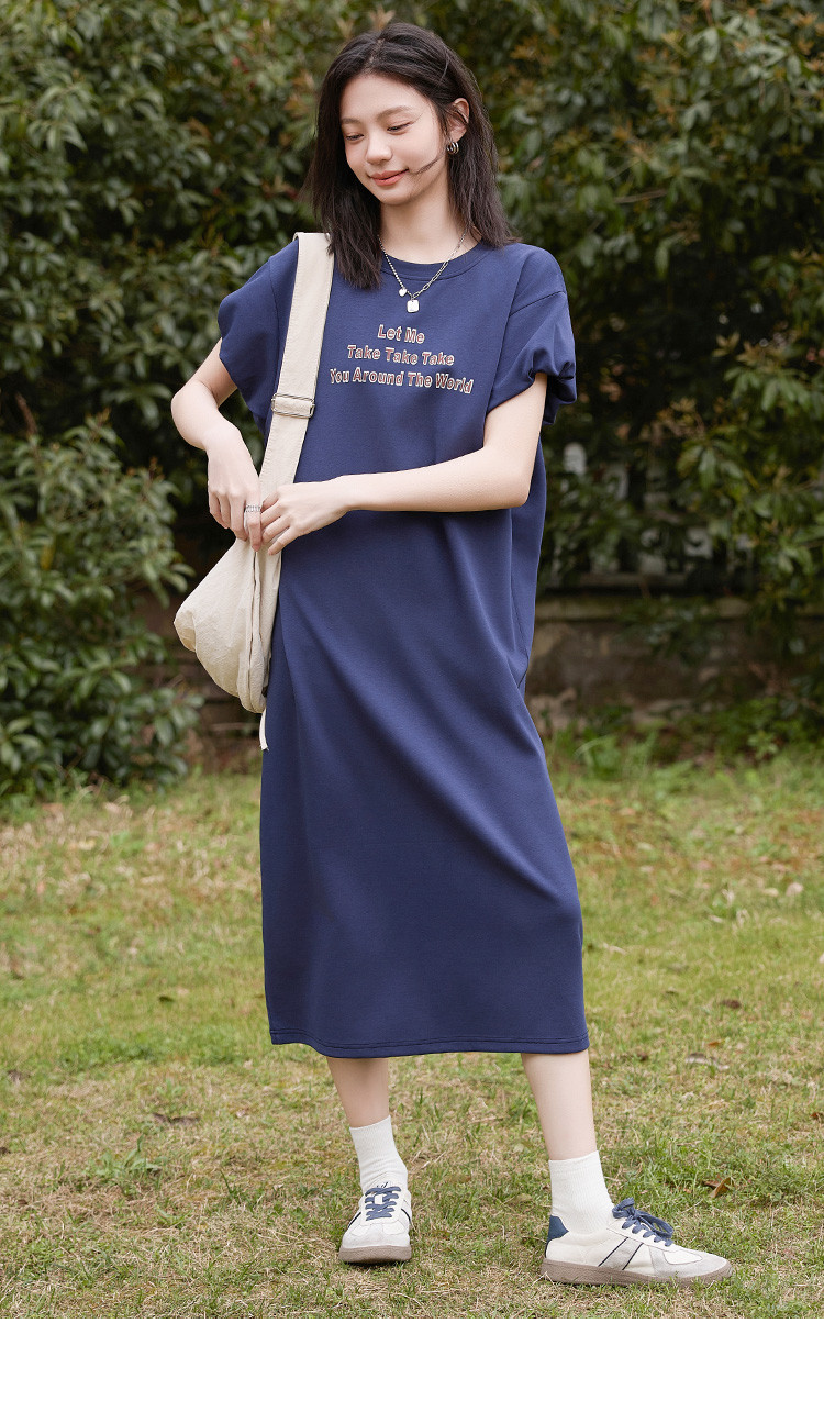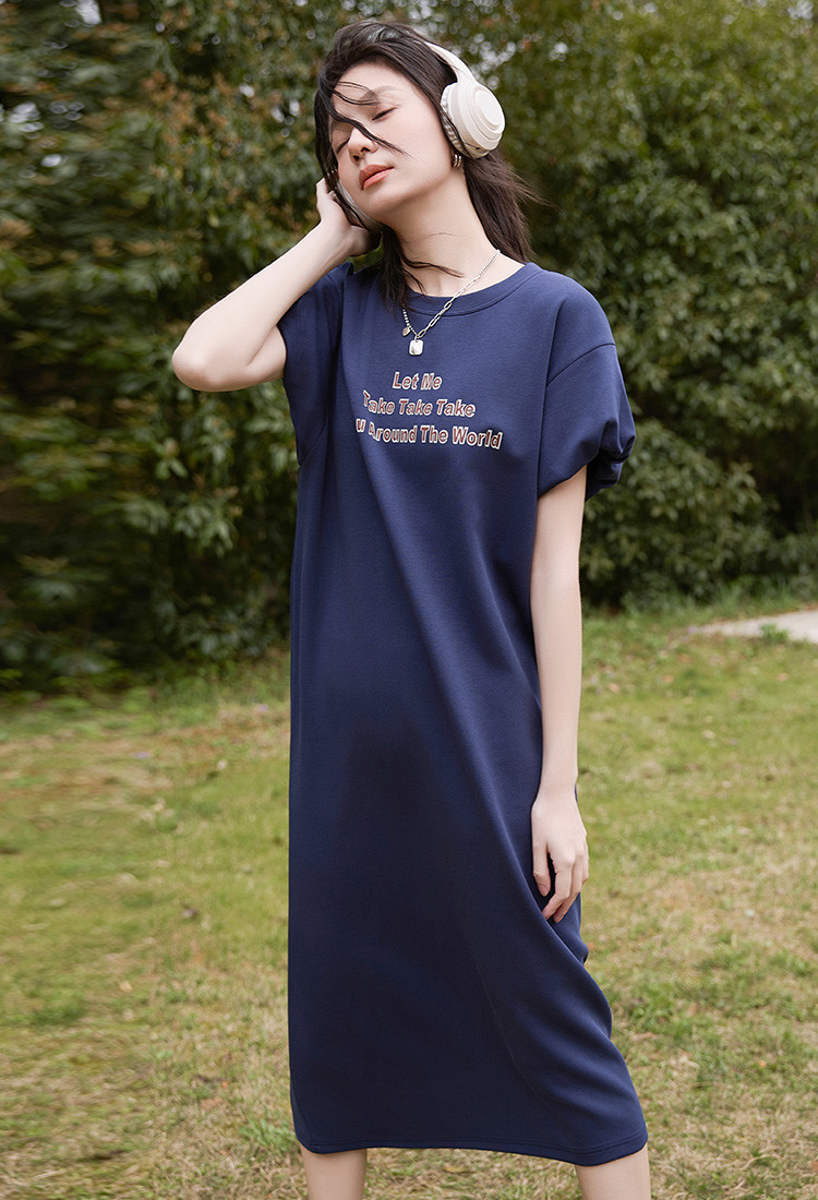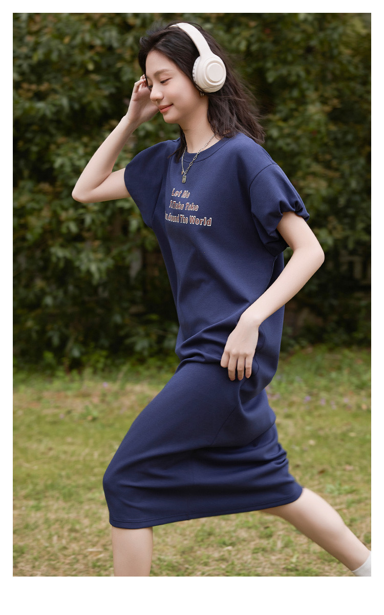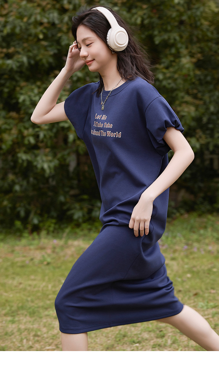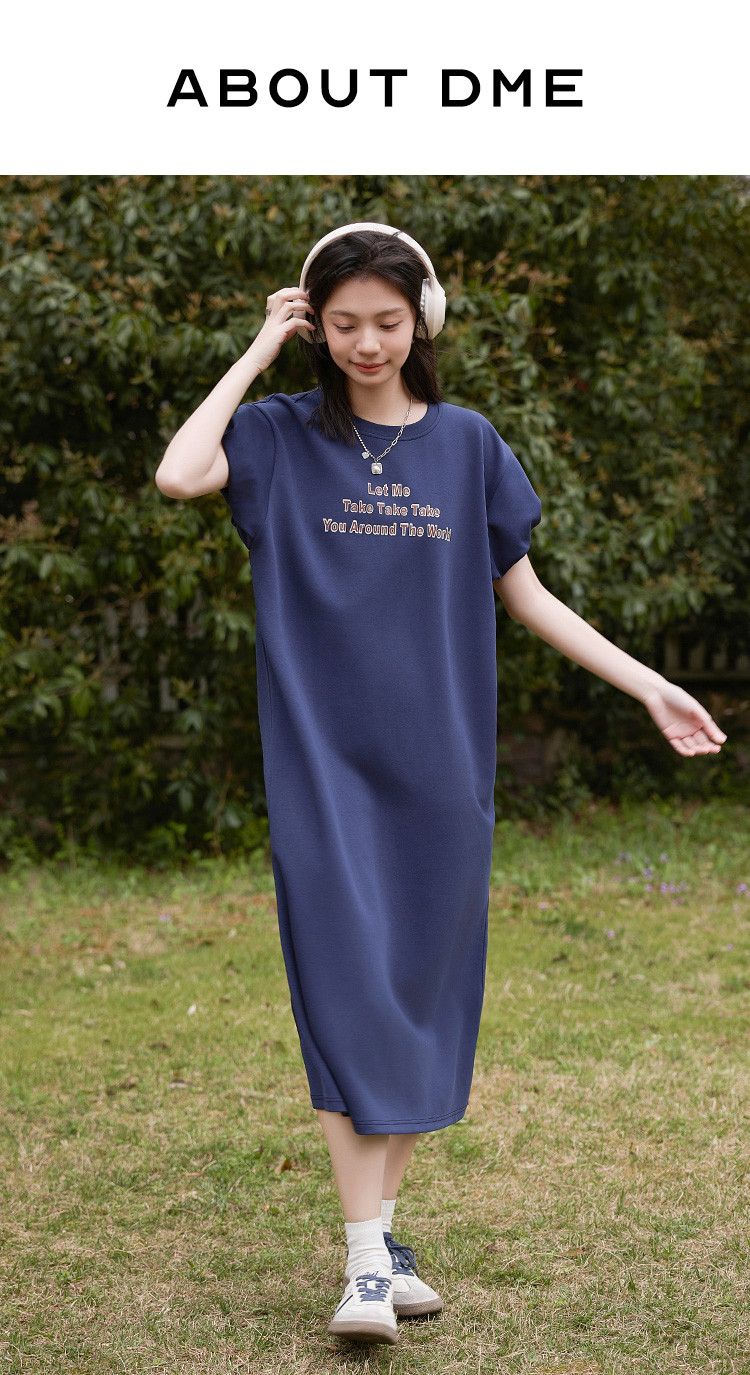 商品名称:【薄雾连衣裙】夏款圆领印花袖口抽绳短袖长款连衣裙 873858