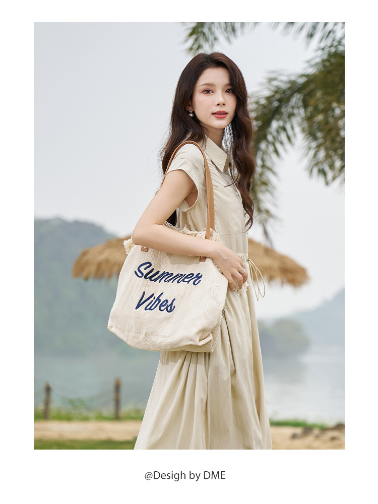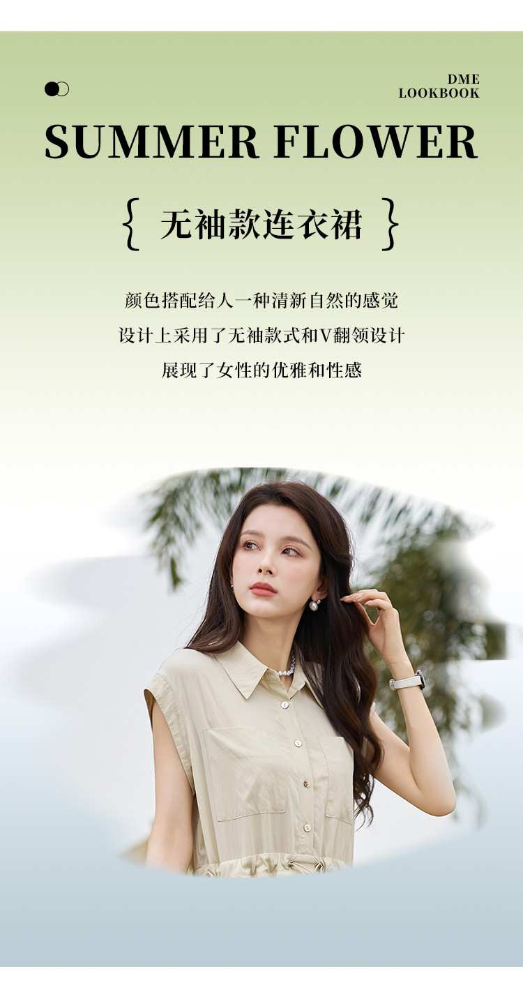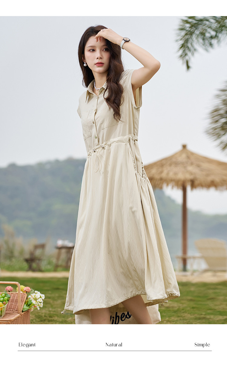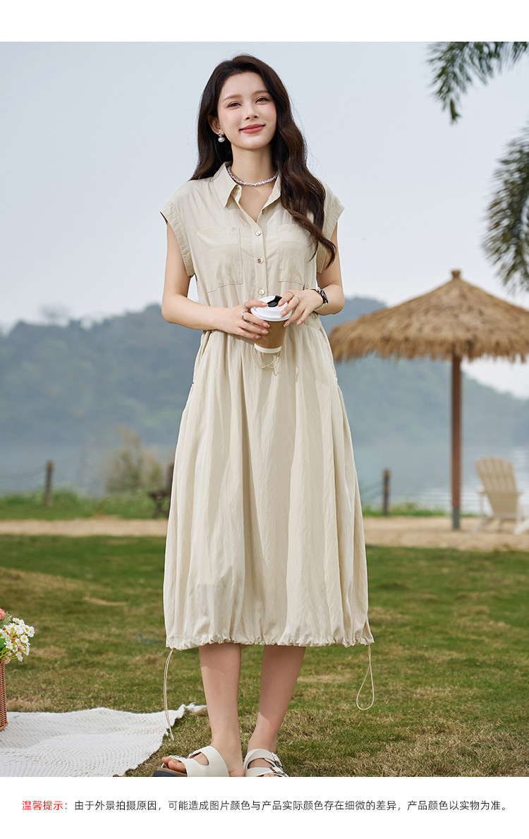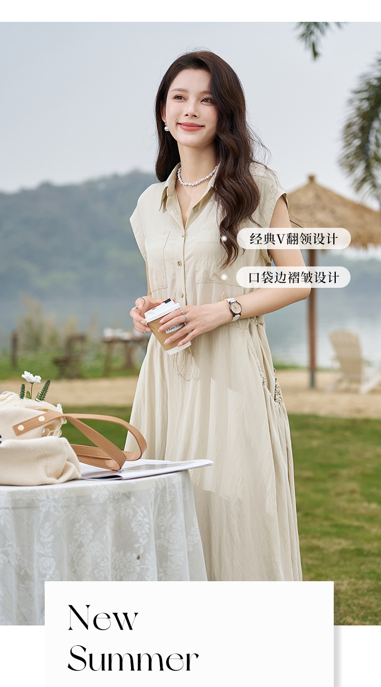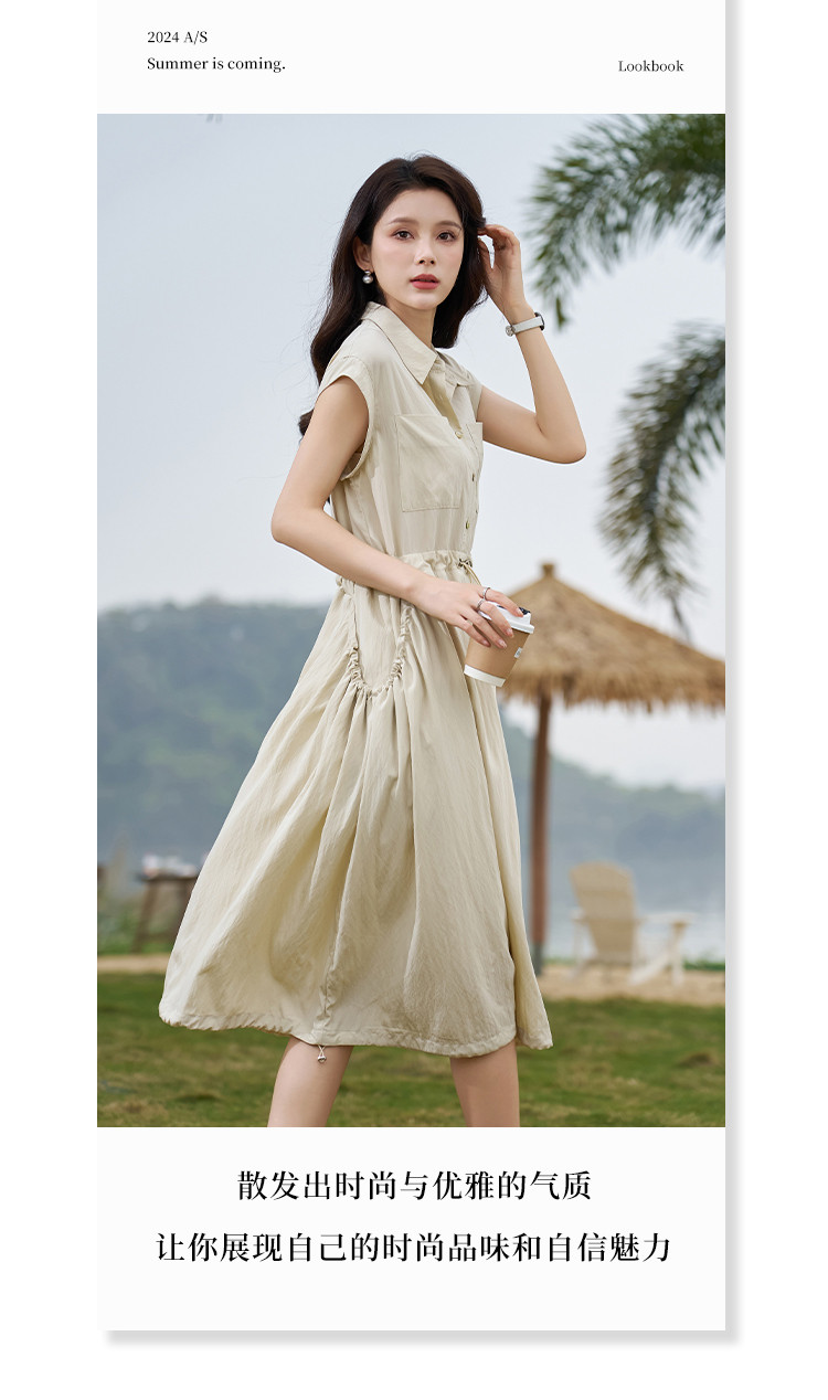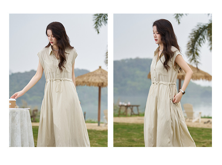 商品名称:【轻自由系列】夏法式文艺通勤抽带收腰褶皱A字衬衫式连衣裙女 134209