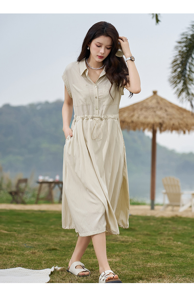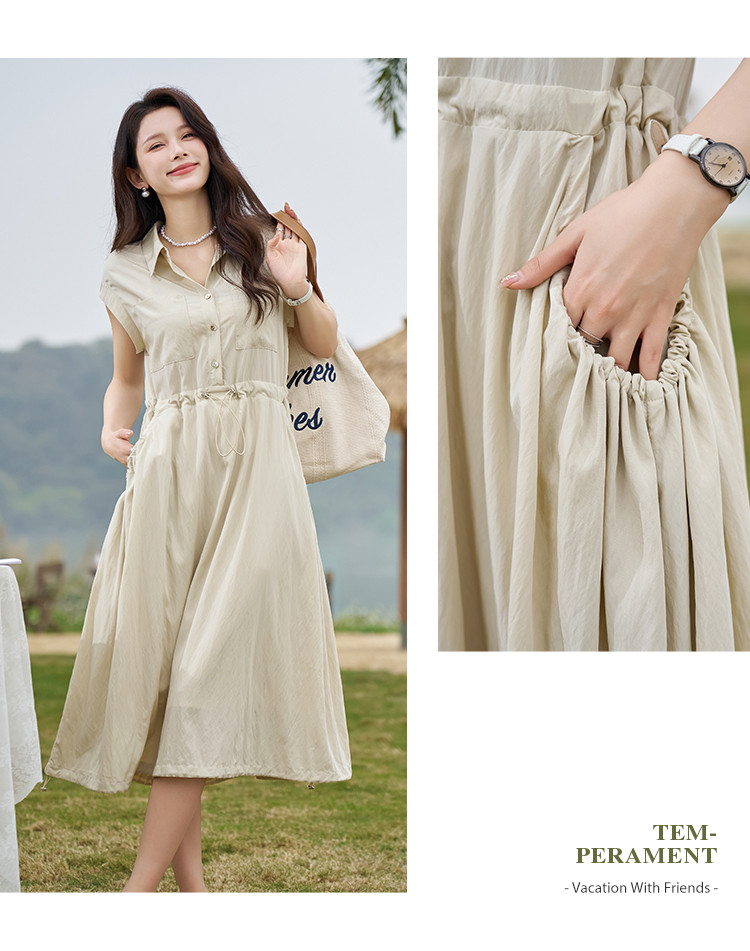 【轻自由系列】夏法式文艺通勤抽带收腰褶皱A字衬衫式连衣裙女 134209