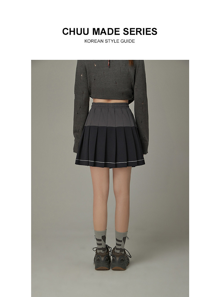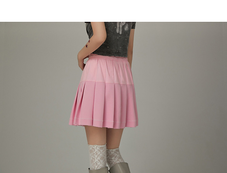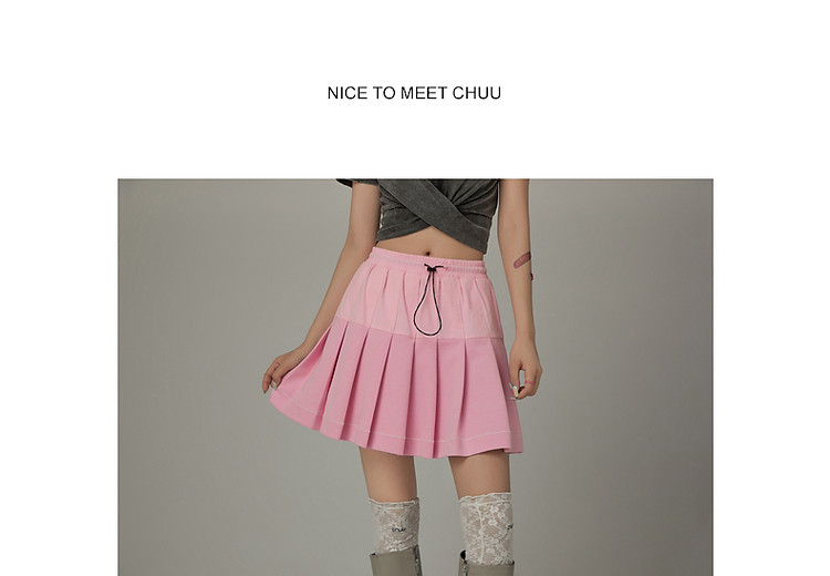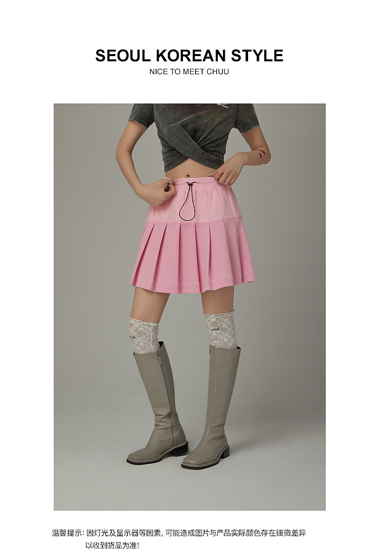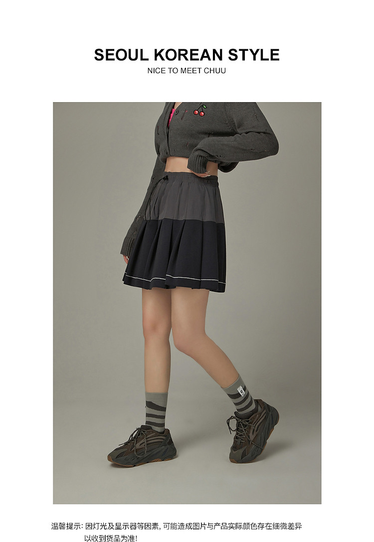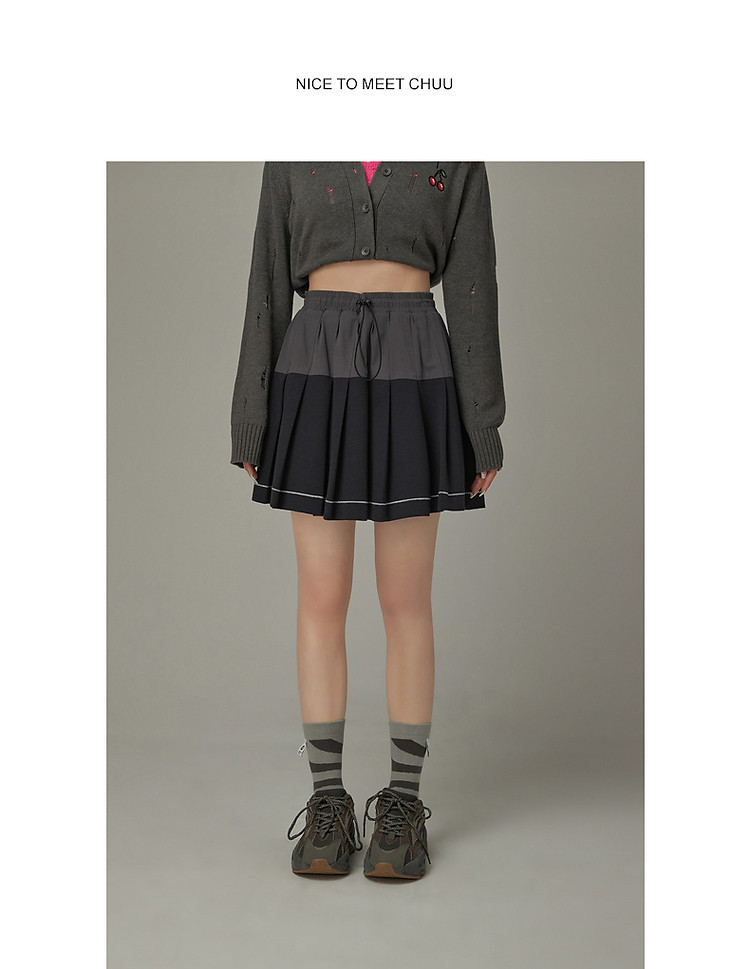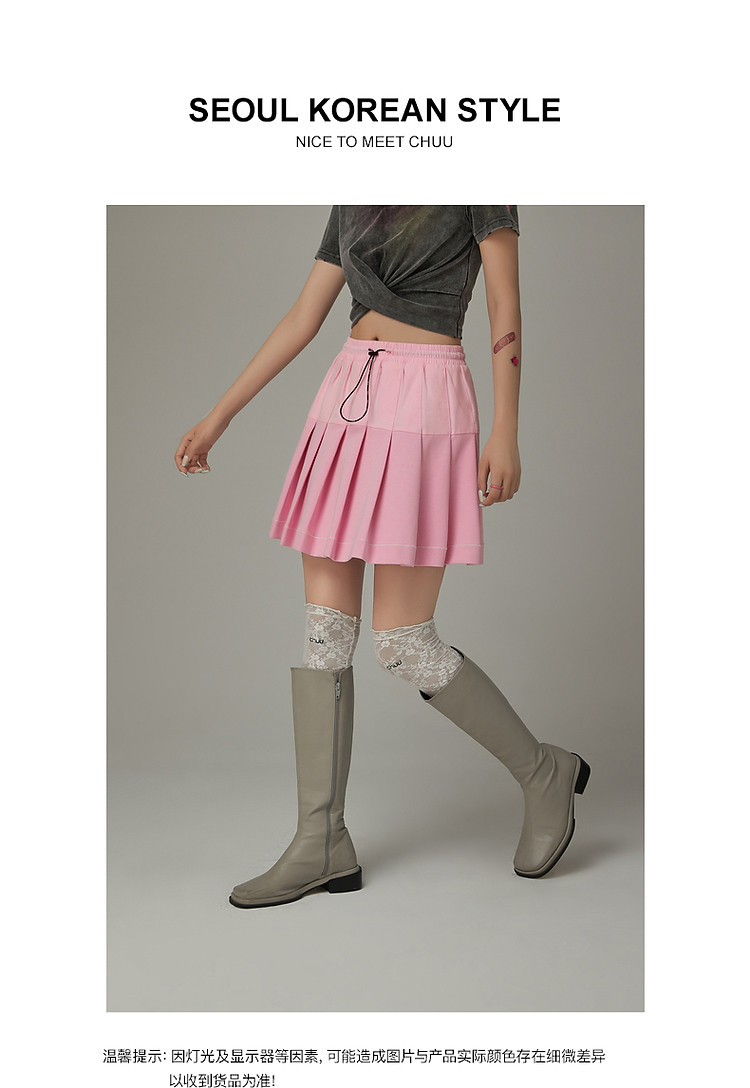 商品名称:百褶半身裙女春秋运动学院风抽绳松紧腰鸳鸯a字短裙 674835