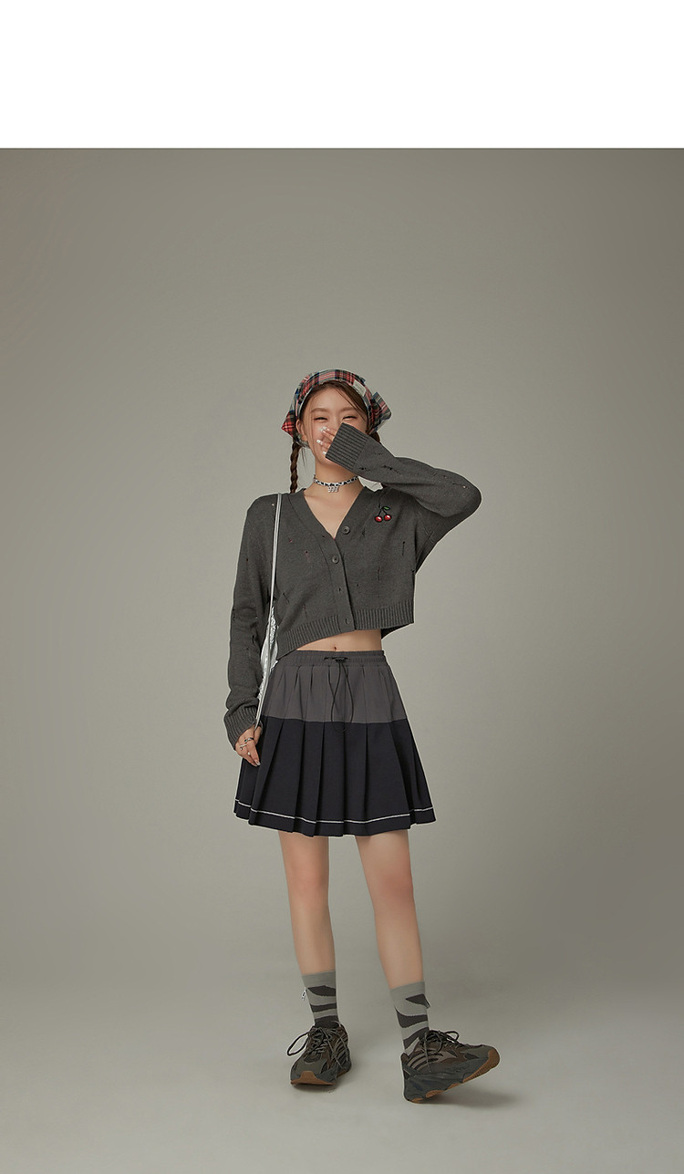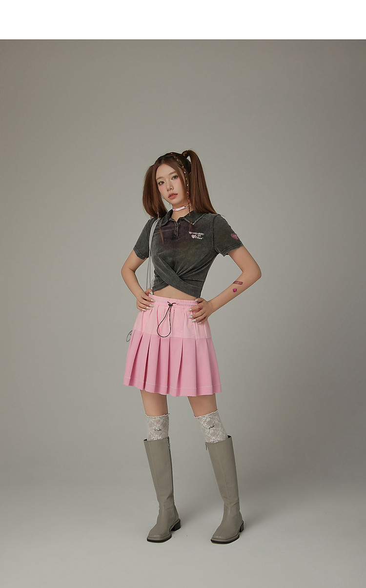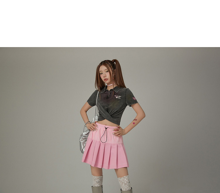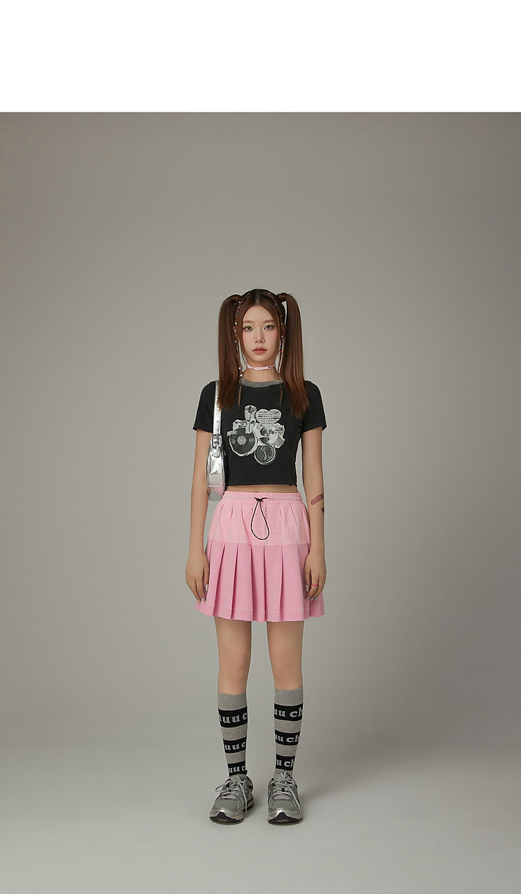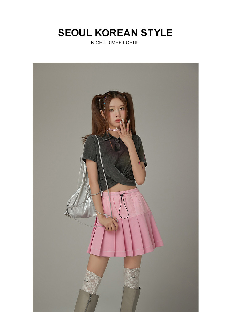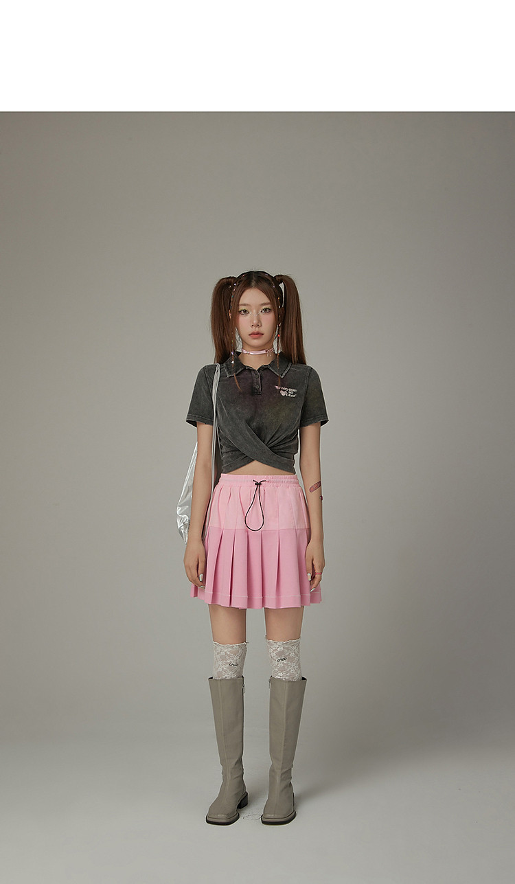 商品名称:百褶半身裙女春秋运动学院风抽绳松紧腰鸳鸯a字短裙 674835