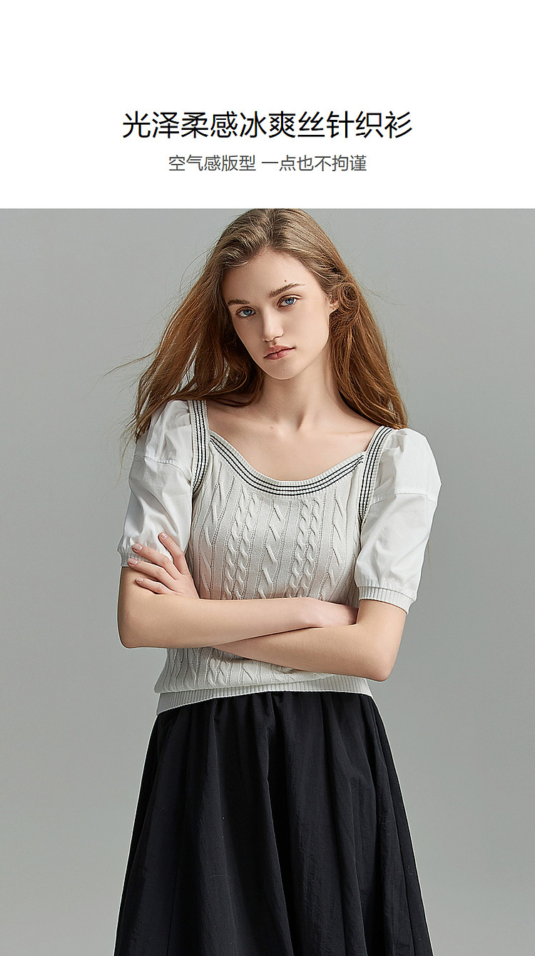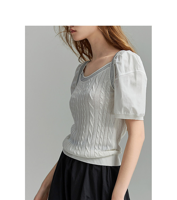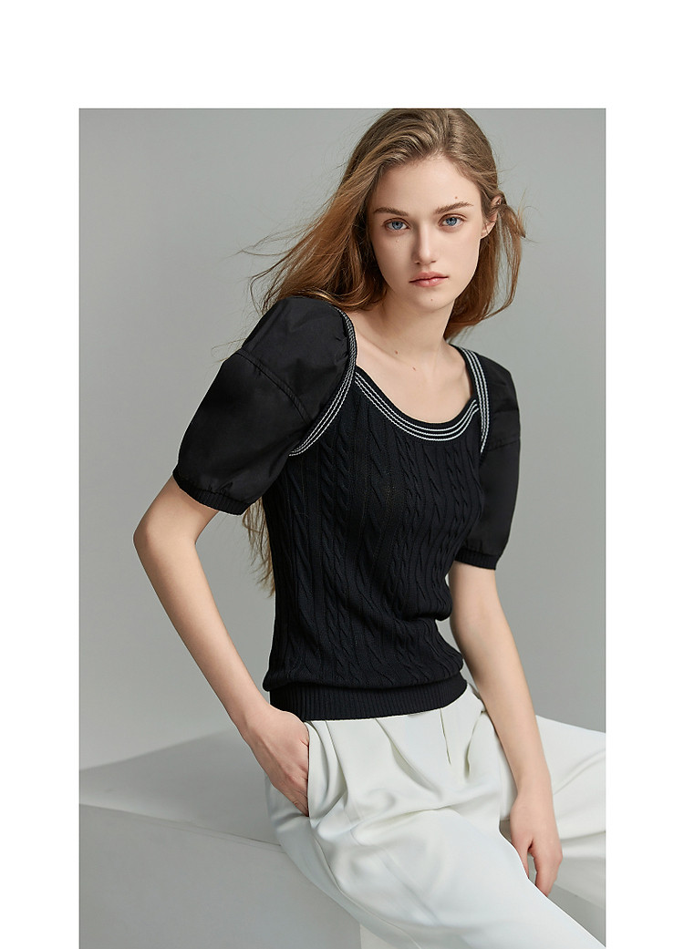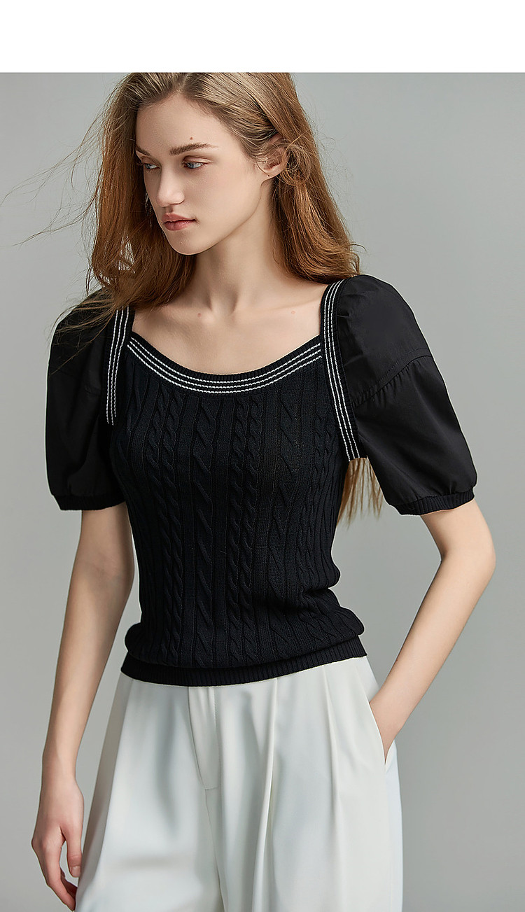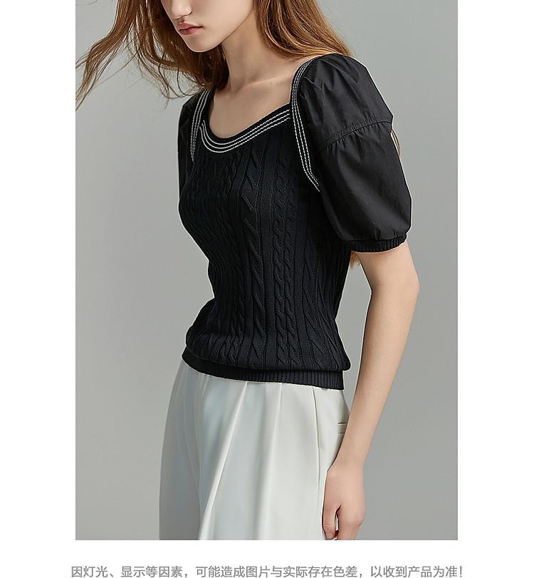 商品名称:【光泽柔感冰爽丝】夏方领短袖线衫拼接泡泡袖棉质针织衫女上衣 784193