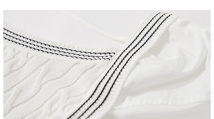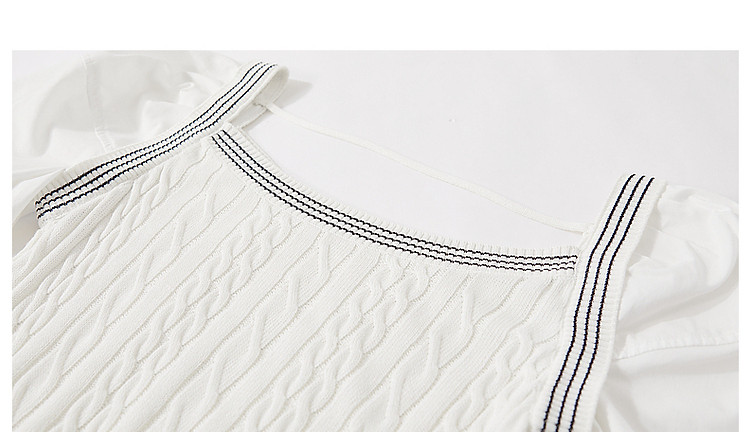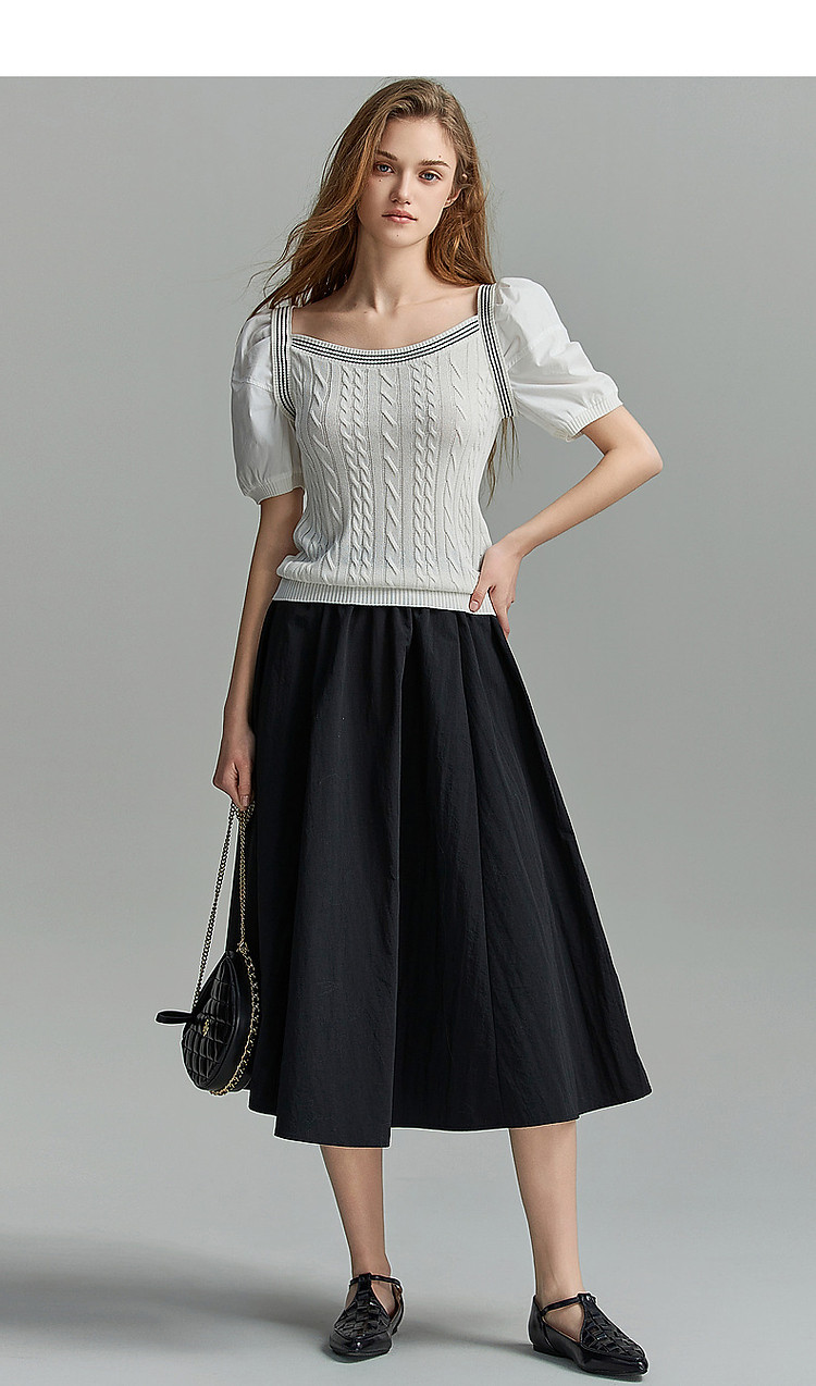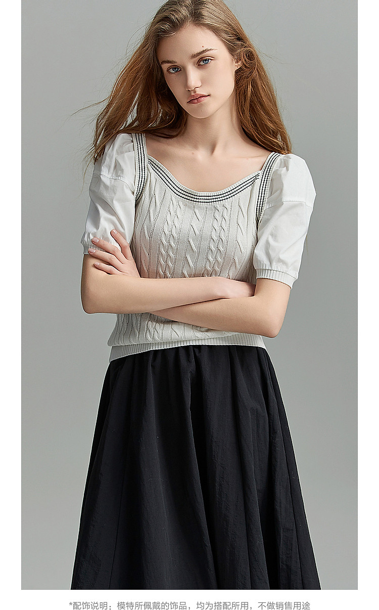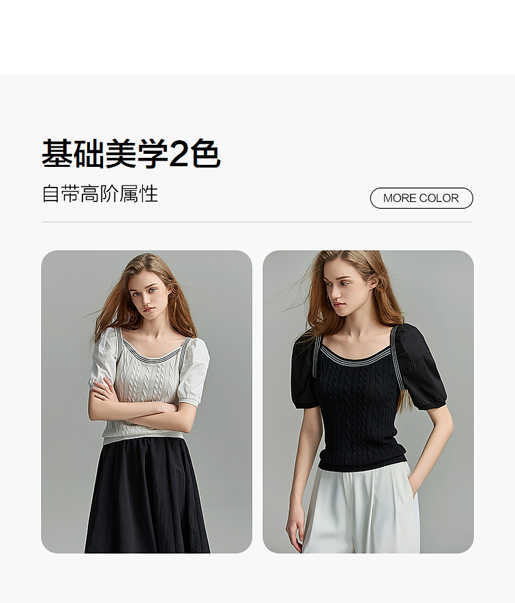 商品名称:【光泽柔感冰爽丝】夏方领短袖线衫拼接泡泡袖棉质针织衫女上衣 784193