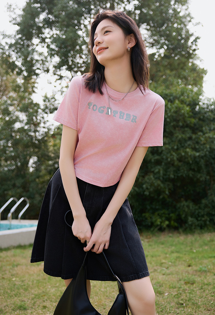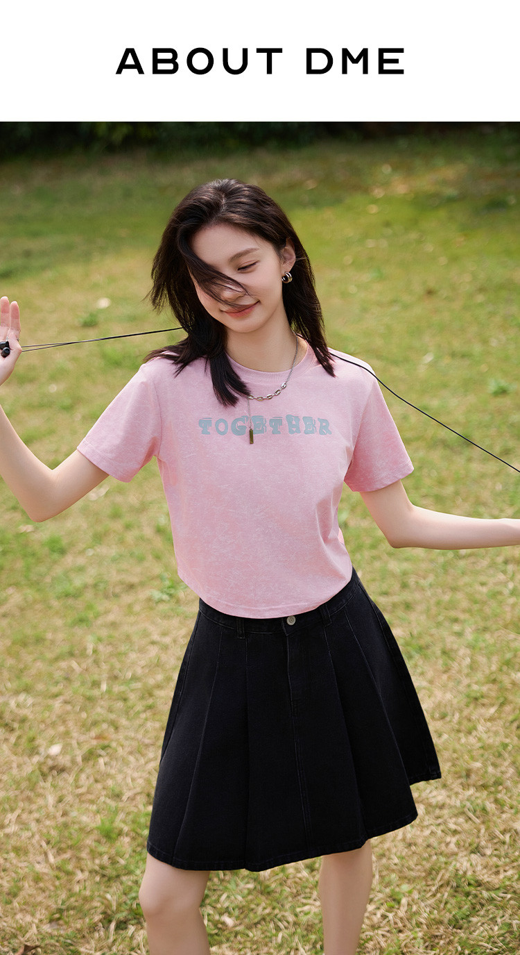 【草莓牛乳字母印花T恤】夏款少女圆领不规则下摆短袖女 046978