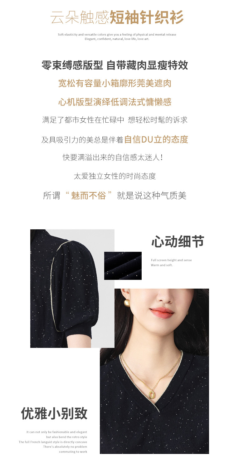 商品名称:夏轻薄透气含绵羊毛泡泡袖V领短袖T恤针织打底衫女 200211