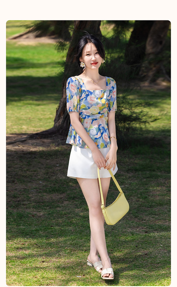 商品名称:【莫奈花园】夏法式复古方领衬衫元气印花泡泡袖遮肉衬衣女装上衣 545793
