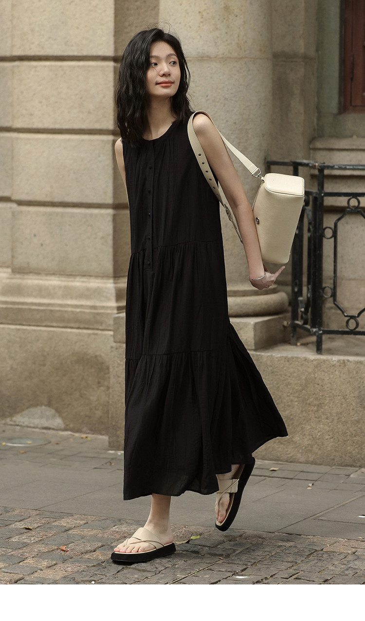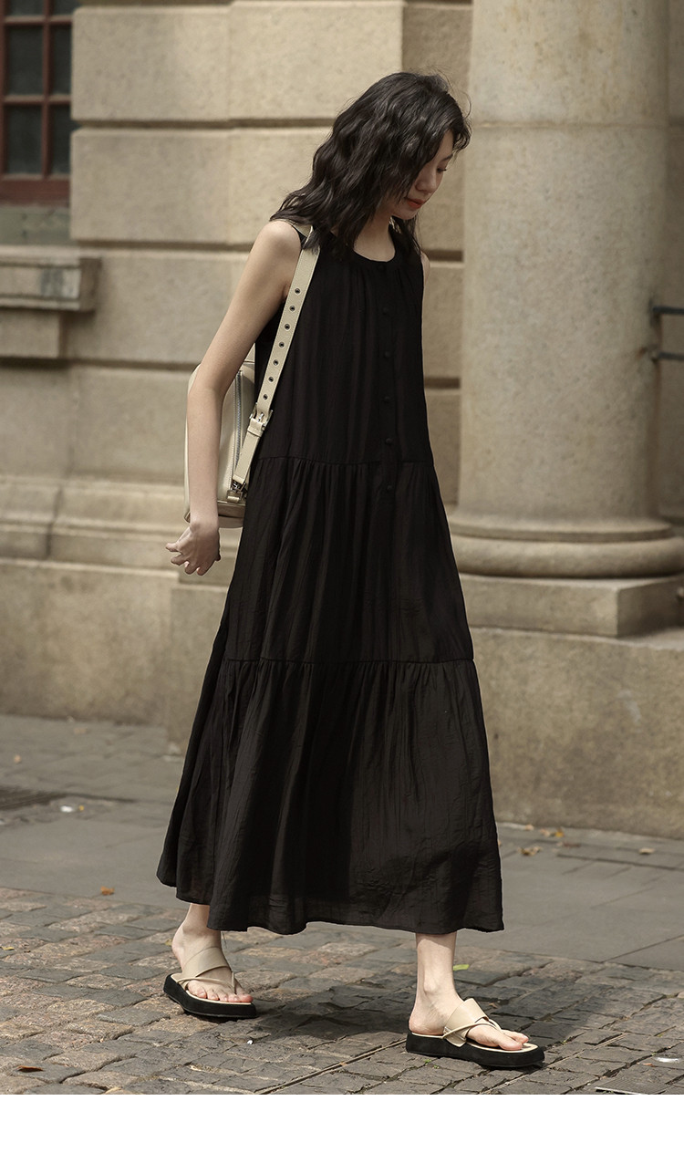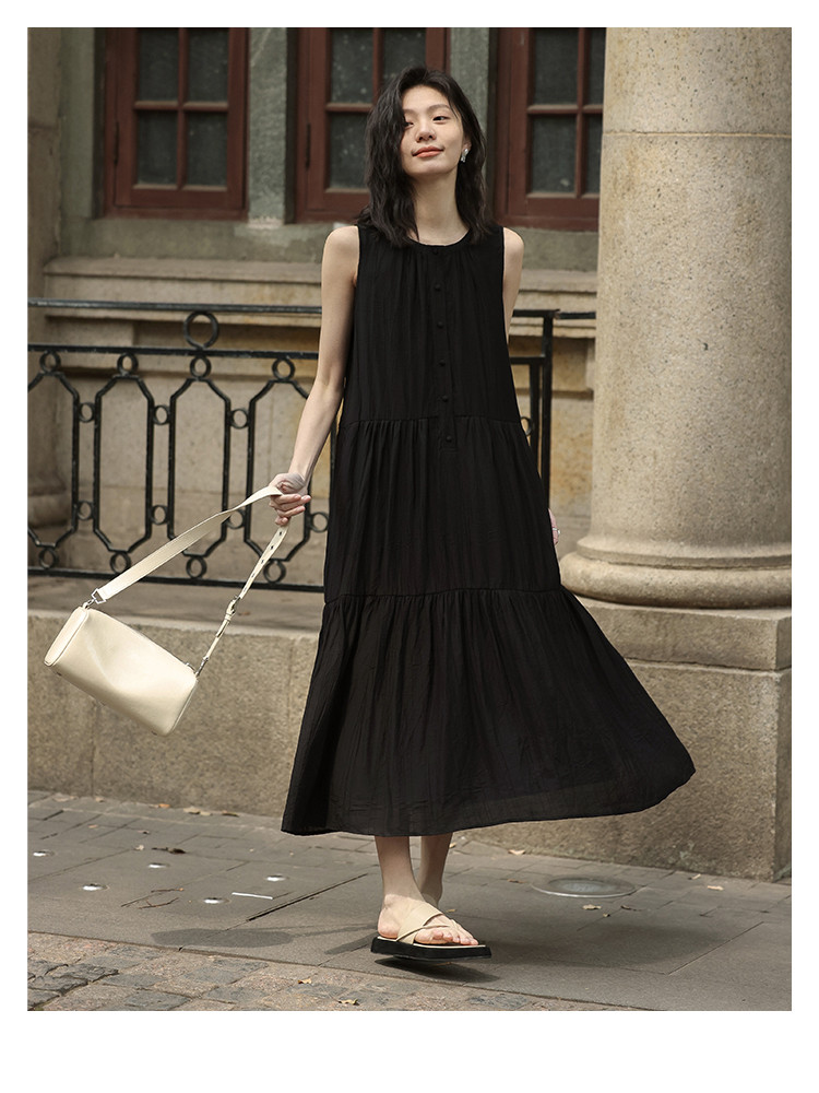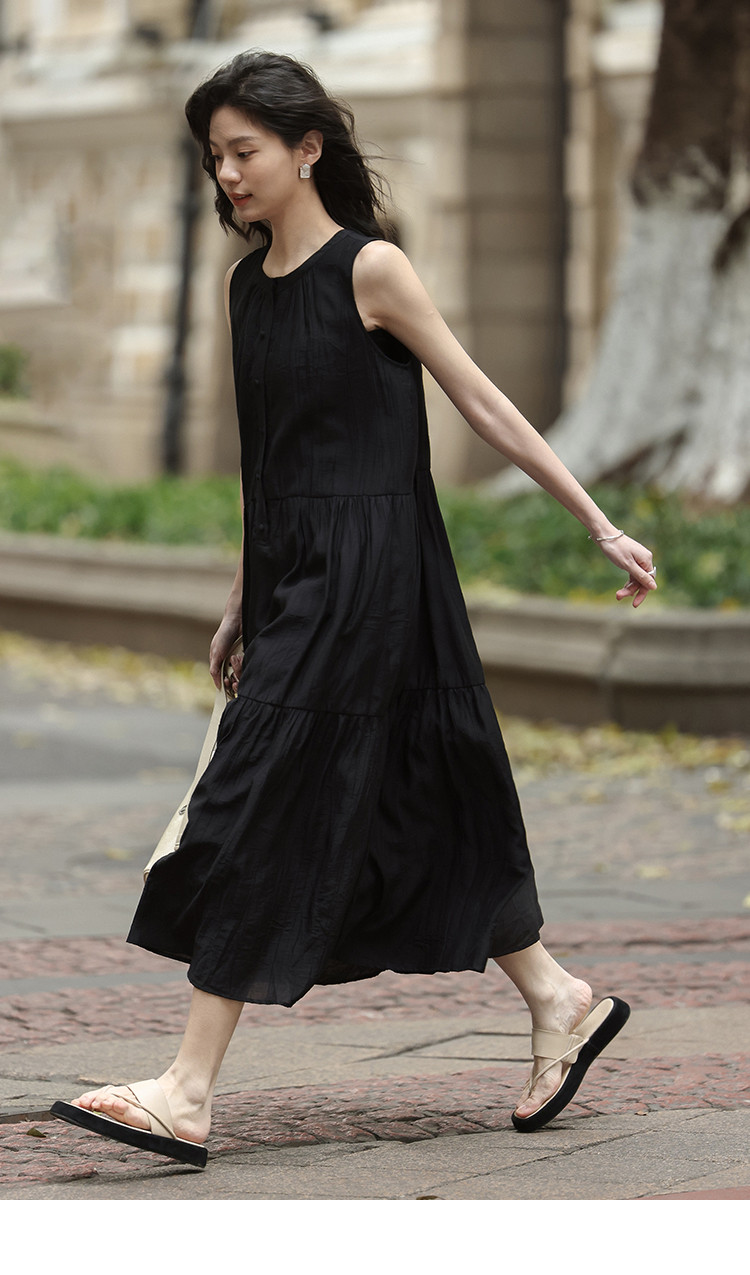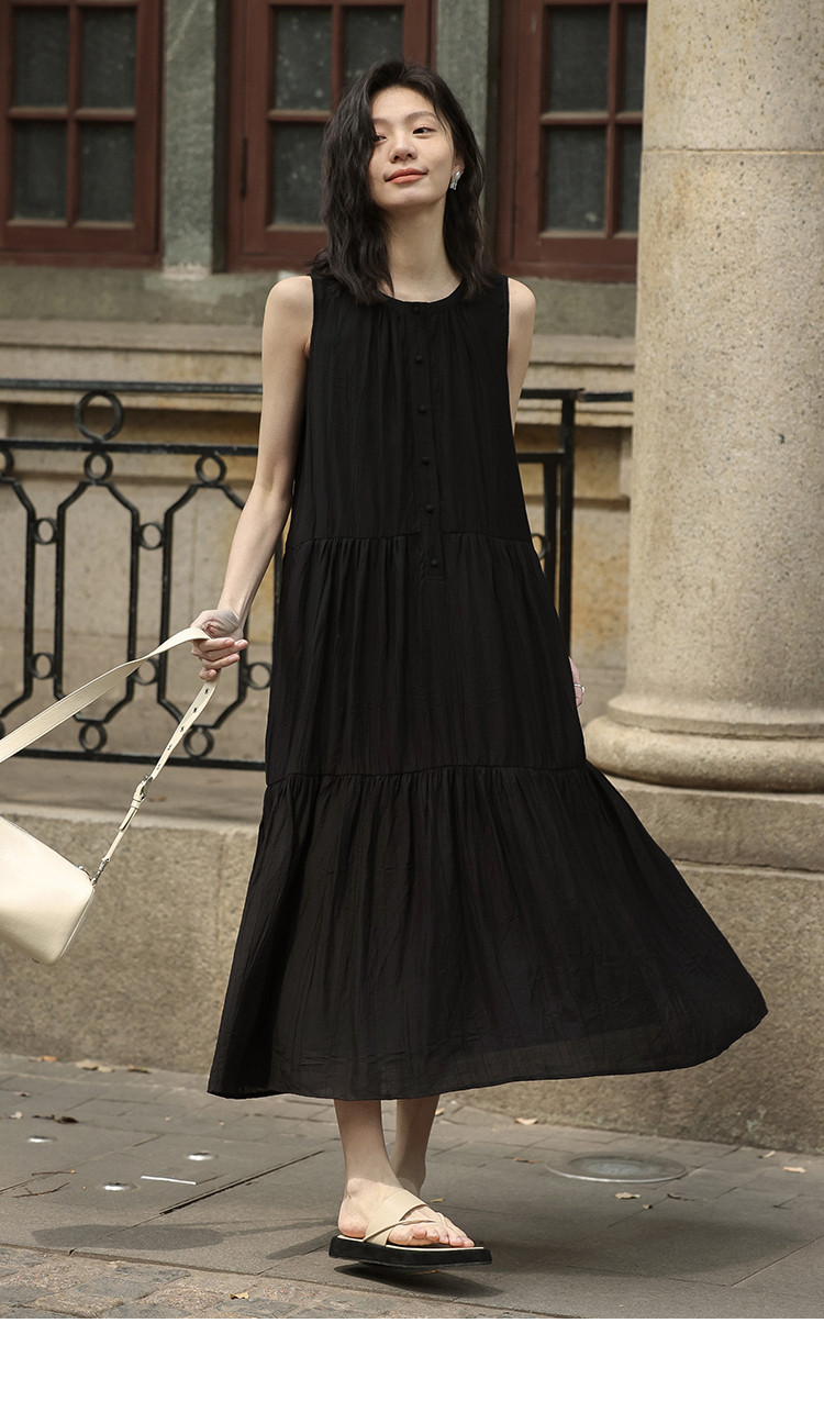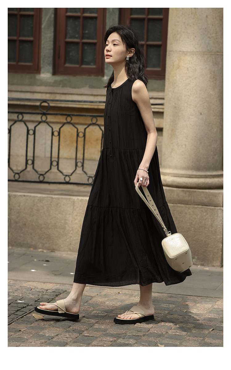 【舒适简约小黑裙】夏款圆领半门襟无袖侧口袋长款连衣裙 063362
