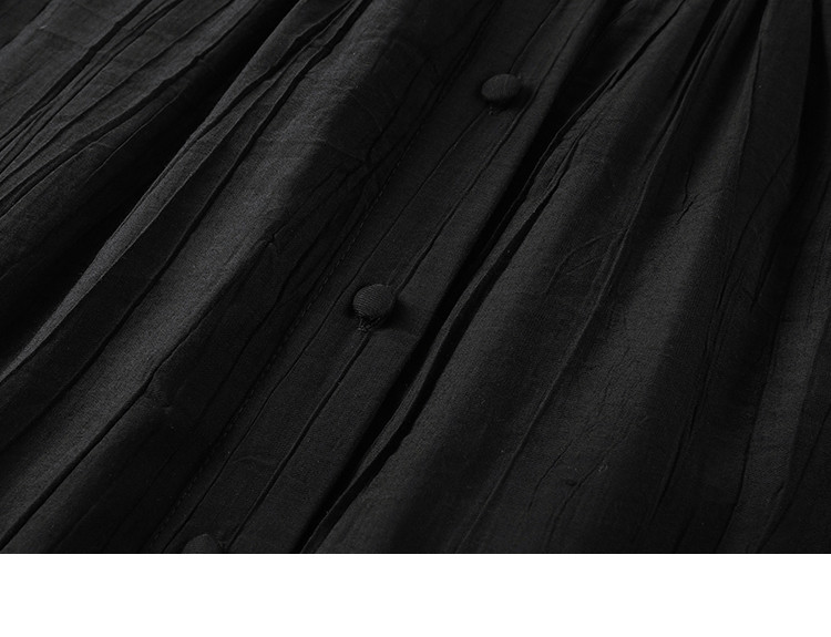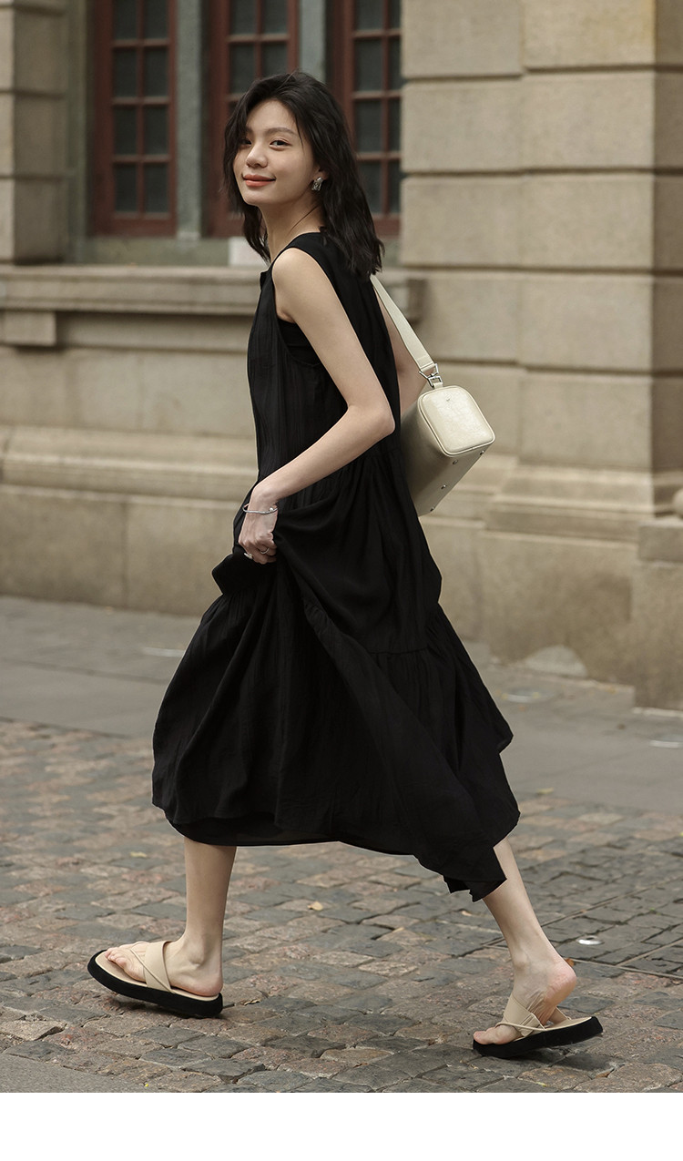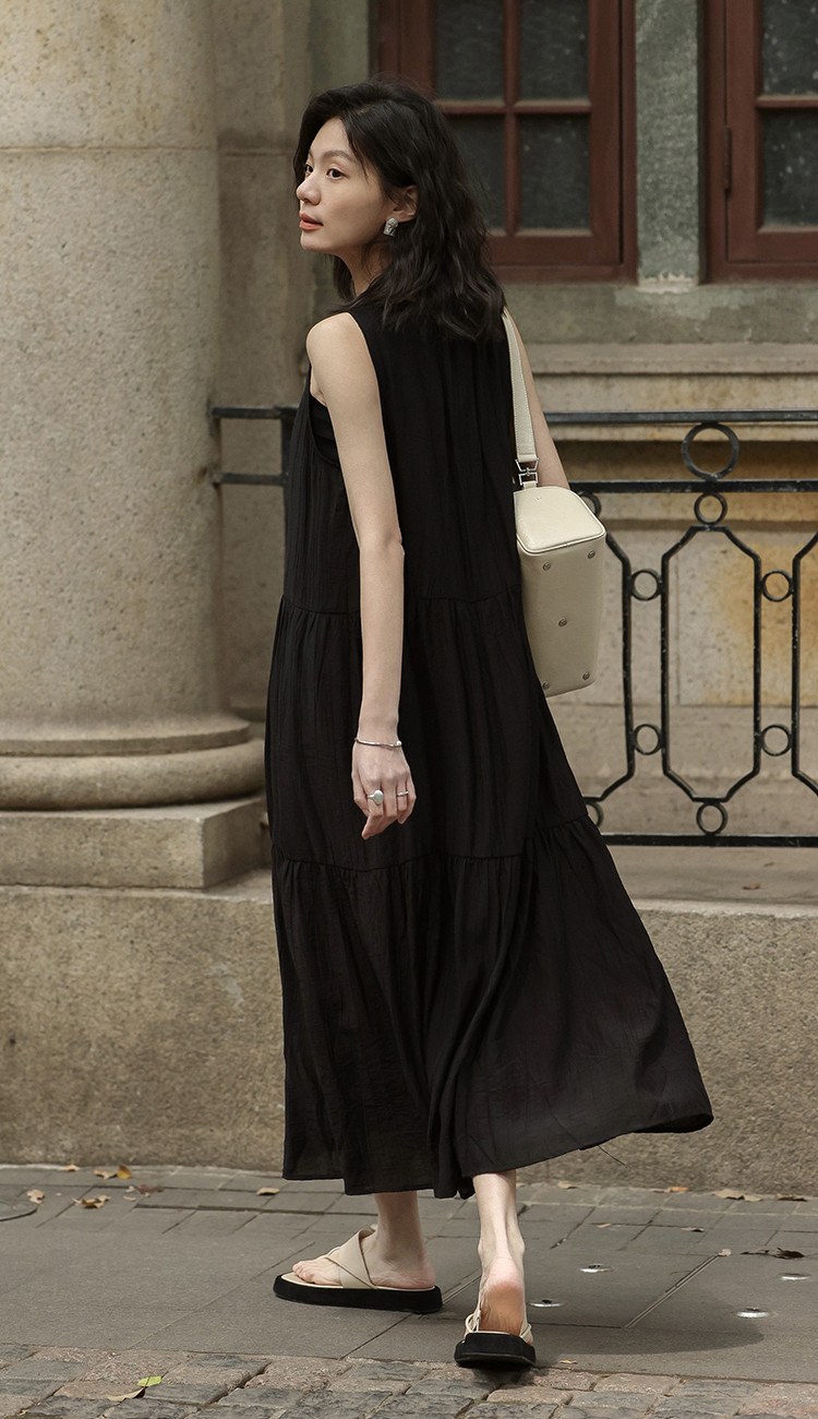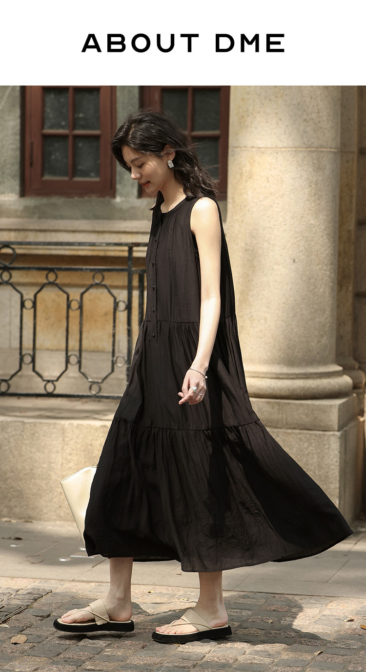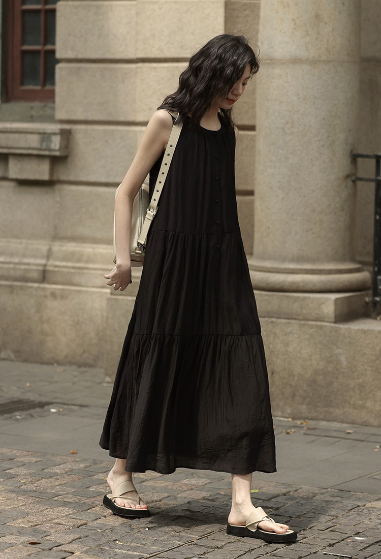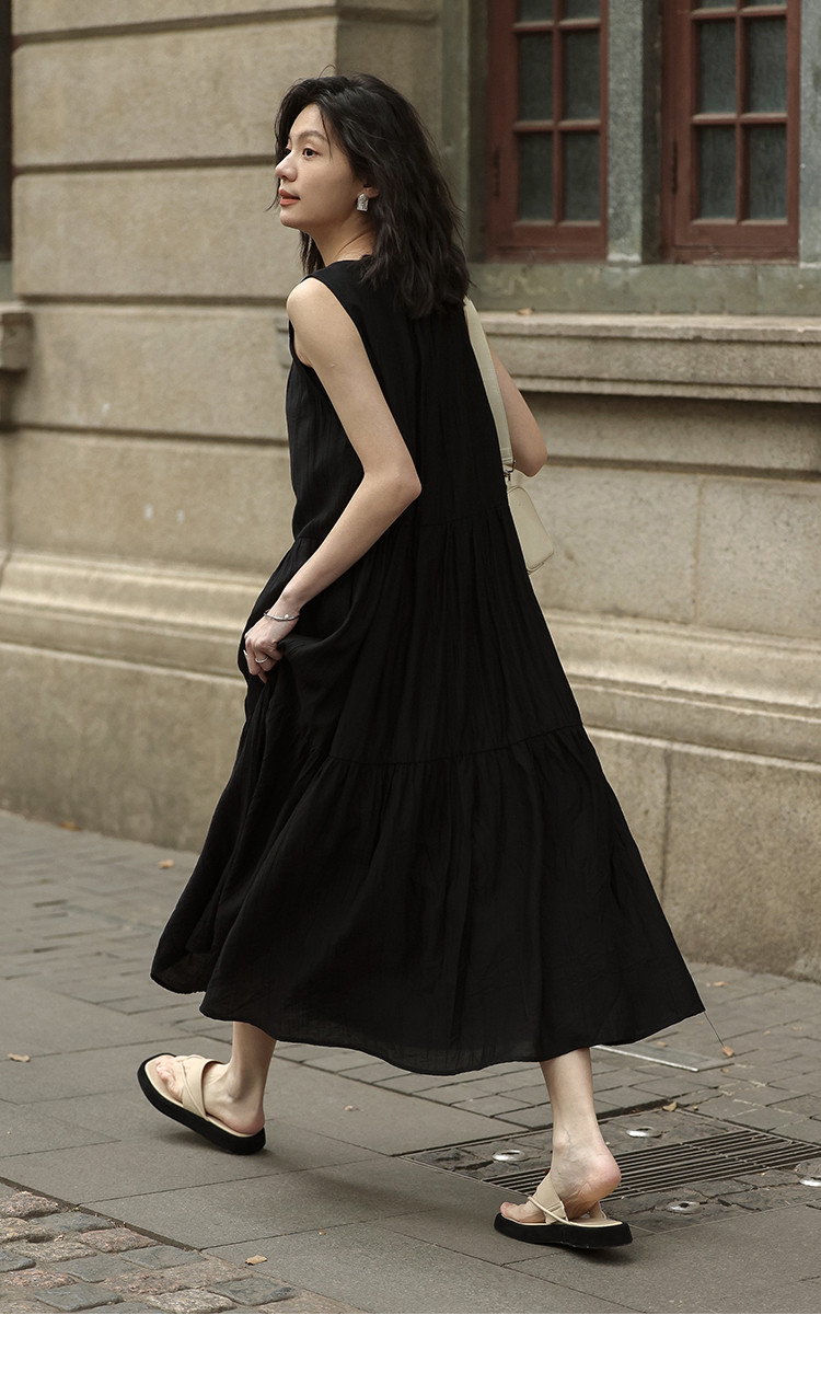 【舒适简约小黑裙】夏款圆领半门襟无袖侧口袋长款连衣裙 063362