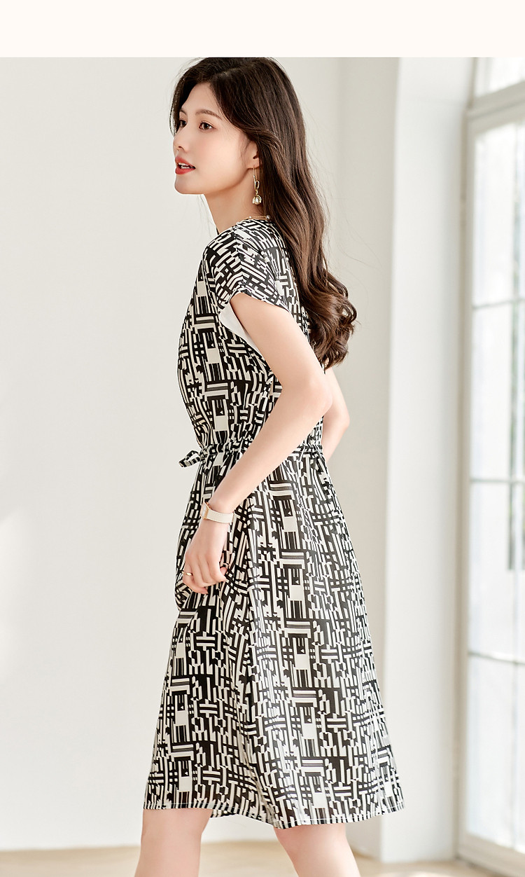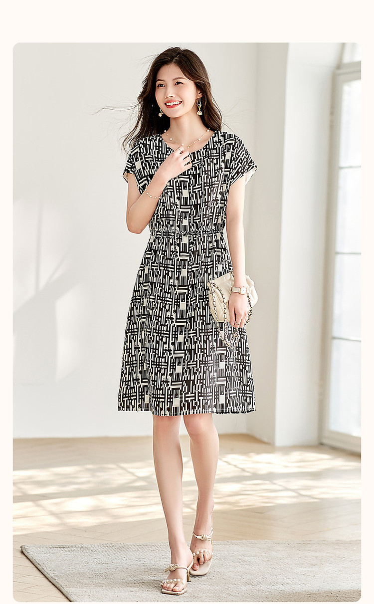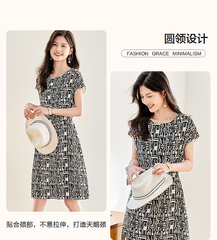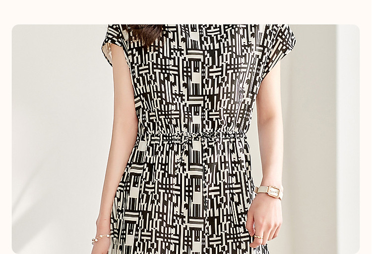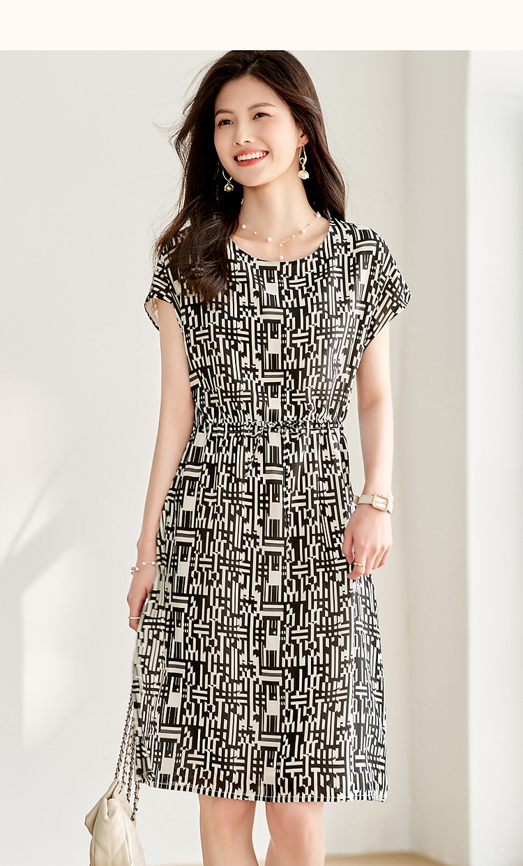 商品名称:【轻奢度假】夏圆领桑蚕丝调节腰无袖抽绳印花复古连衣裙 620097