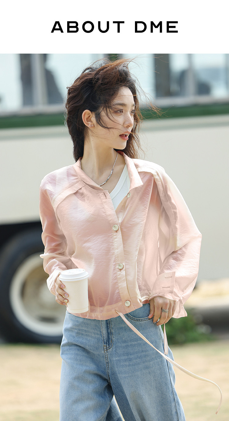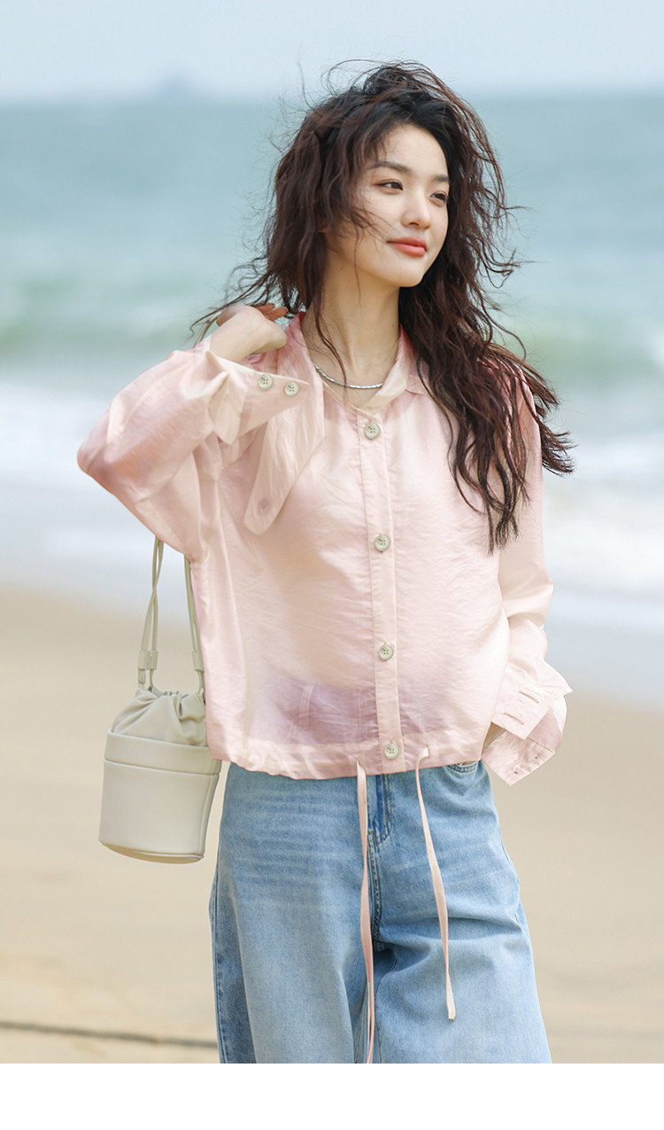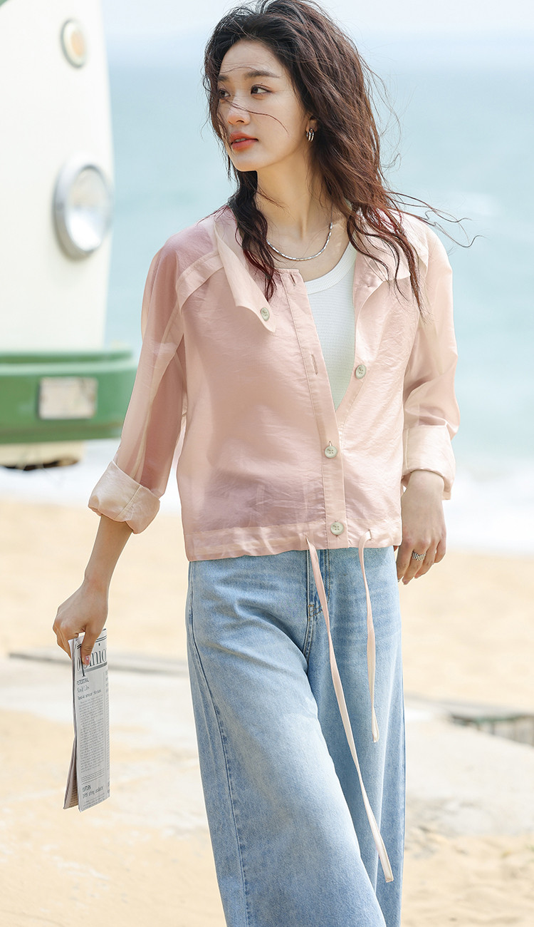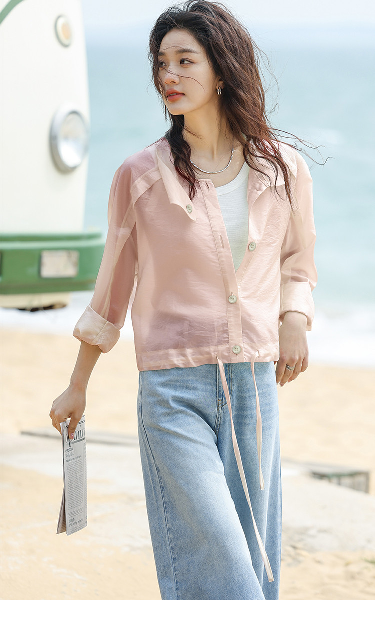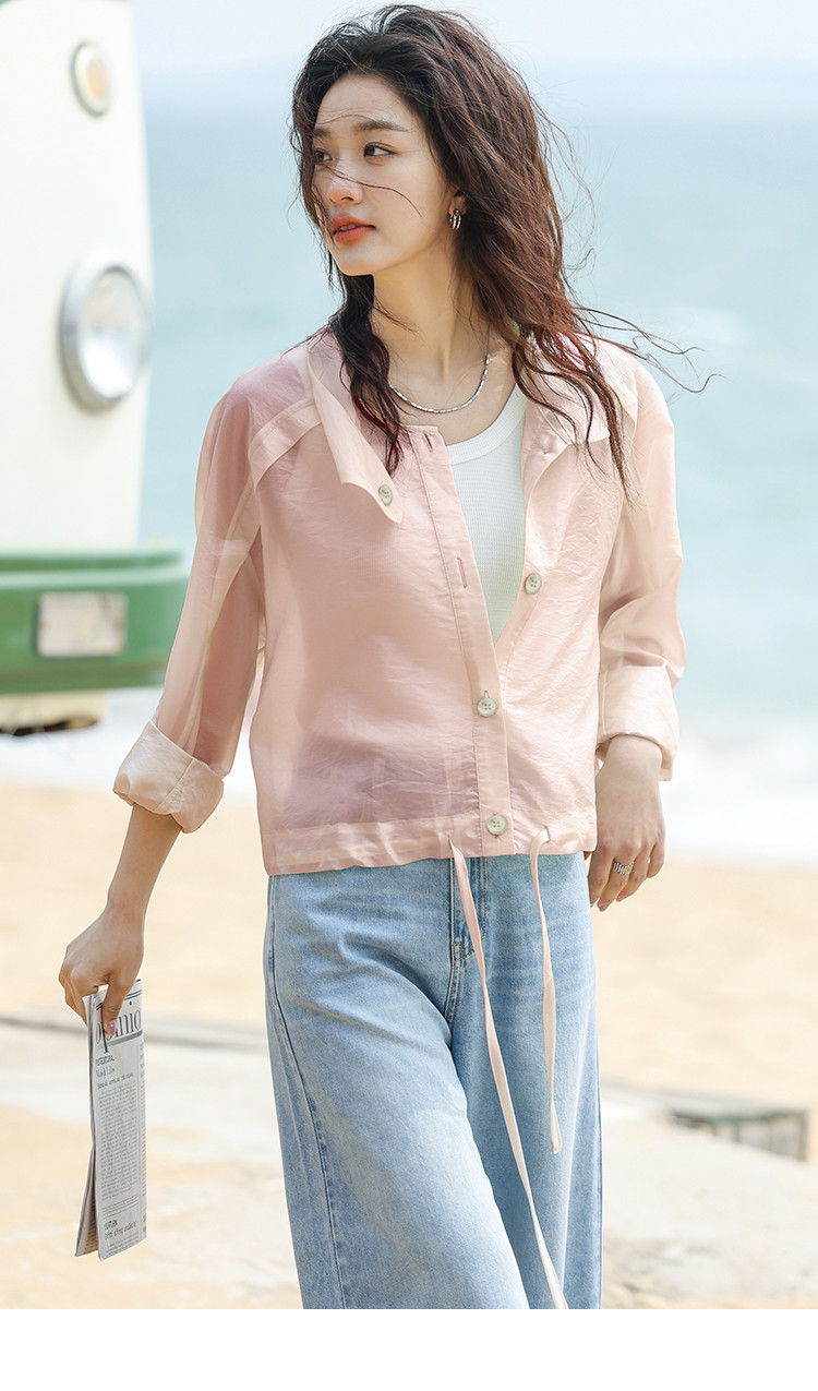 【淡粉色夏日清凉上衣】夏款清透感撞色扣下摆抽绳外套女 543618