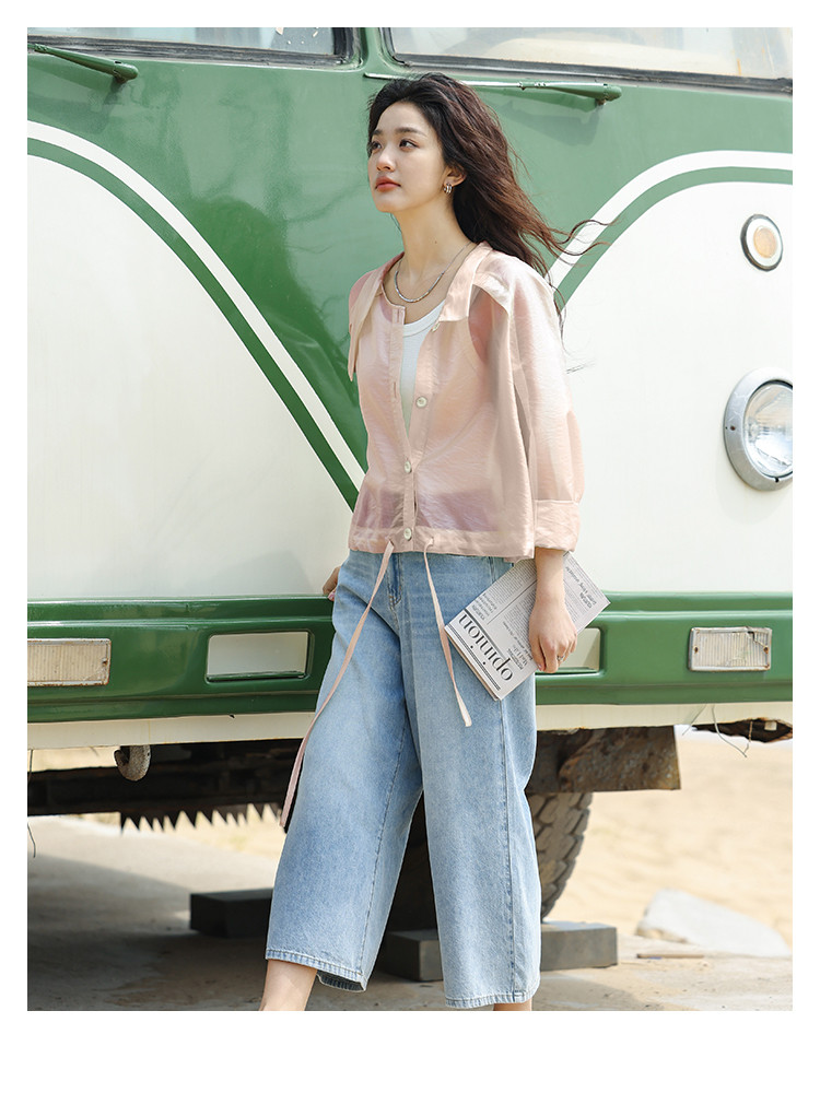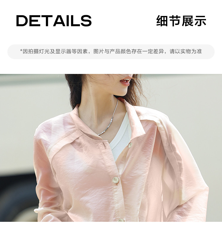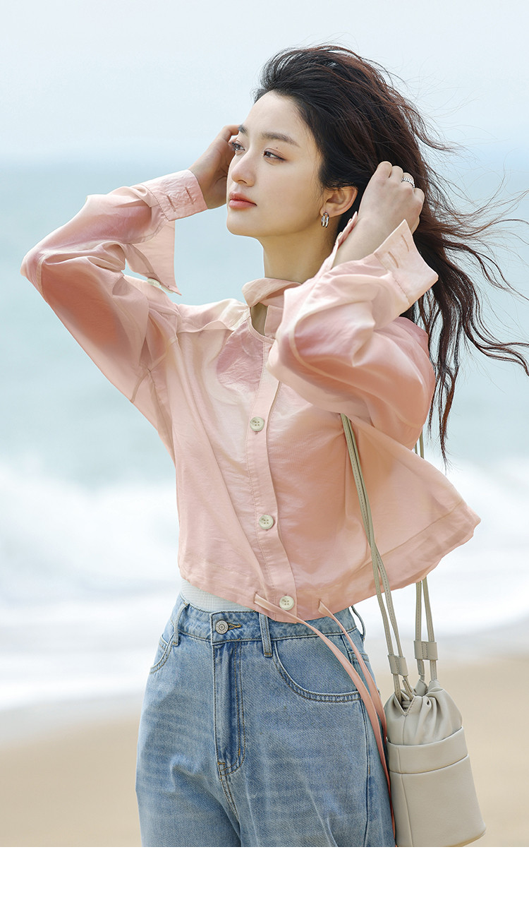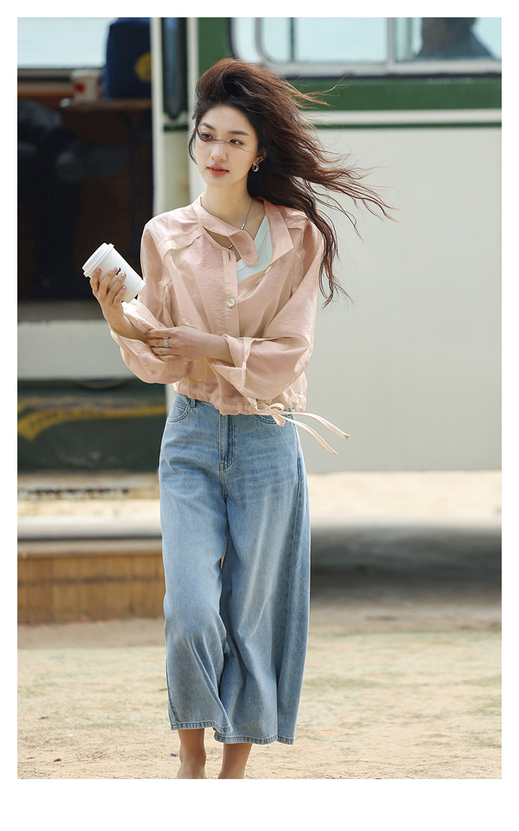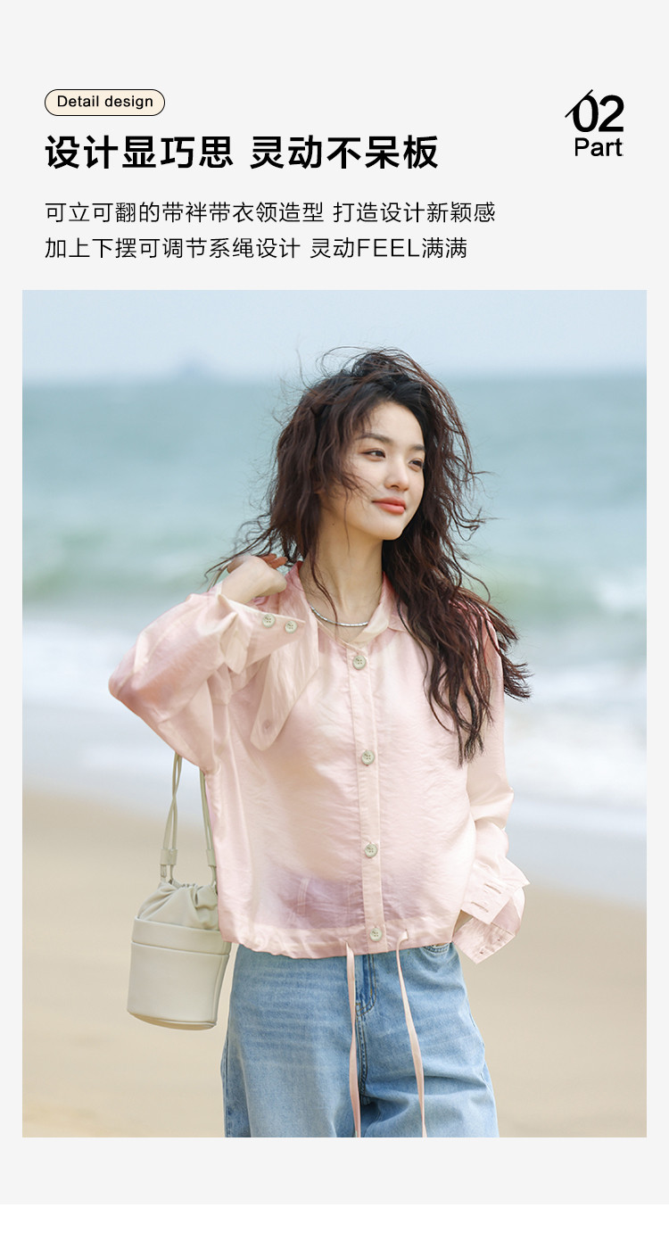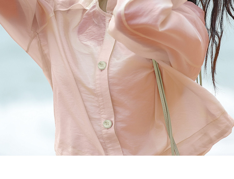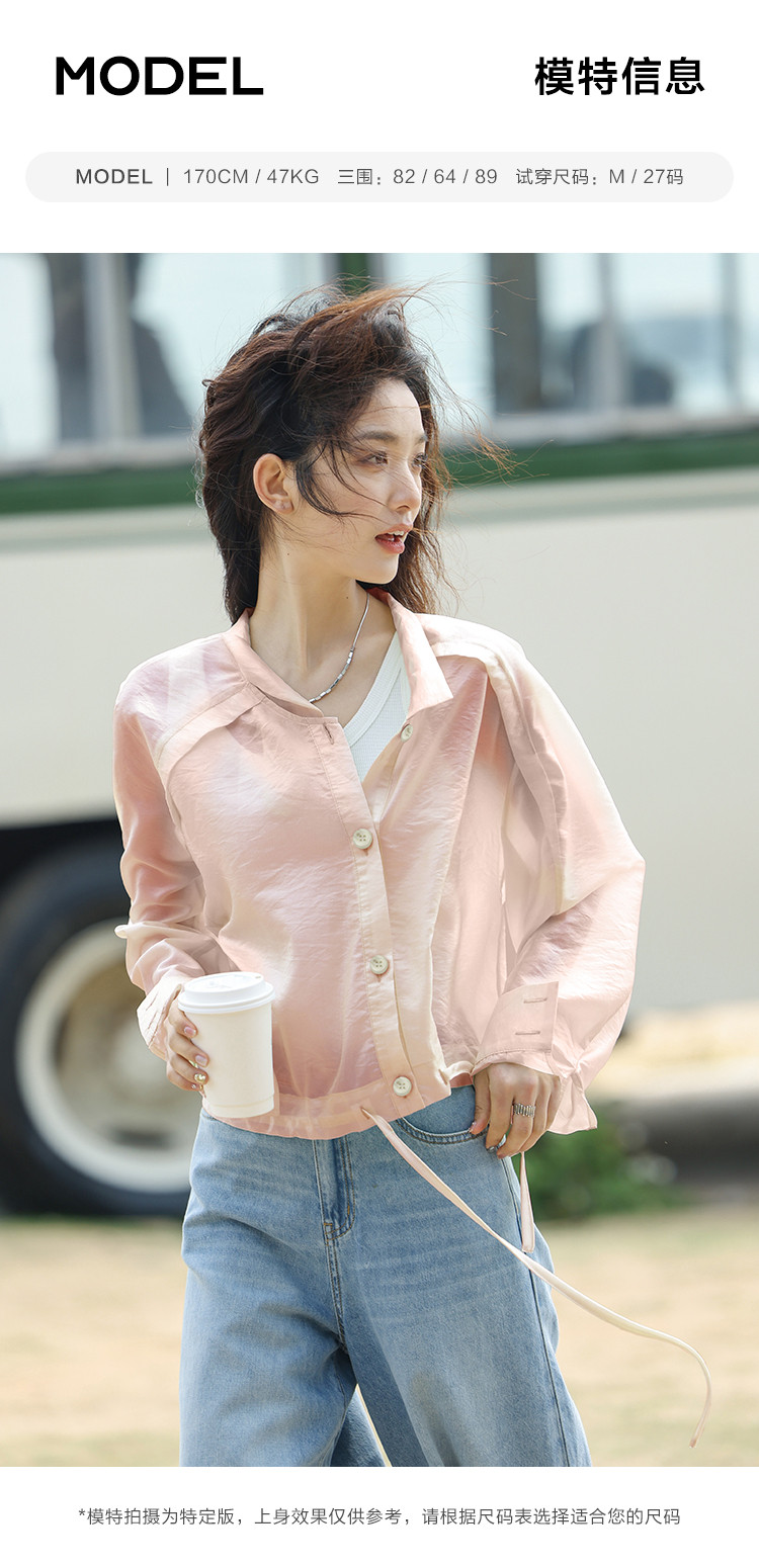 【淡粉色夏日清凉上衣】夏款清透感撞色扣下摆抽绳外套女 543618