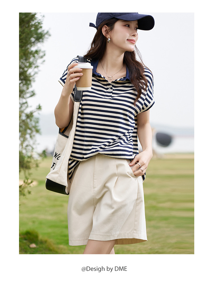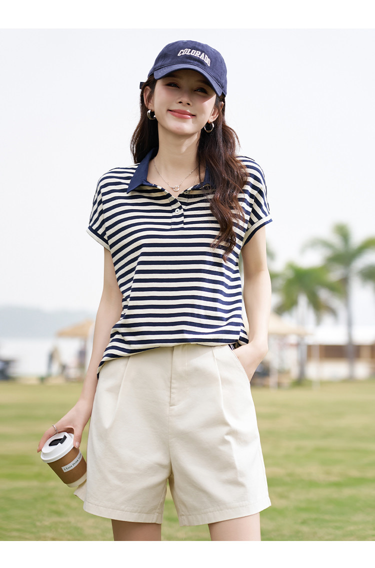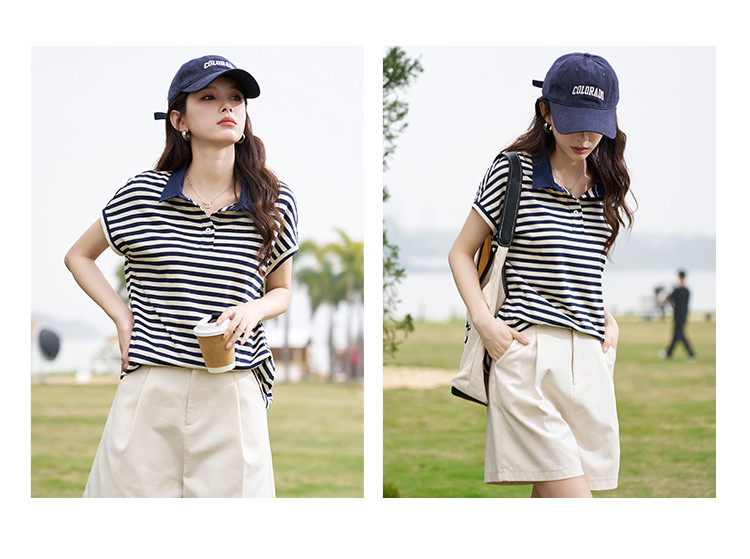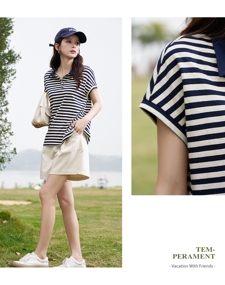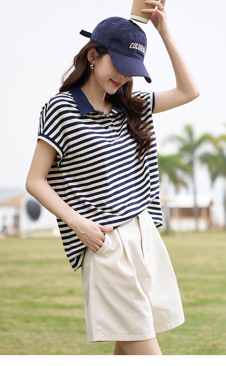 【文艺小翻领T恤】夏季透气显瘦条纹POLO衫宽松纯棉短袖女 783745
