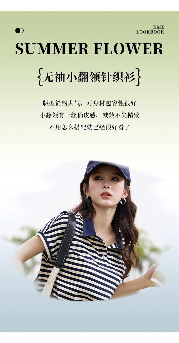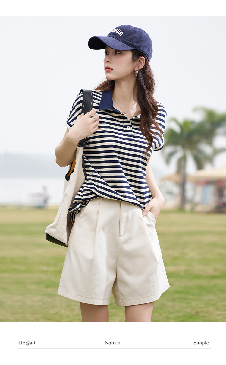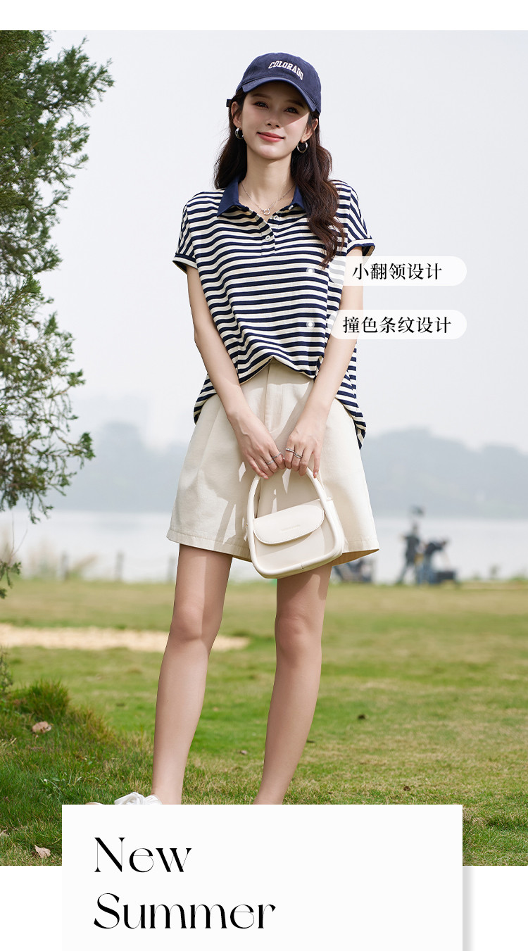 【文艺小翻领T恤】夏季透气显瘦条纹POLO衫宽松纯棉短袖女 783745