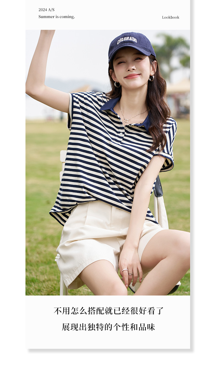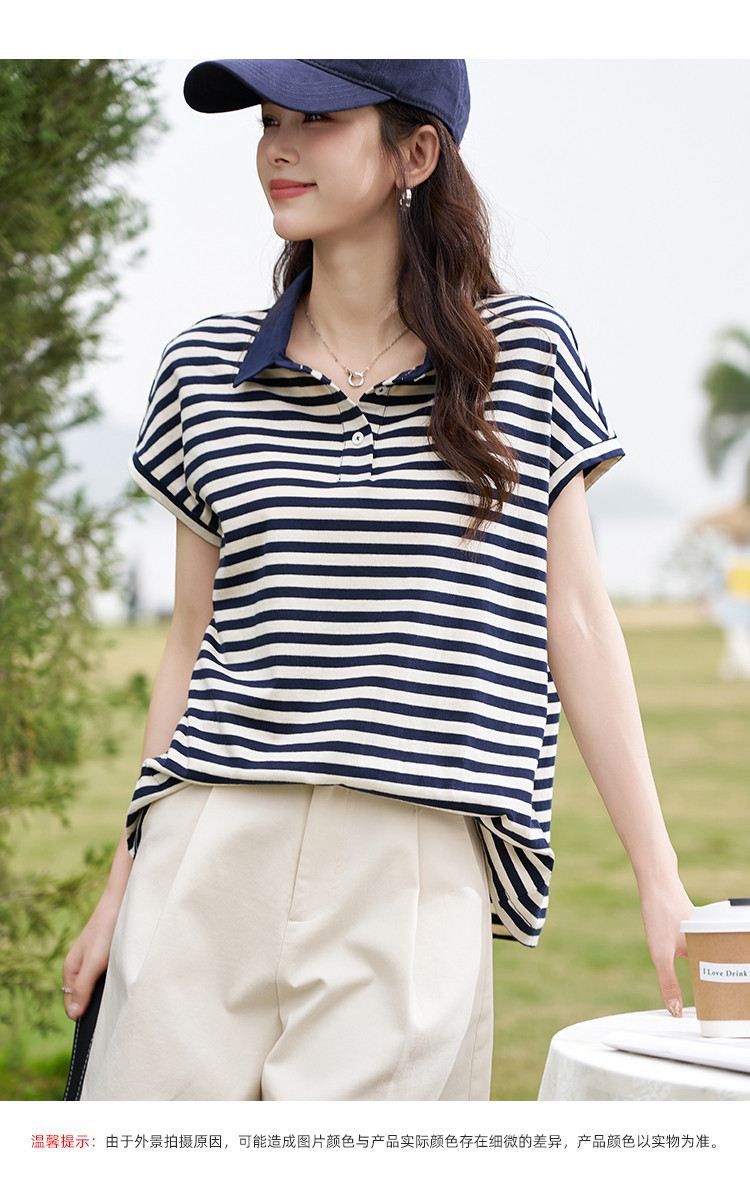 商品名称:【文艺小翻领T恤】夏季透气显瘦条纹POLO衫宽松纯棉短袖女 783745