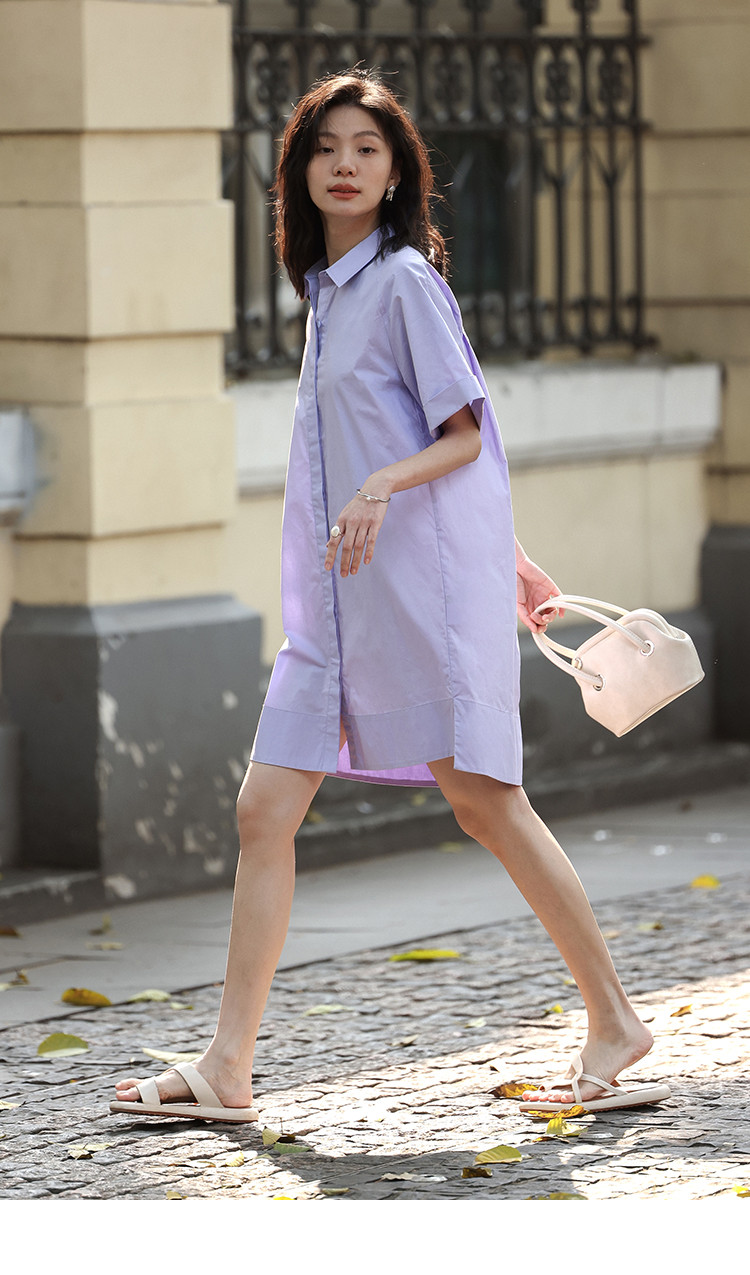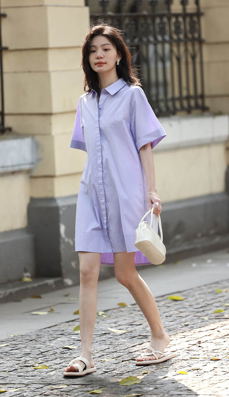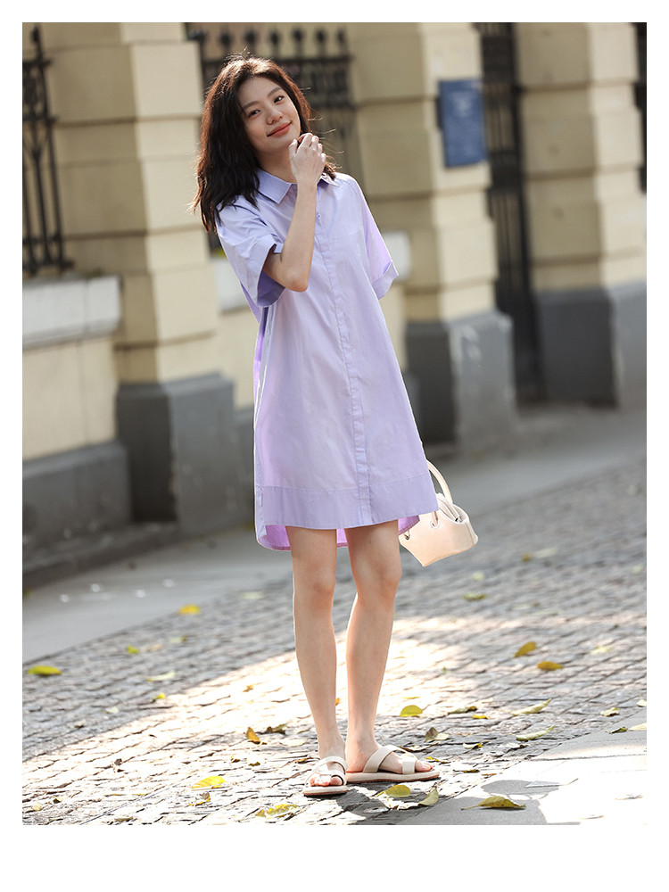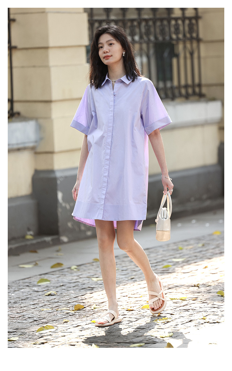 商品名称:【温柔浅紫翻领衬衫裙】夏翻边袖下摆开叉短款连衣裙 108418