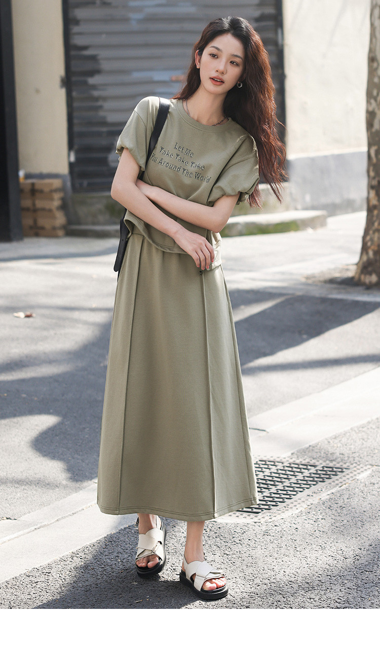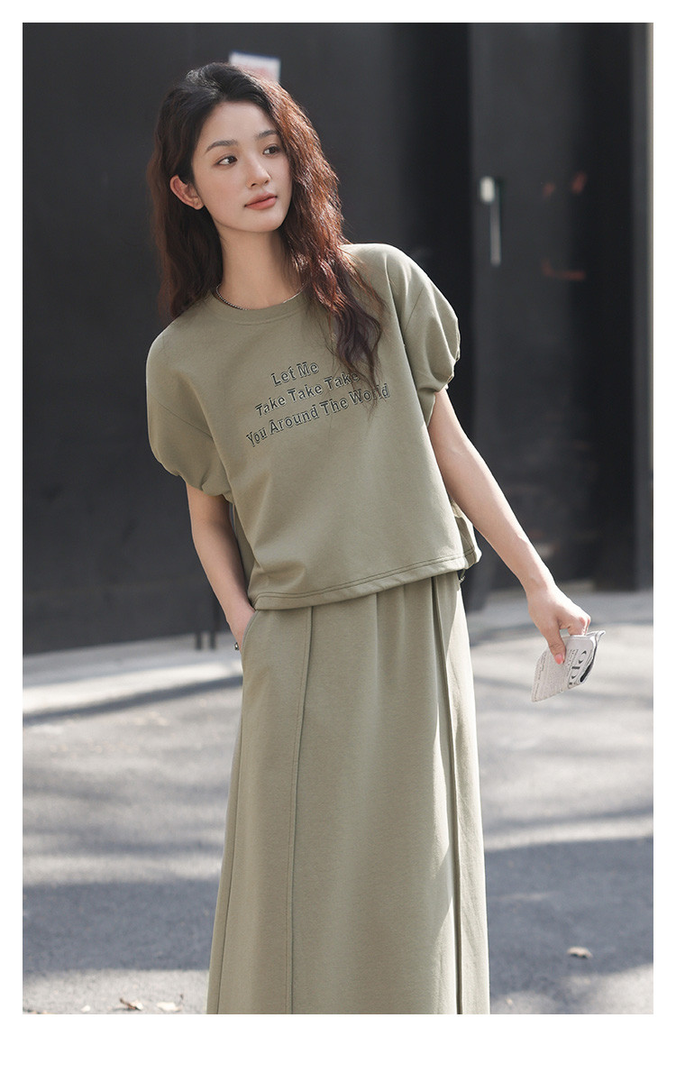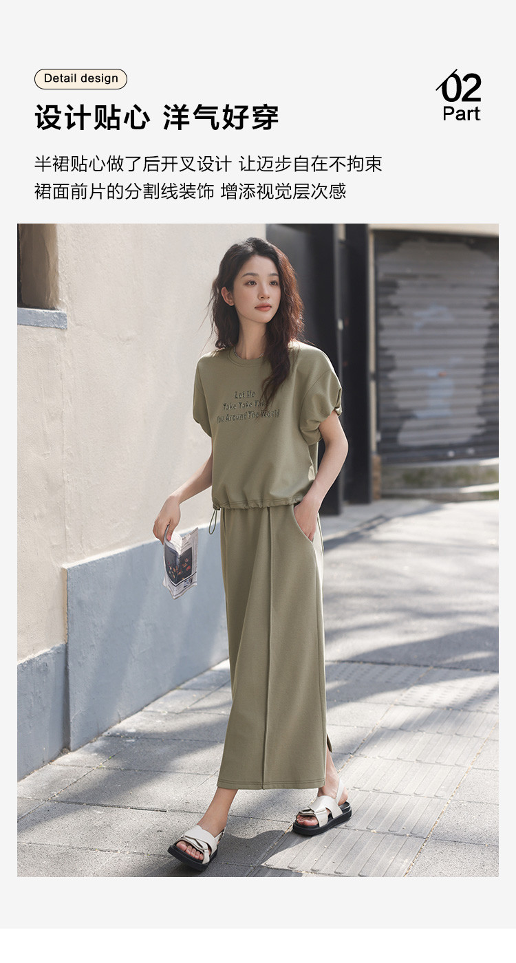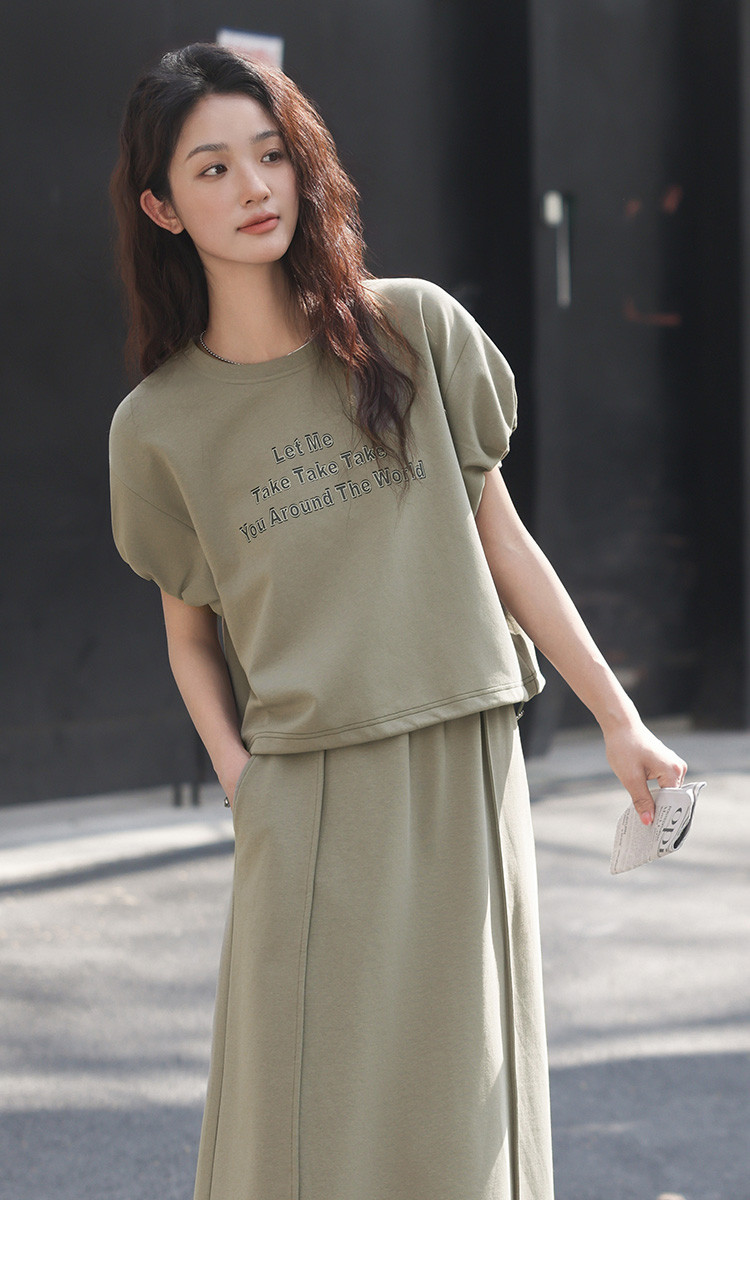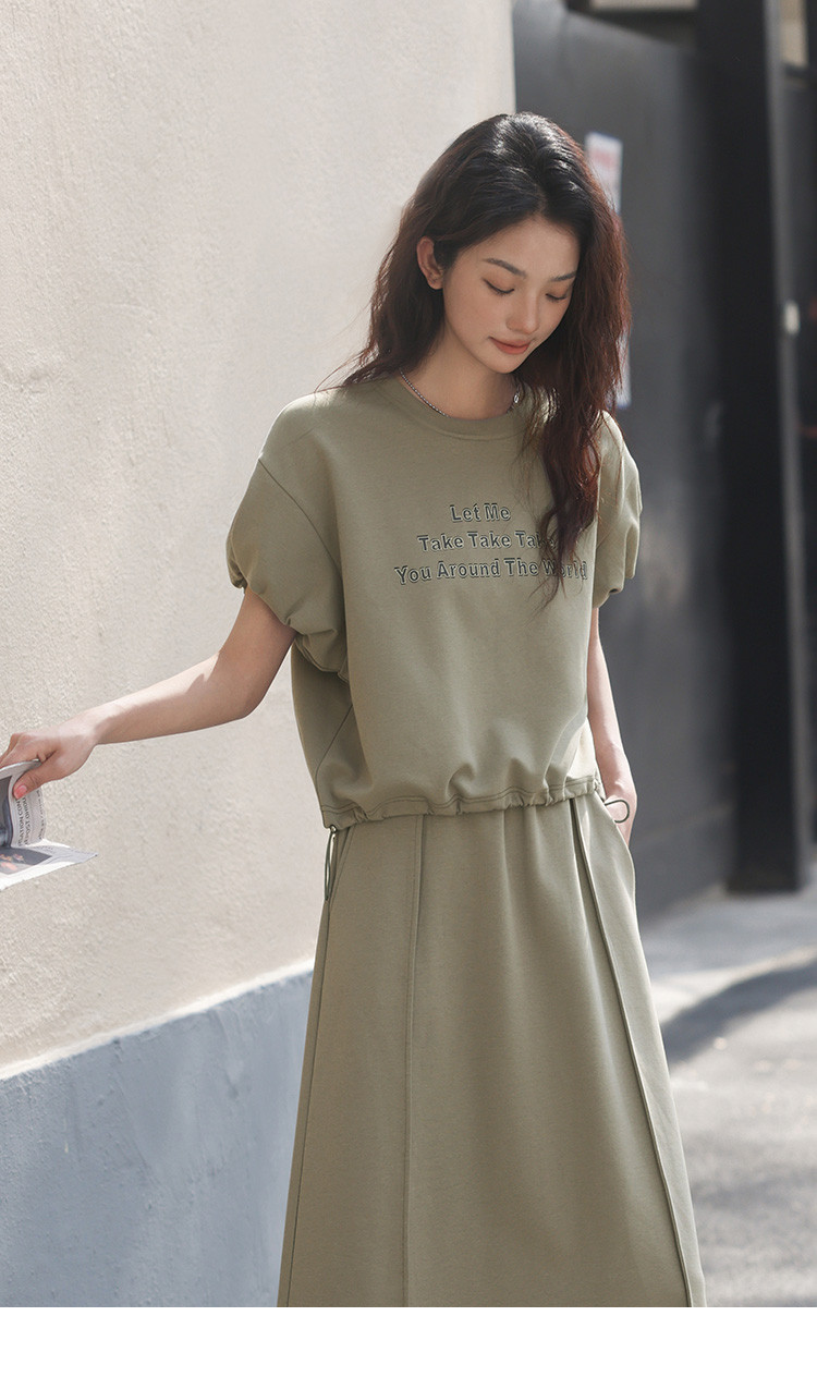 【休闲风套装】夏款字母泡泡袖抽绳+松紧腰后开衩半裙 882242