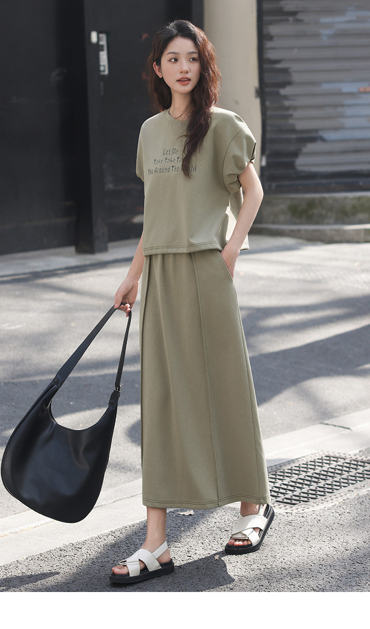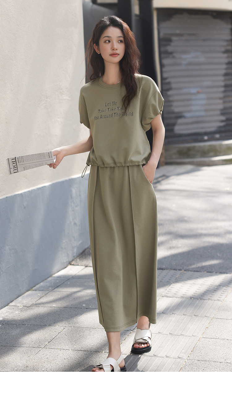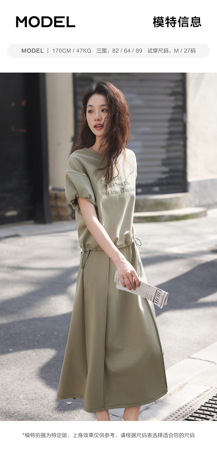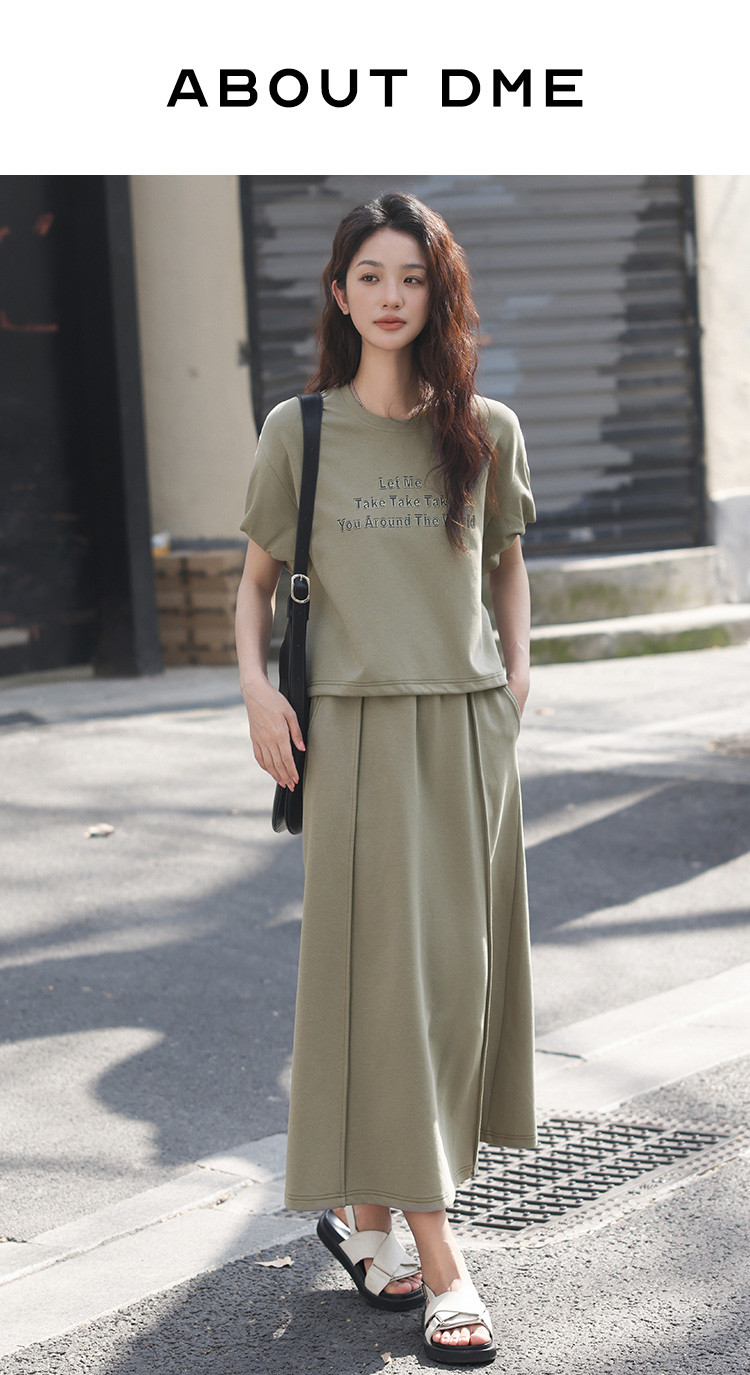 【休闲风套装】夏款字母泡泡袖抽绳+松紧腰后开衩半裙 882242