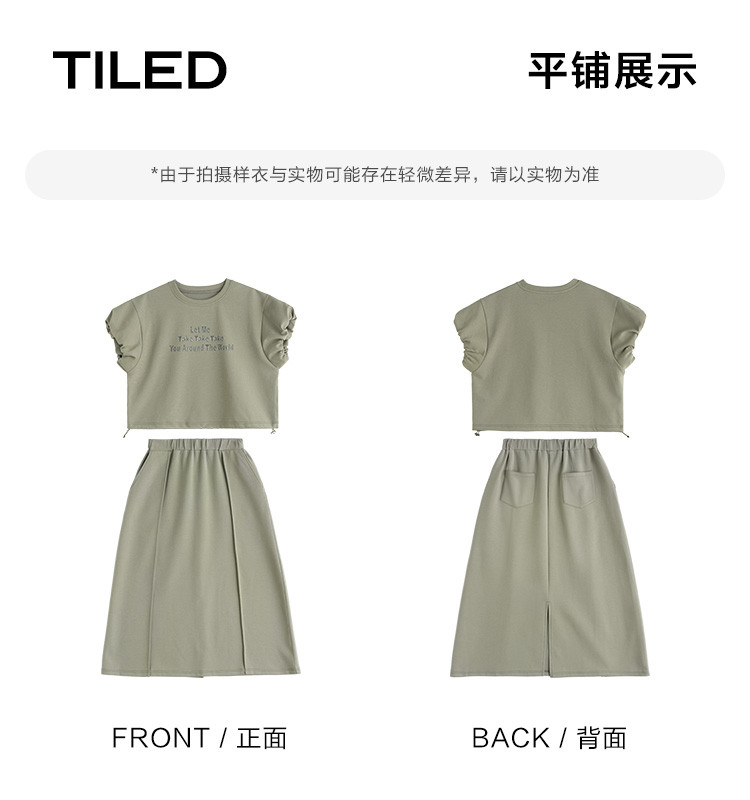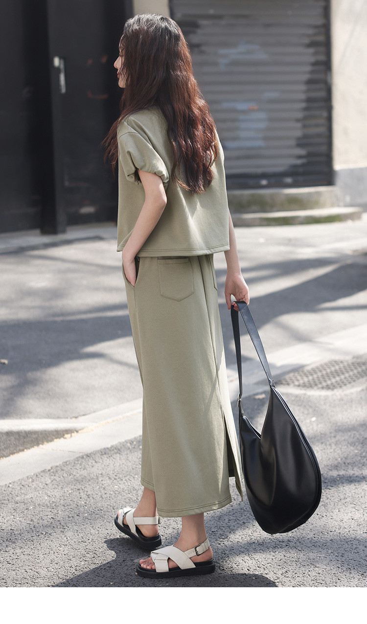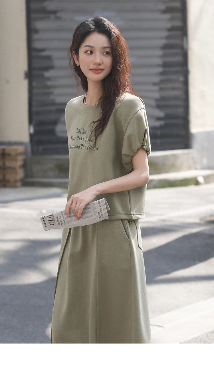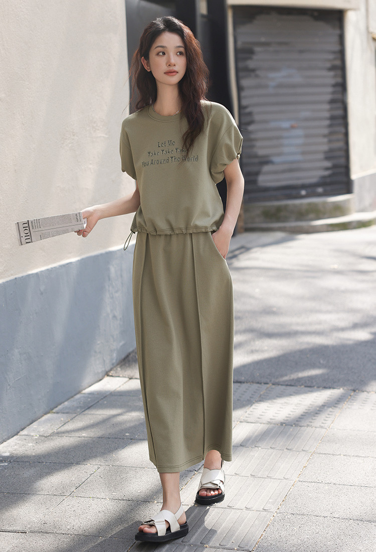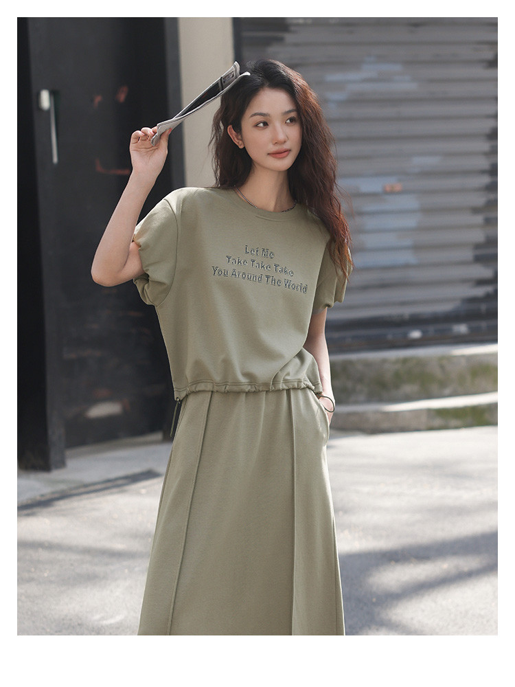 【休闲风套装】夏款字母泡泡袖抽绳+松紧腰后开衩半裙 882242