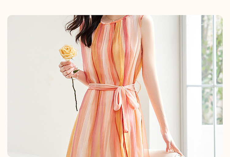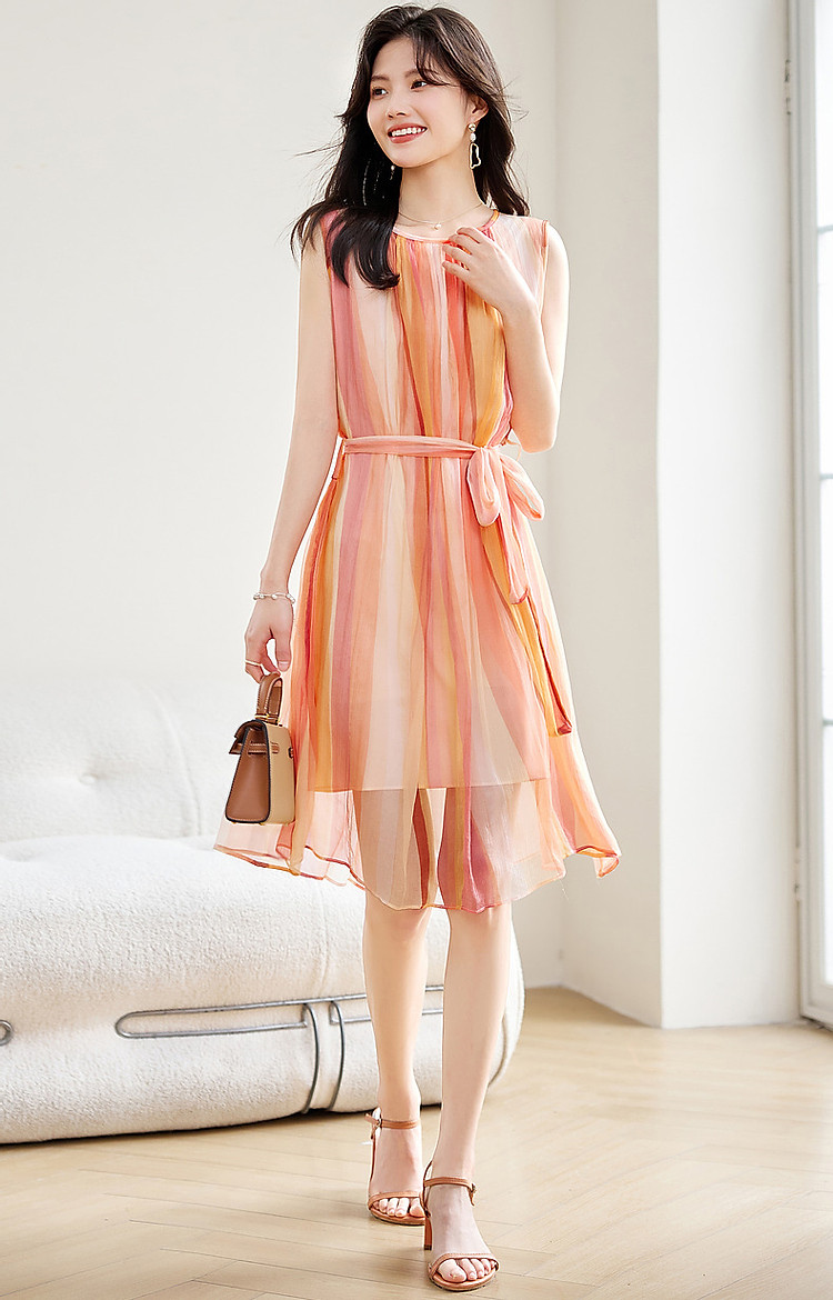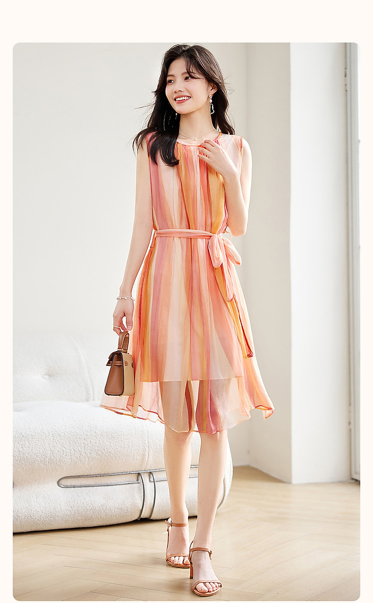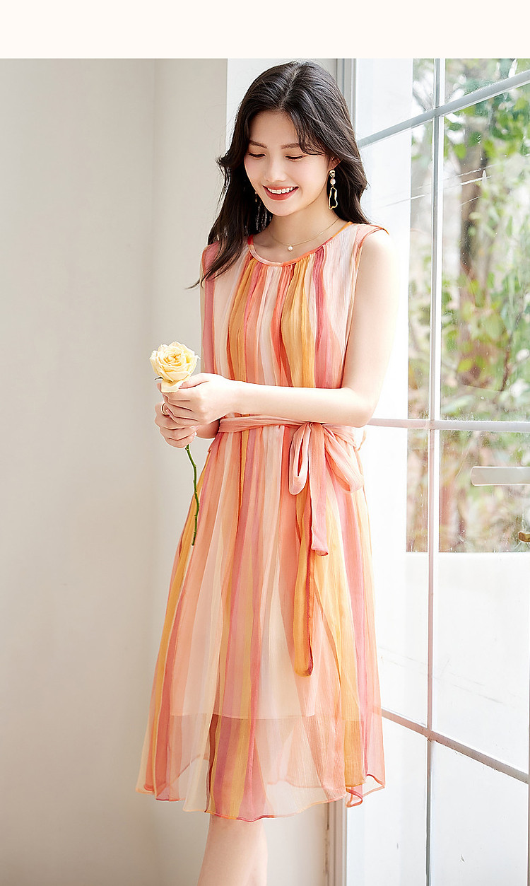 【温柔甜美日常】夏圆领桑蚕丝无袖系带a字无腰线连衣裙 583233