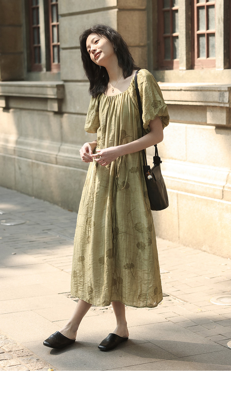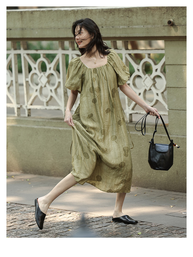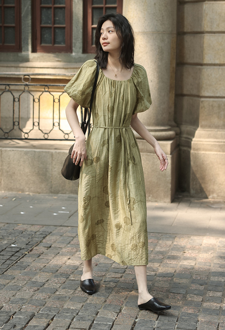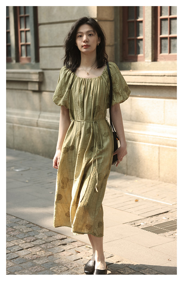 【复古方领印花连衣裙】202灯笼袖可卸腰带中长款连衣裙 120706
