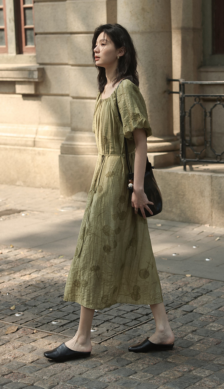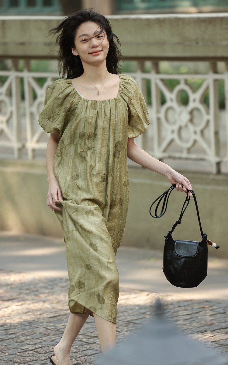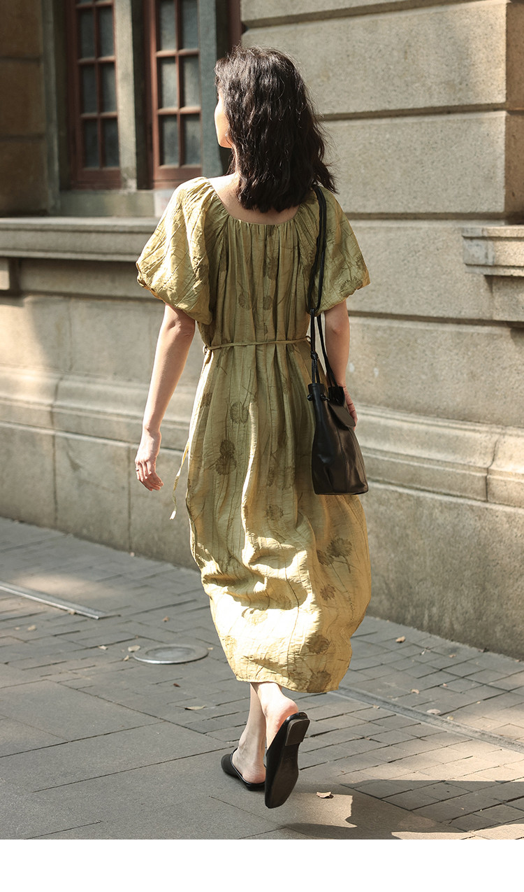 【复古方领印花连衣裙】202灯笼袖可卸腰带中长款连衣裙 120706