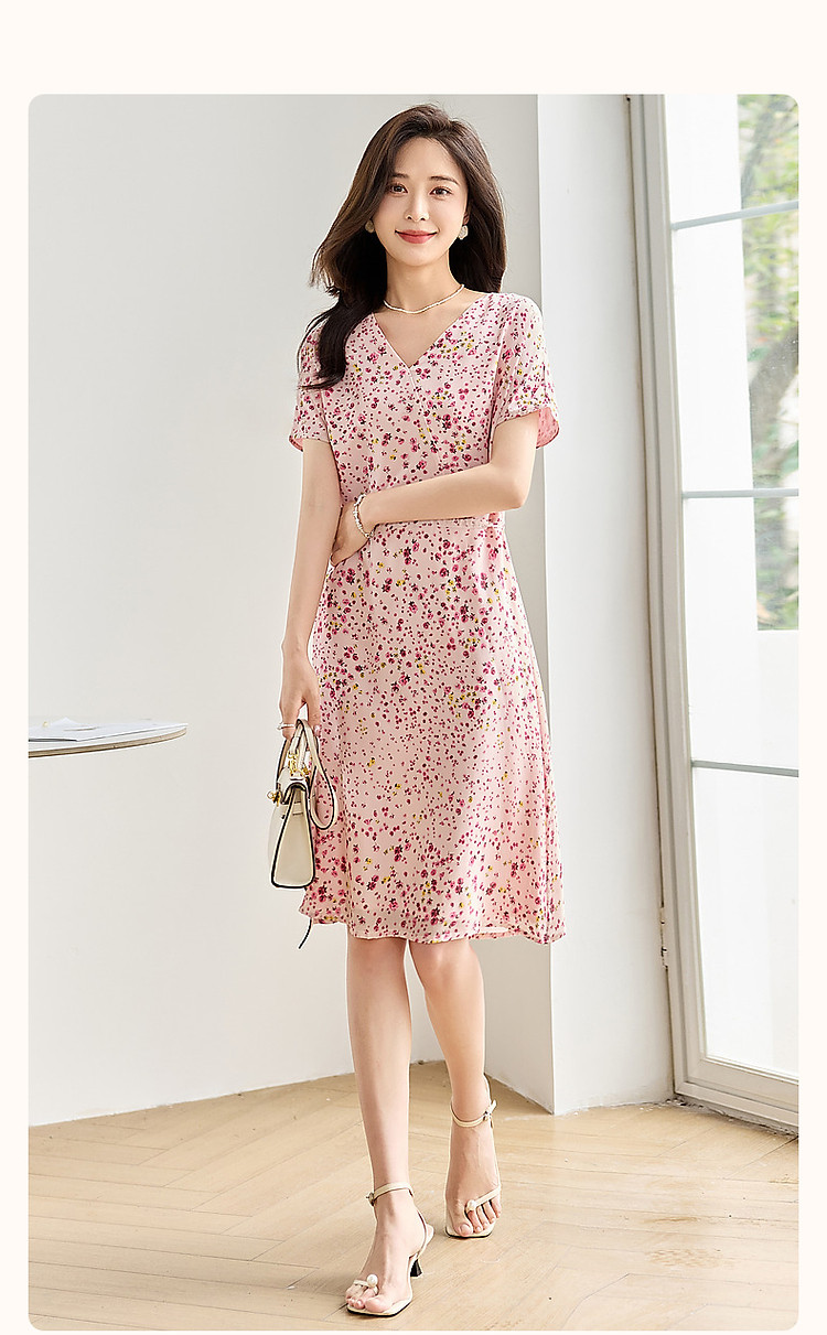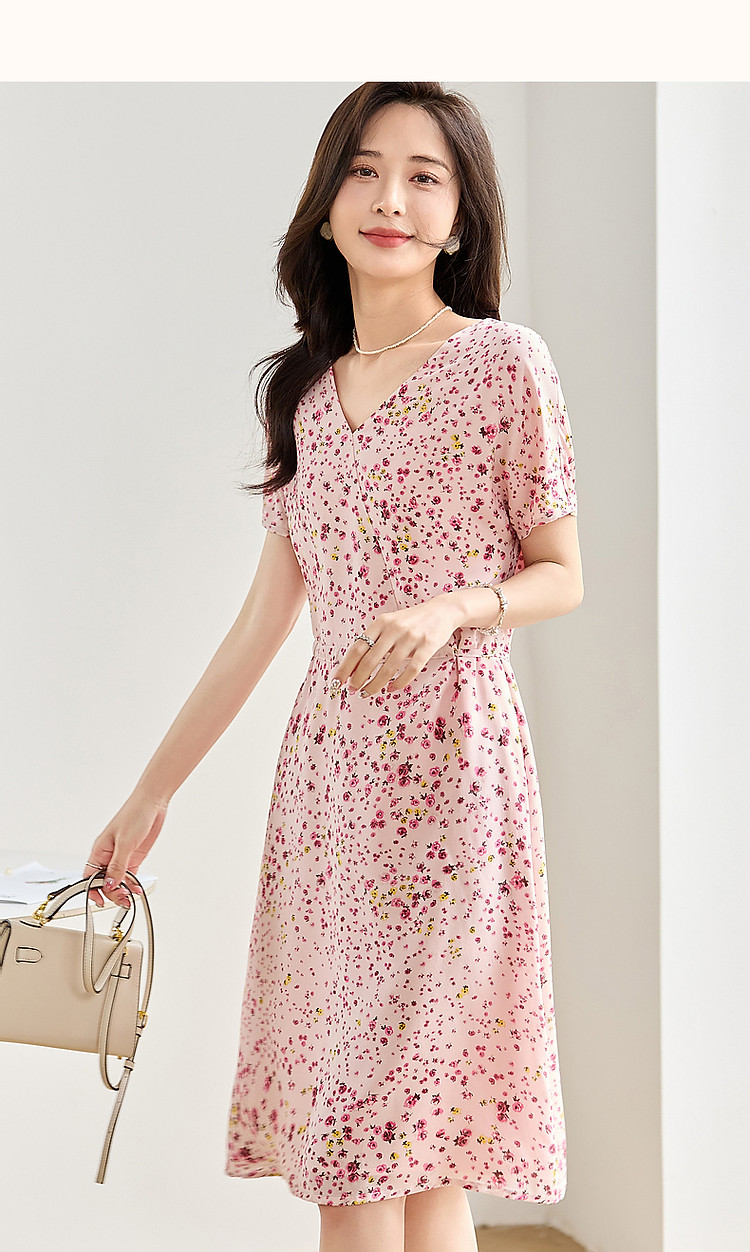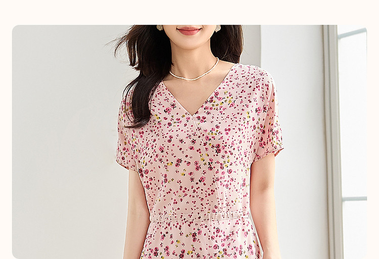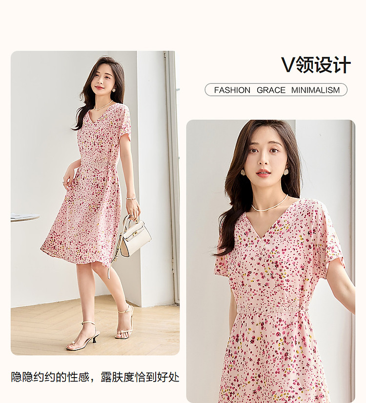 【都市佳人系列】夏奢享桑蚕丝碎花a字浪漫连衣裙女 005505