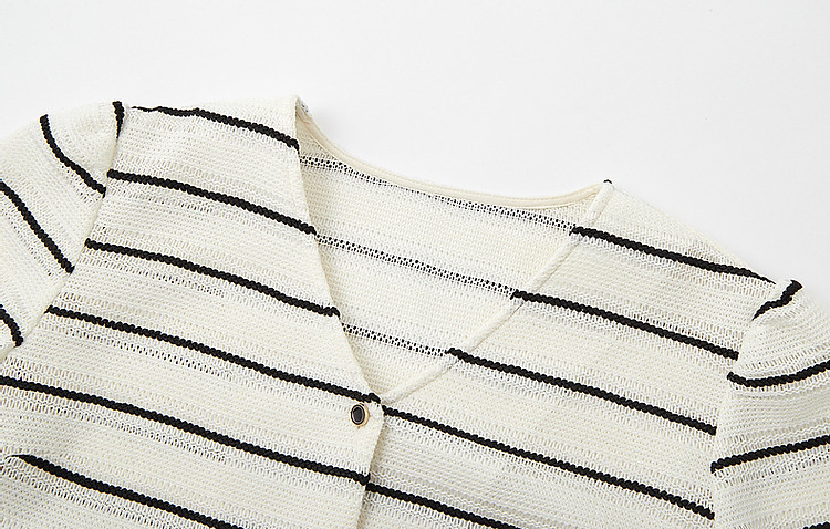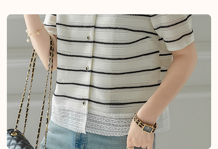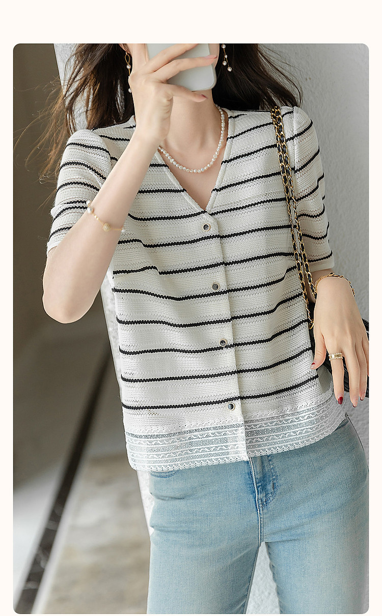 商品名称:【韩女速成班】夏条纹线条美学衬衫V领蕾丝拼接遮肉衬衣女装上衣 796289