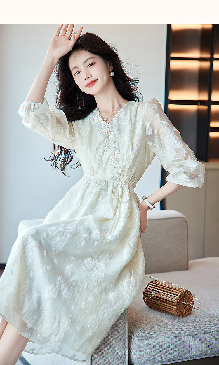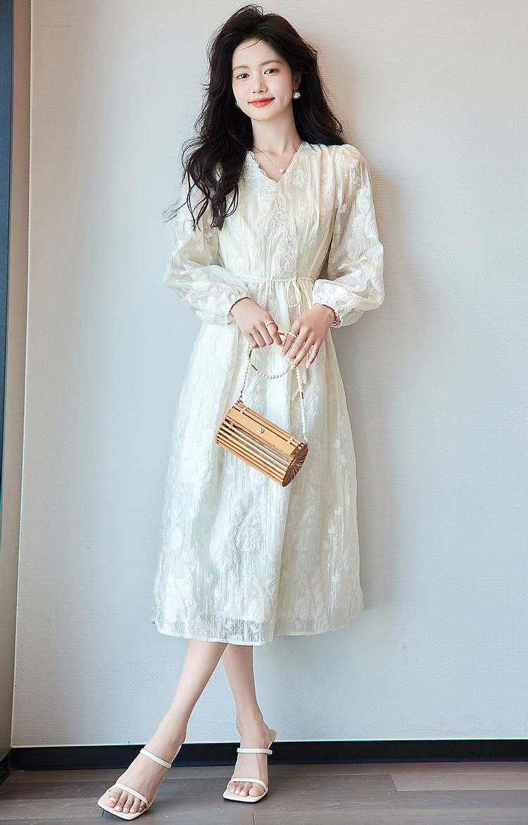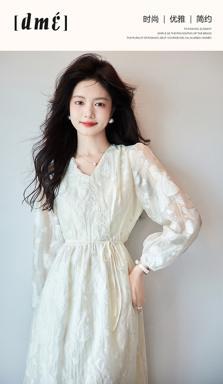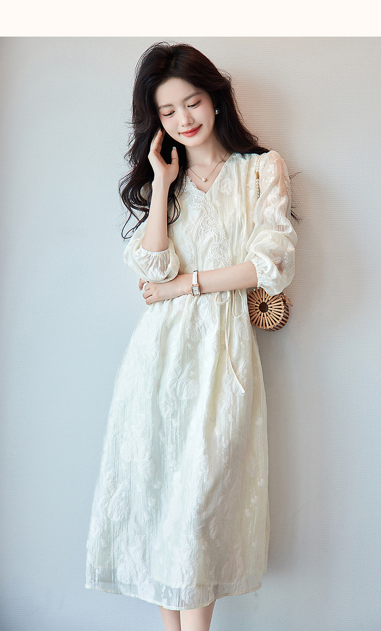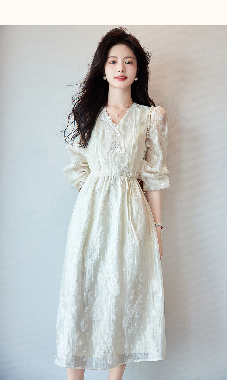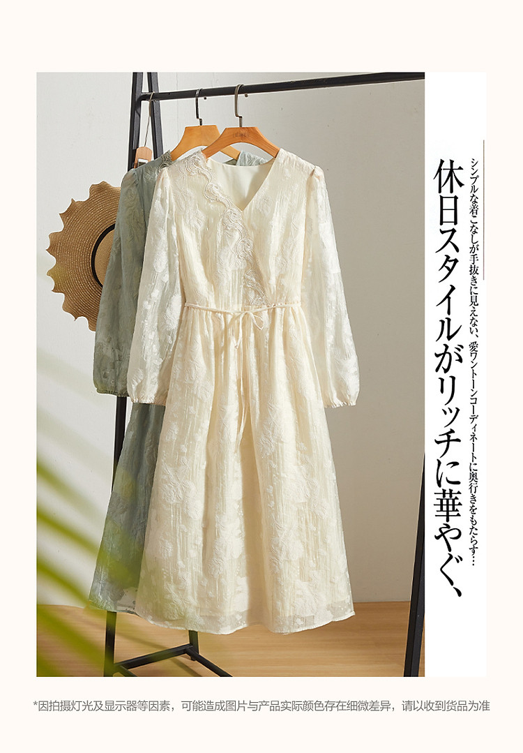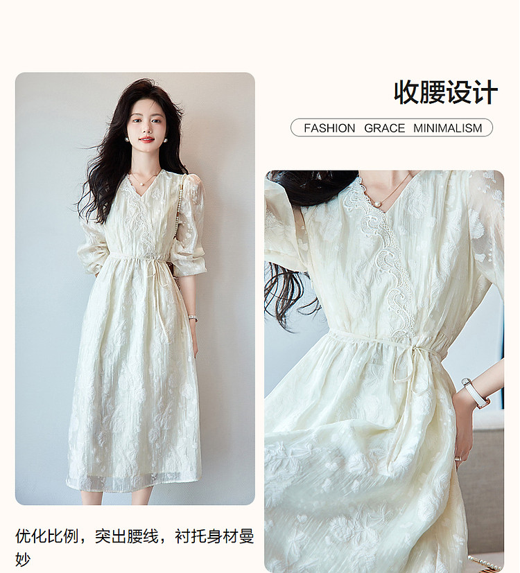 商品名称:【轻奢提花a字裙】春秋v领收腰蕾丝x型连衣裙女中长款 549569