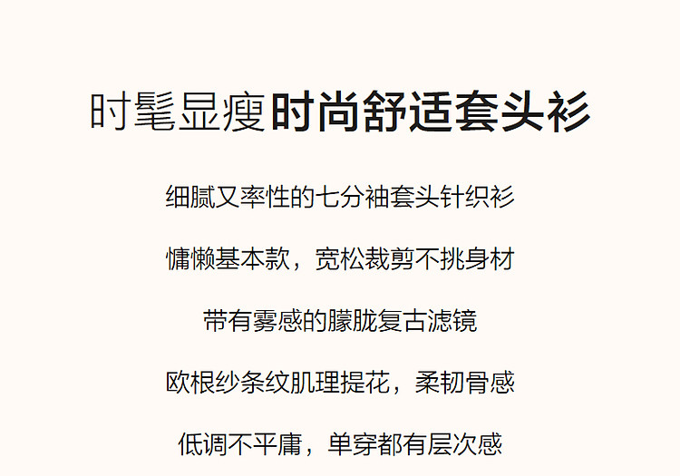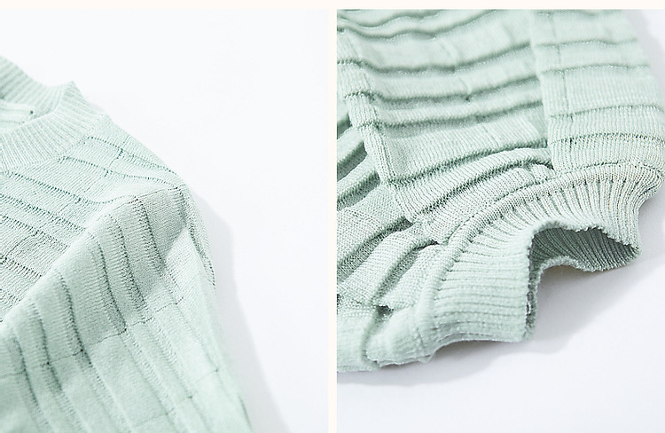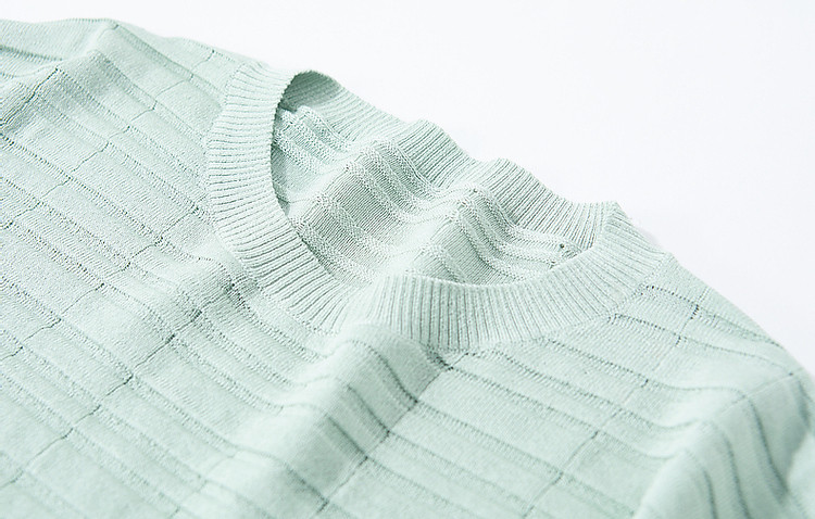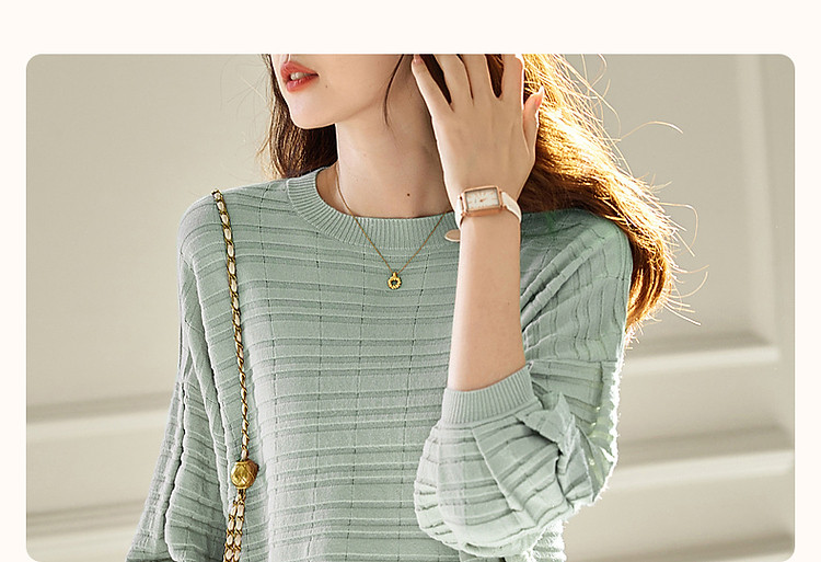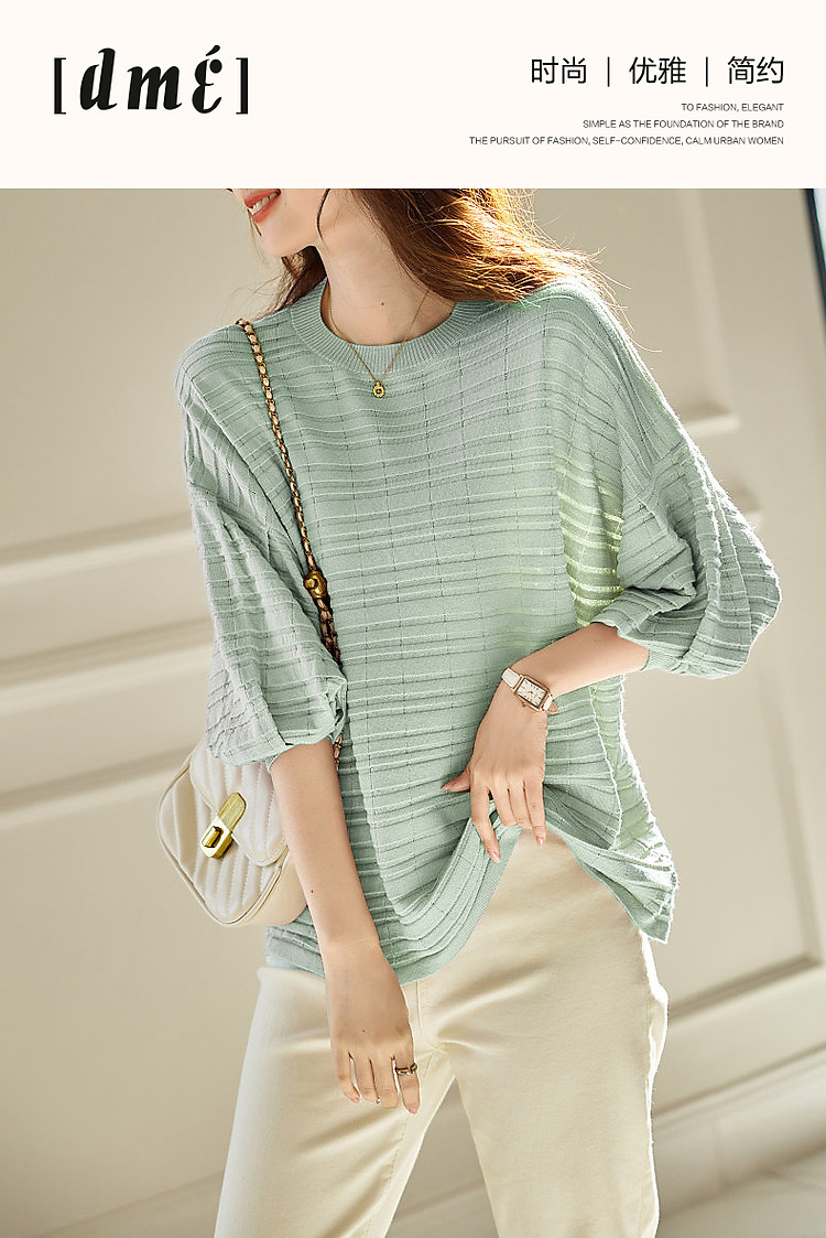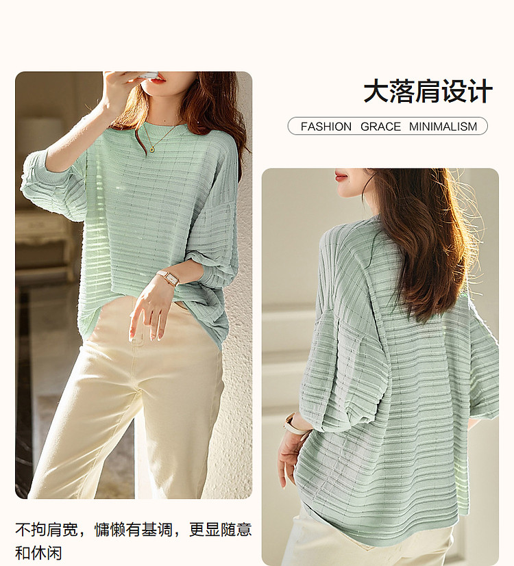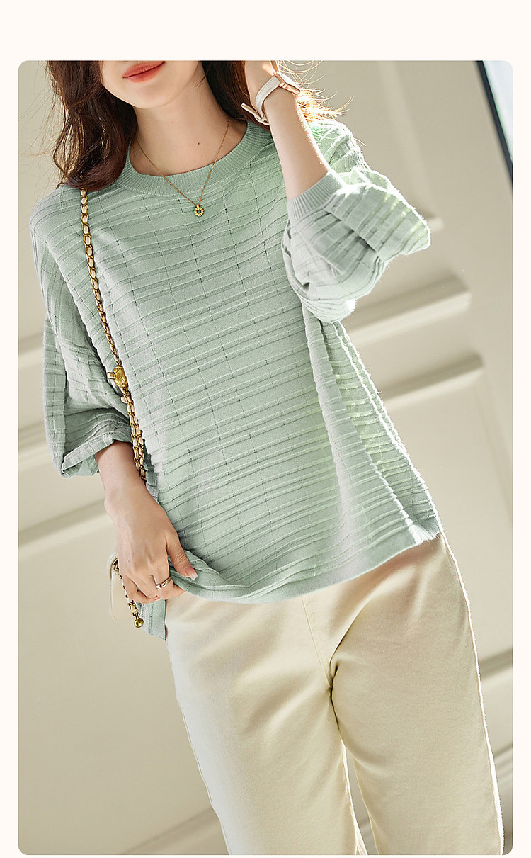 商品名称:【欧根纱条纹肌理提花】春秋圆领七分袖线衫冰麻针织衫女上衣 067393