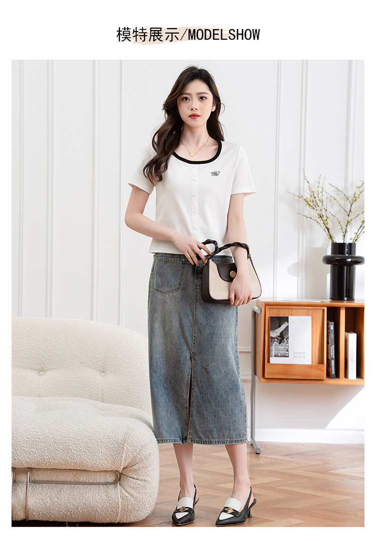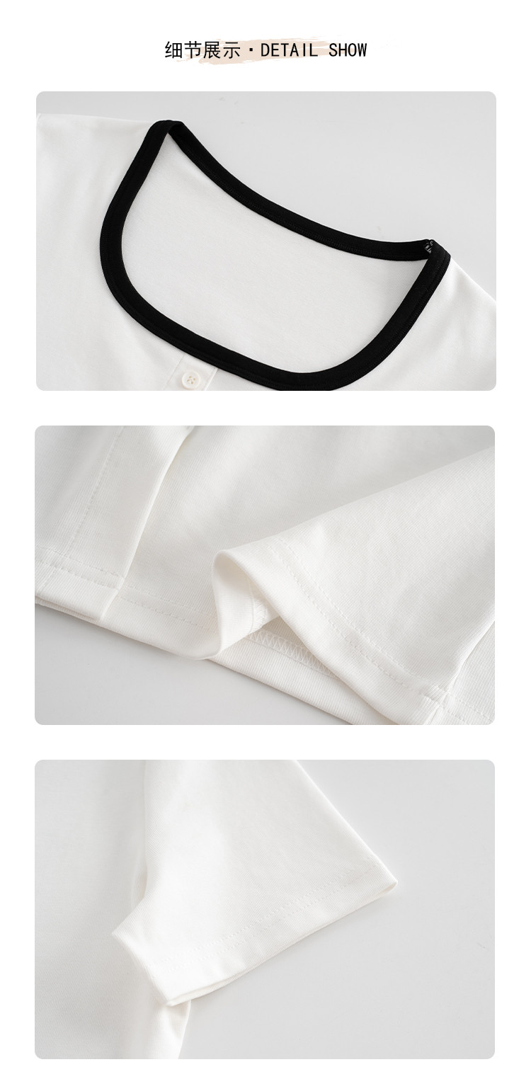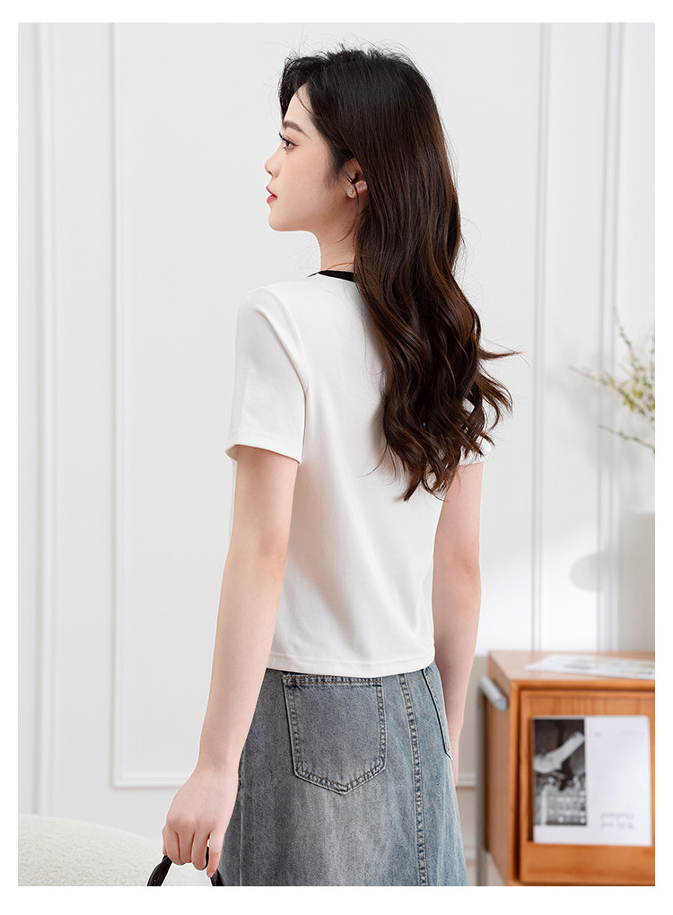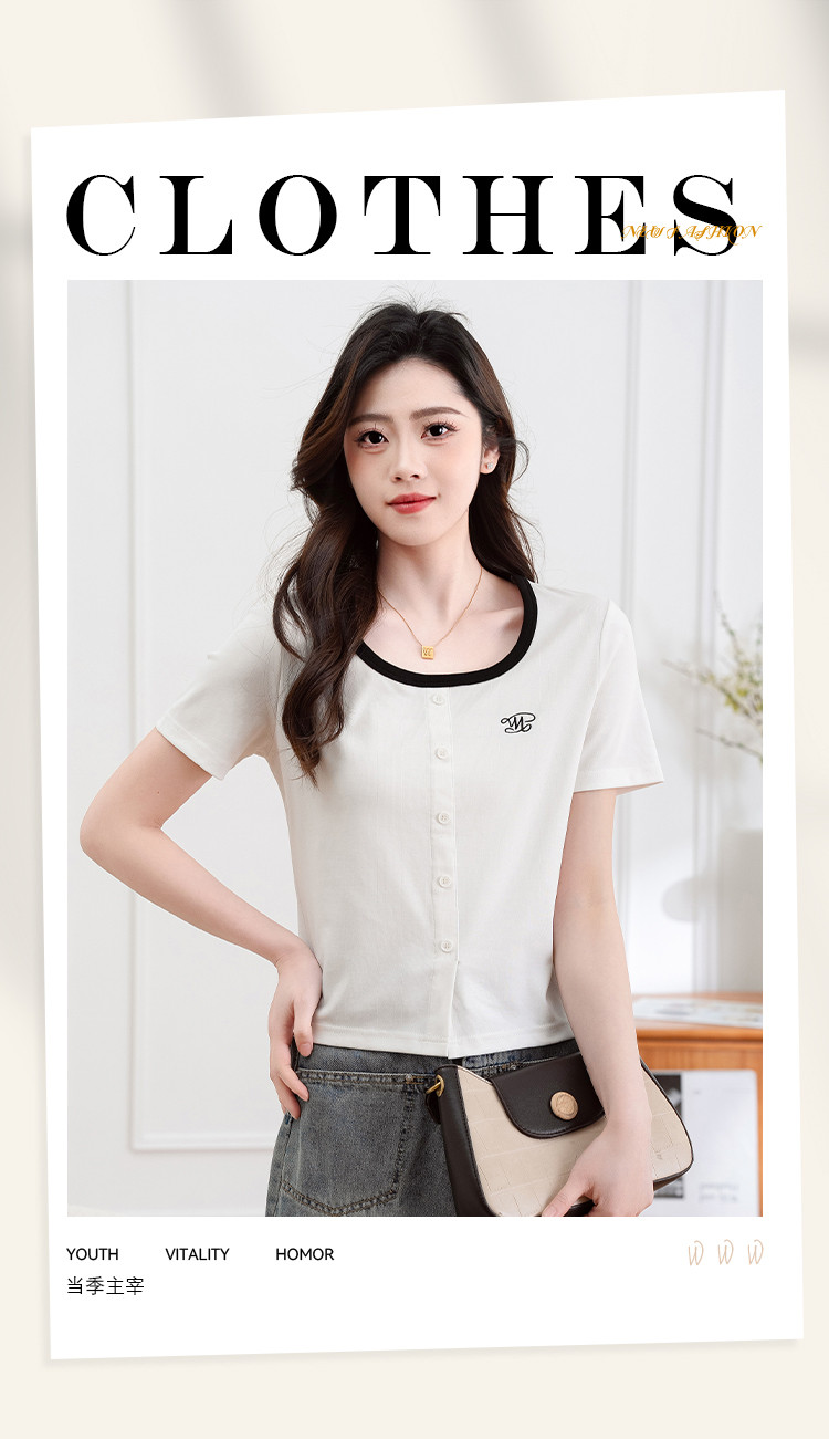 商品名称:【独特刺绣】小个子修身短款百搭休闲高弹舒适方领短袖T恤上衣女 438785