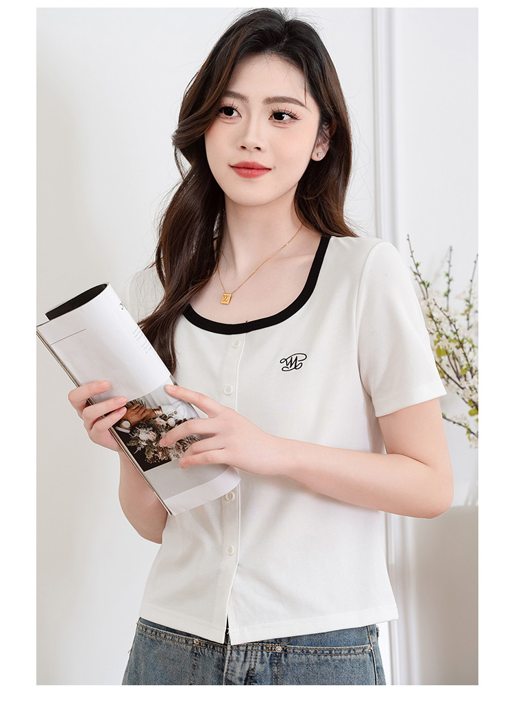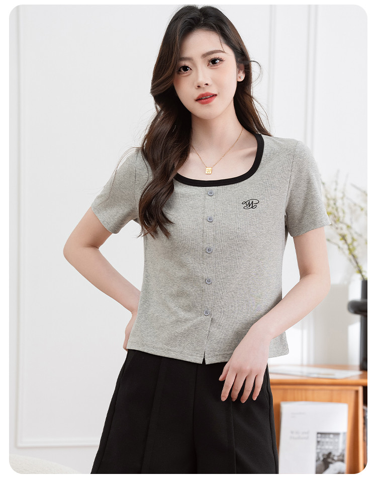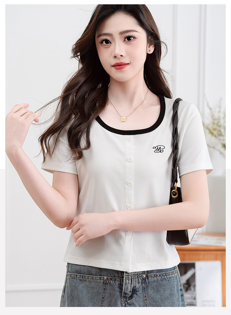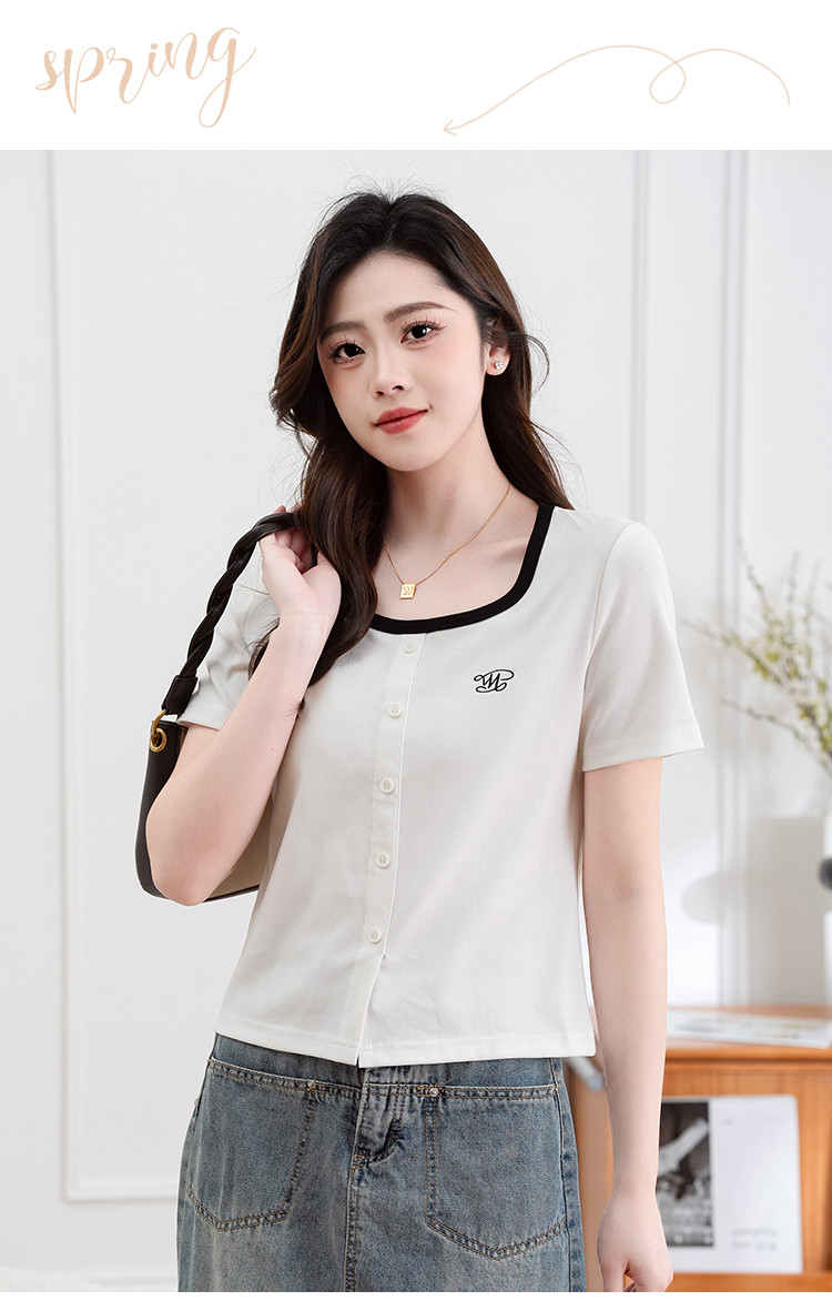 【独特刺绣】小个子修身短款百搭休闲高弹舒适方领短袖T恤上衣女 438785