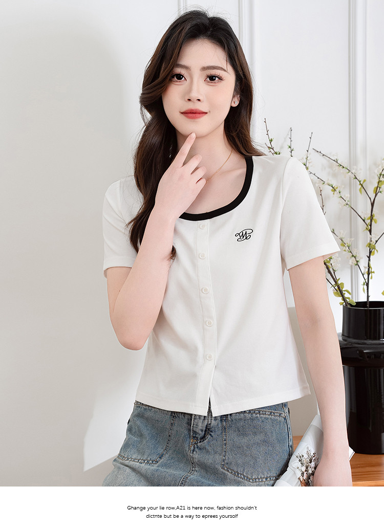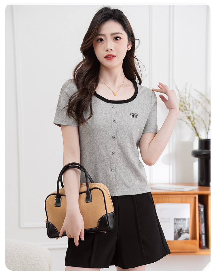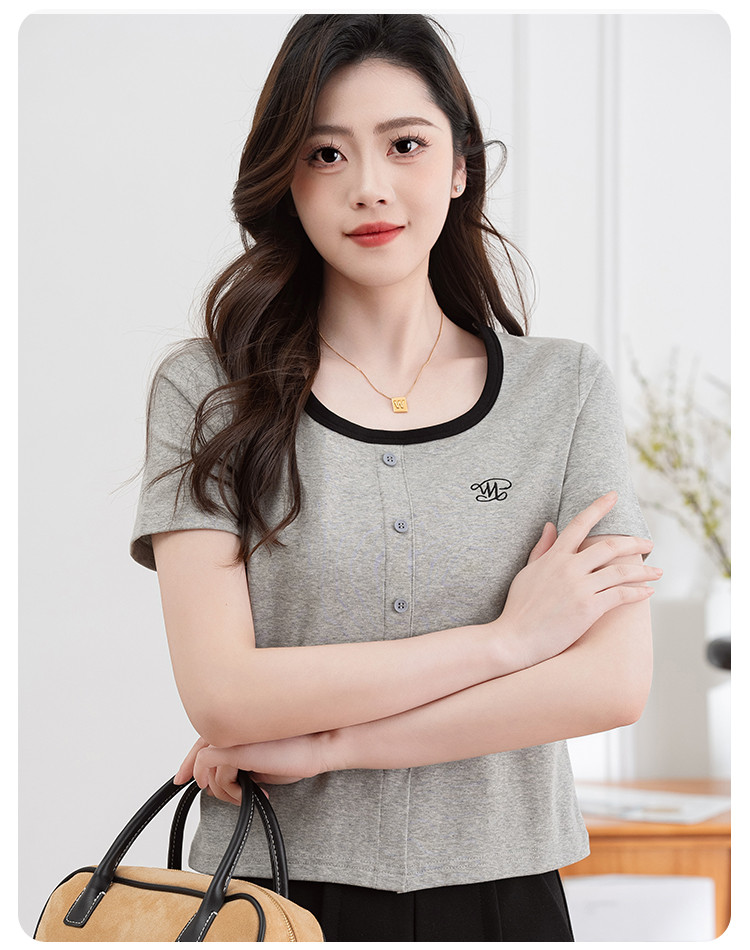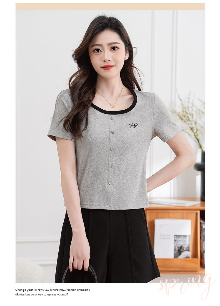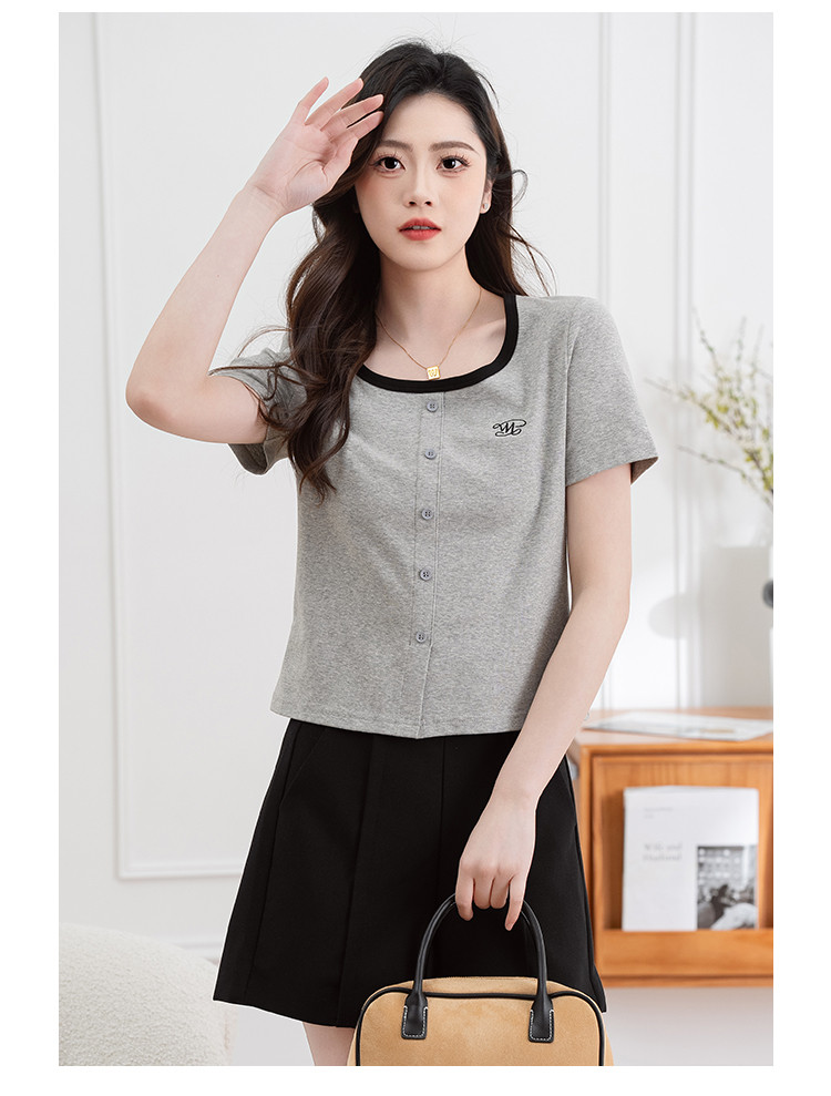 【独特刺绣】小个子修身短款百搭休闲高弹舒适方领短袖T恤上衣女 438785