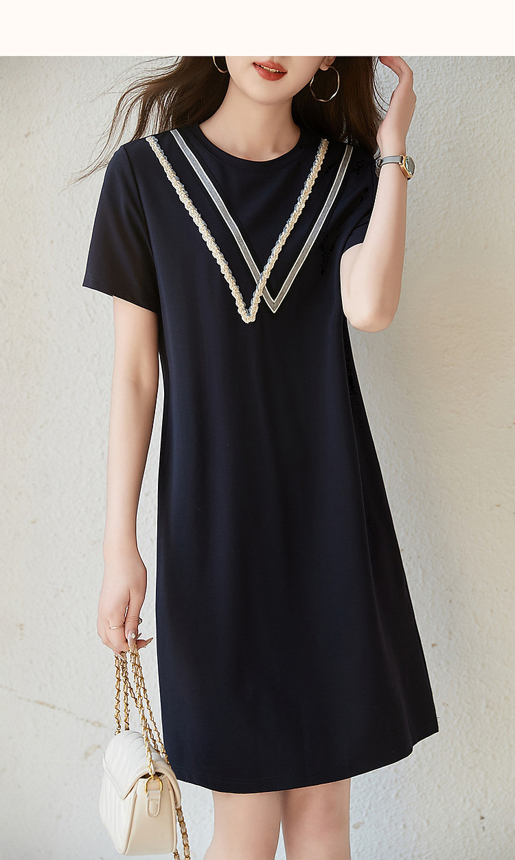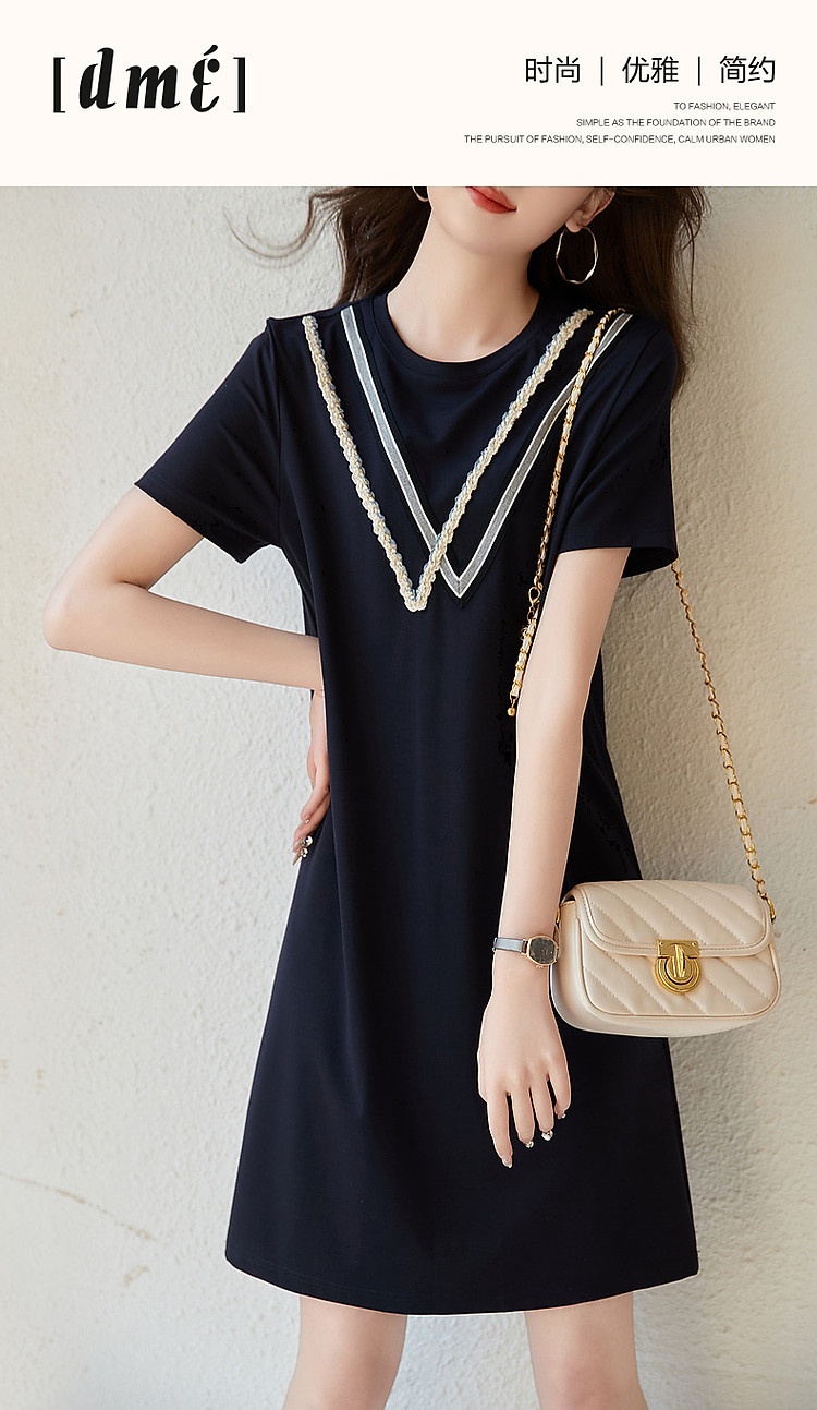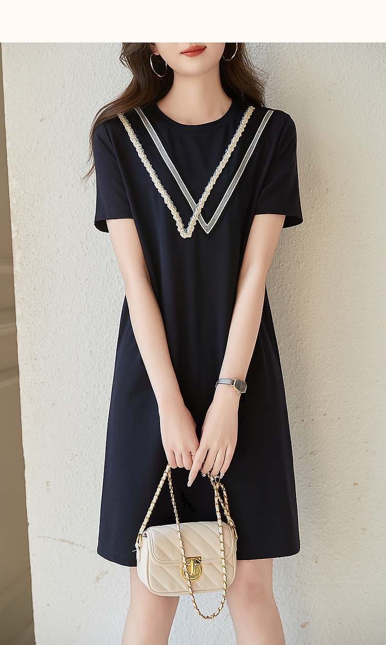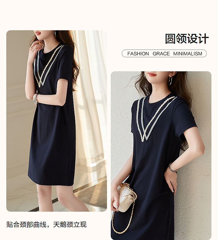 商品名称:【复古姐姐裙】夏减龄圆领罗马棉绞花织带直筒短袖连衣裙女中长款 410817