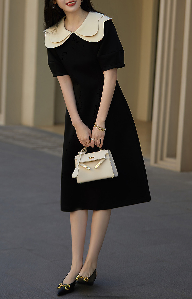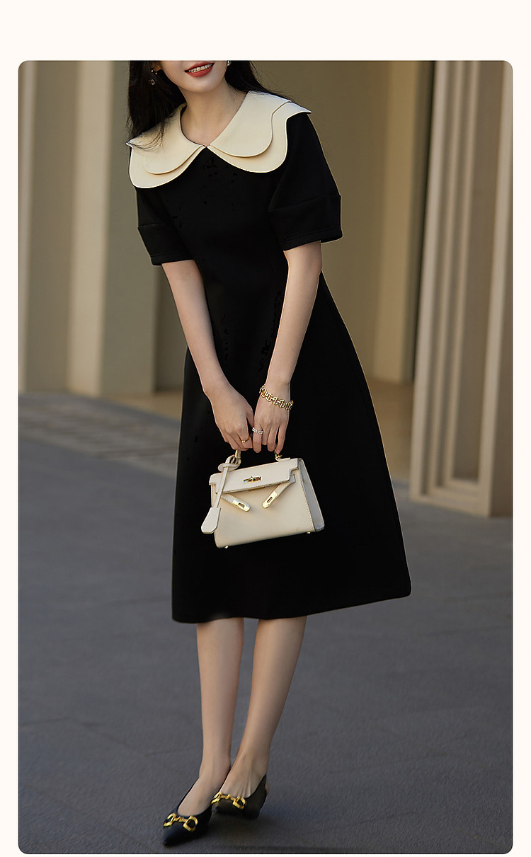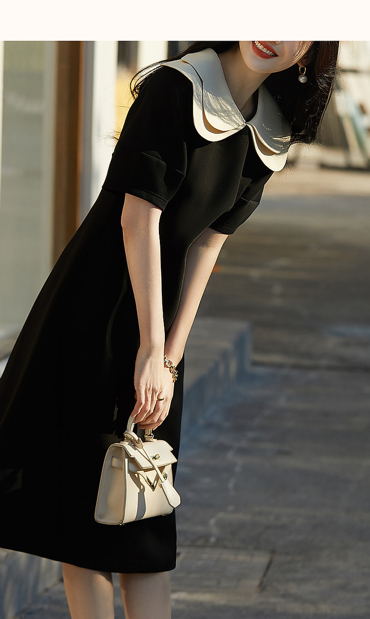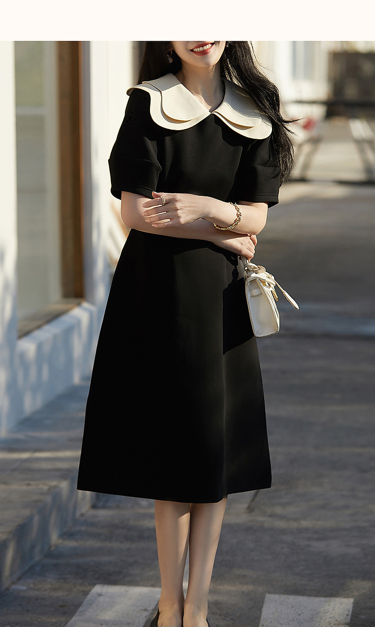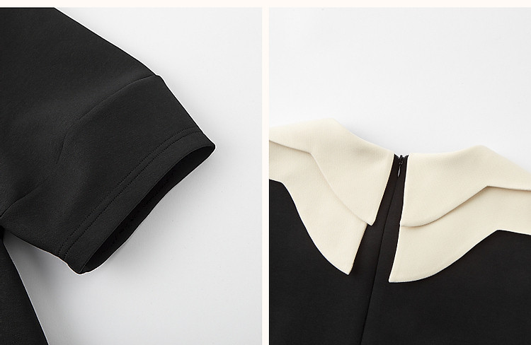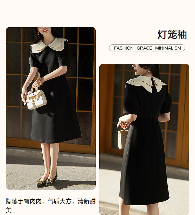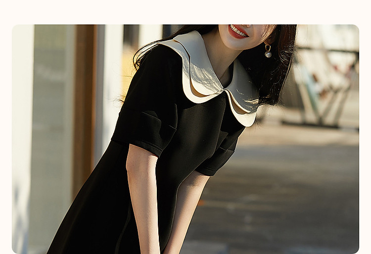 商品名称:【少女千金】春秋法式花瓣领小黑裙350G空气层撞色连衣裙女 583809