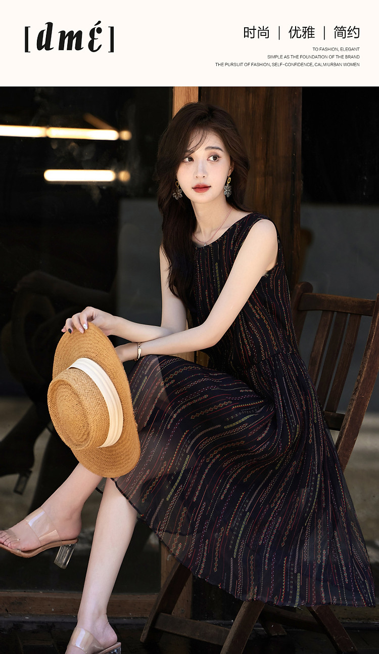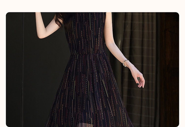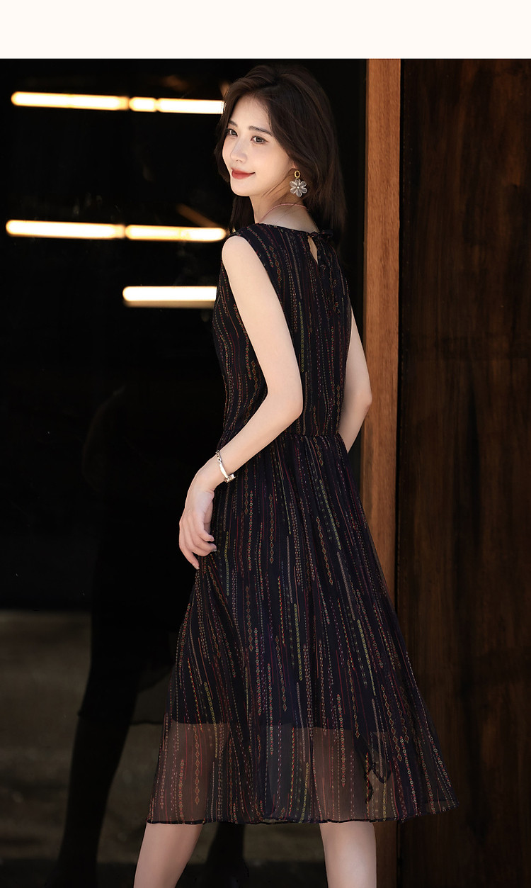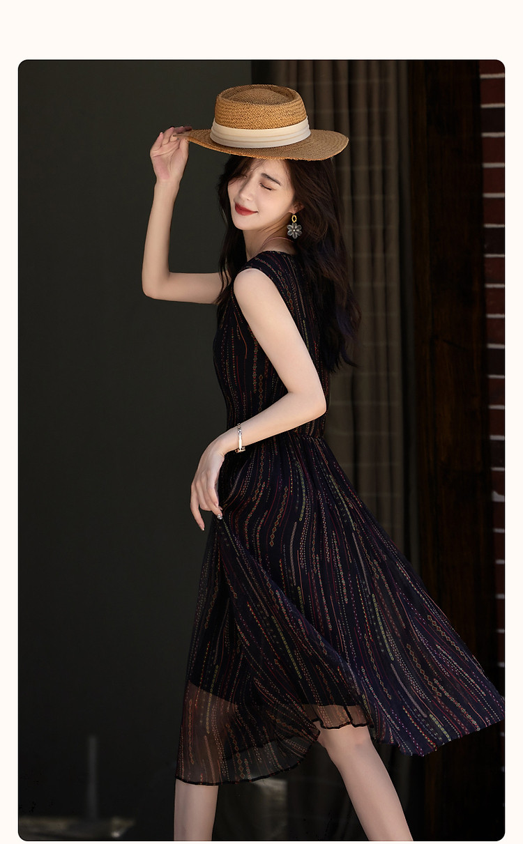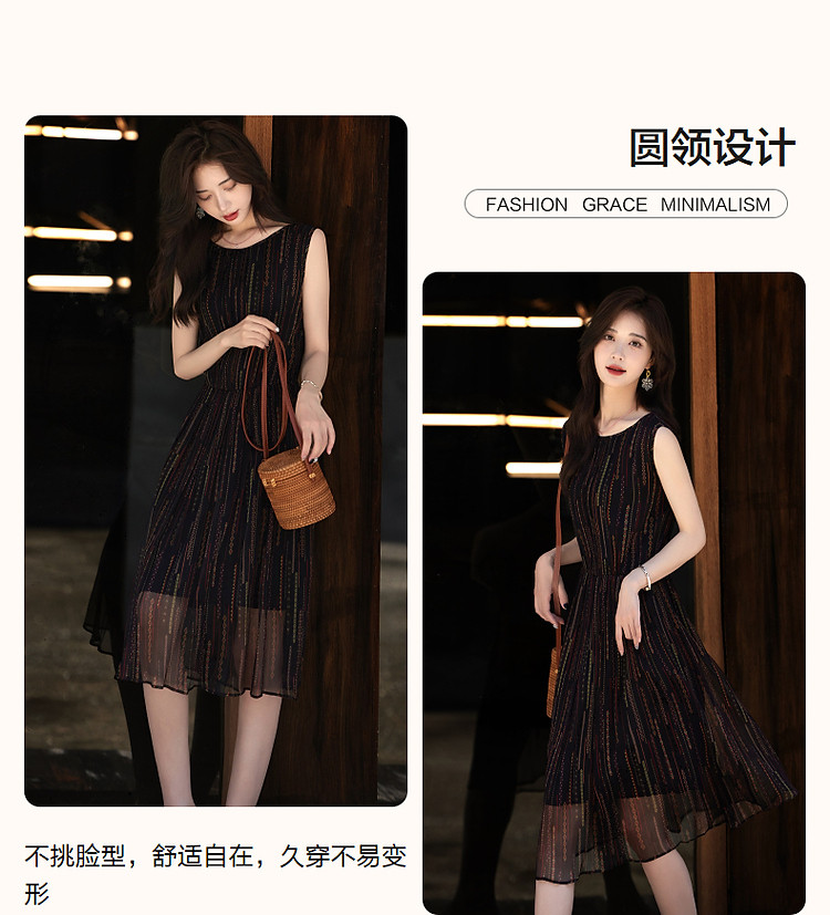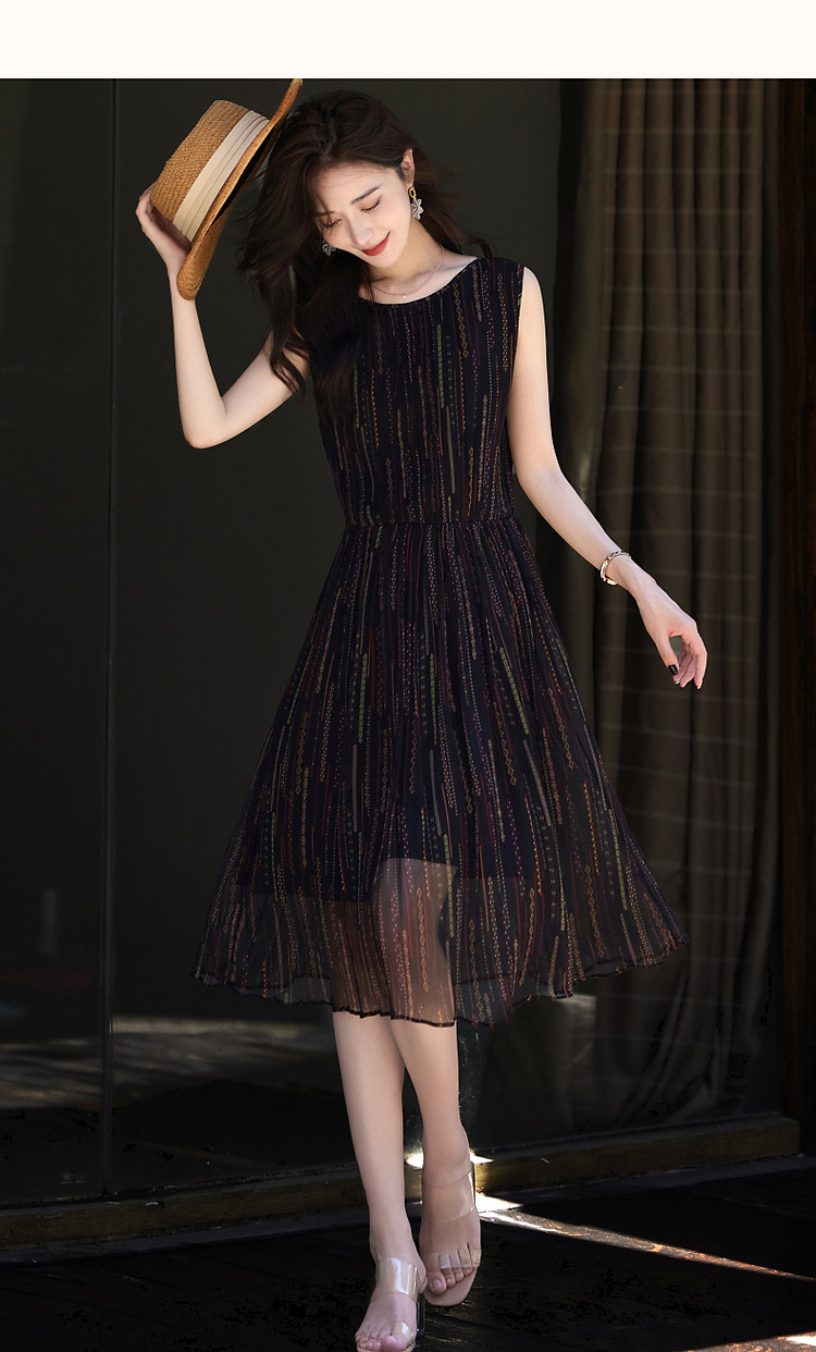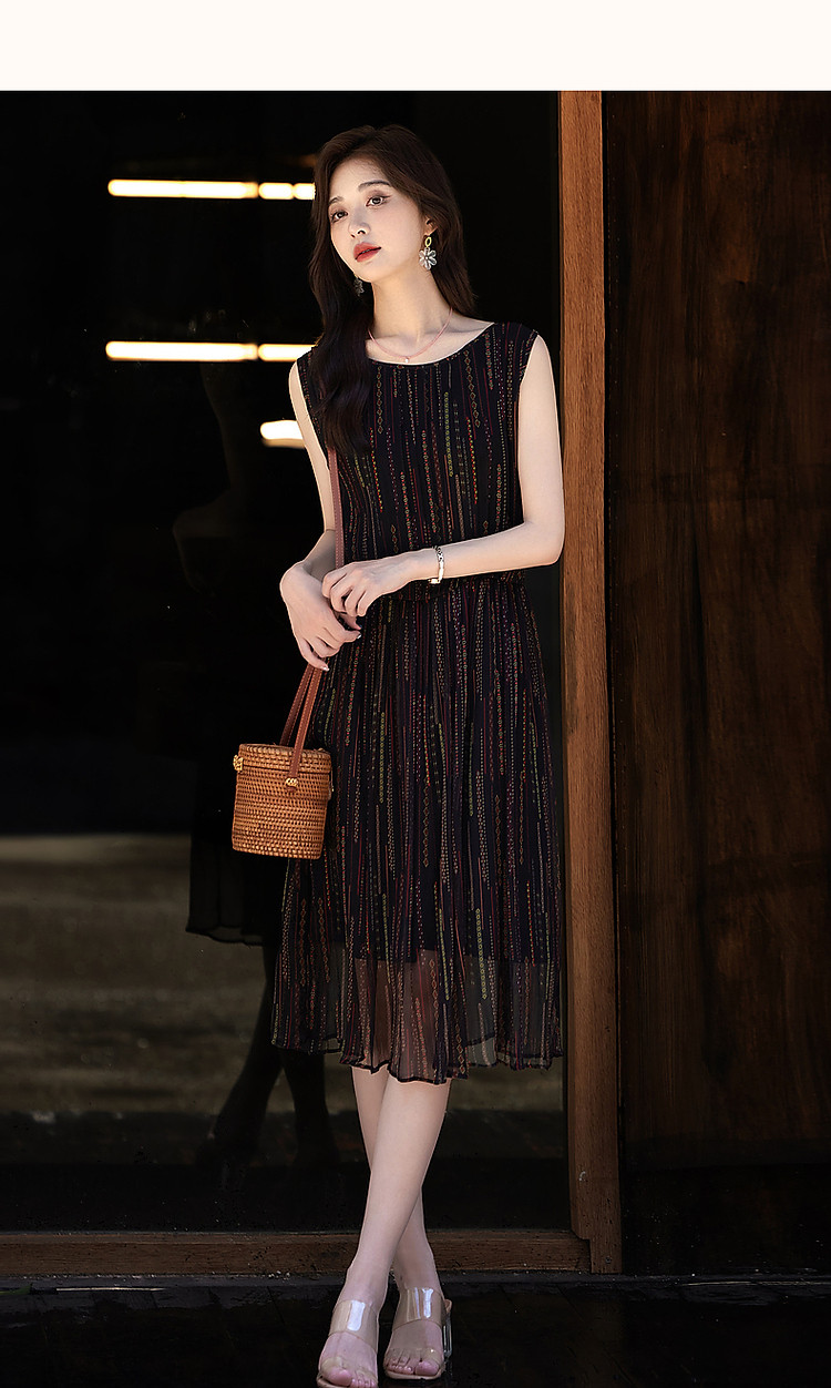 商品名称:【优雅名媛】春圆领桑蚕丝真丝碎花百褶无袖连衣裙女长款 588225