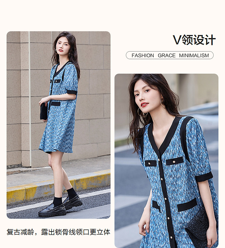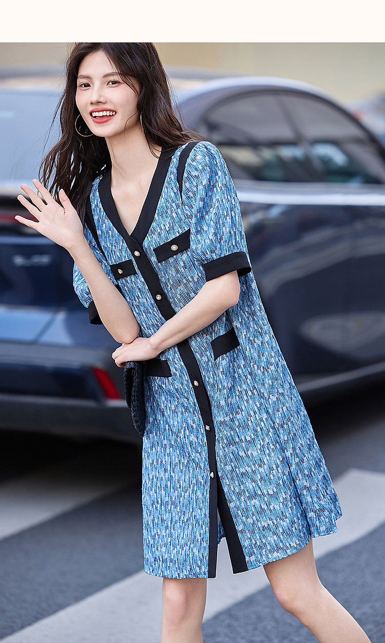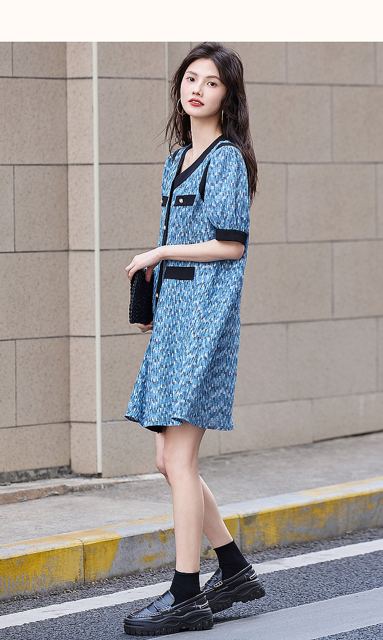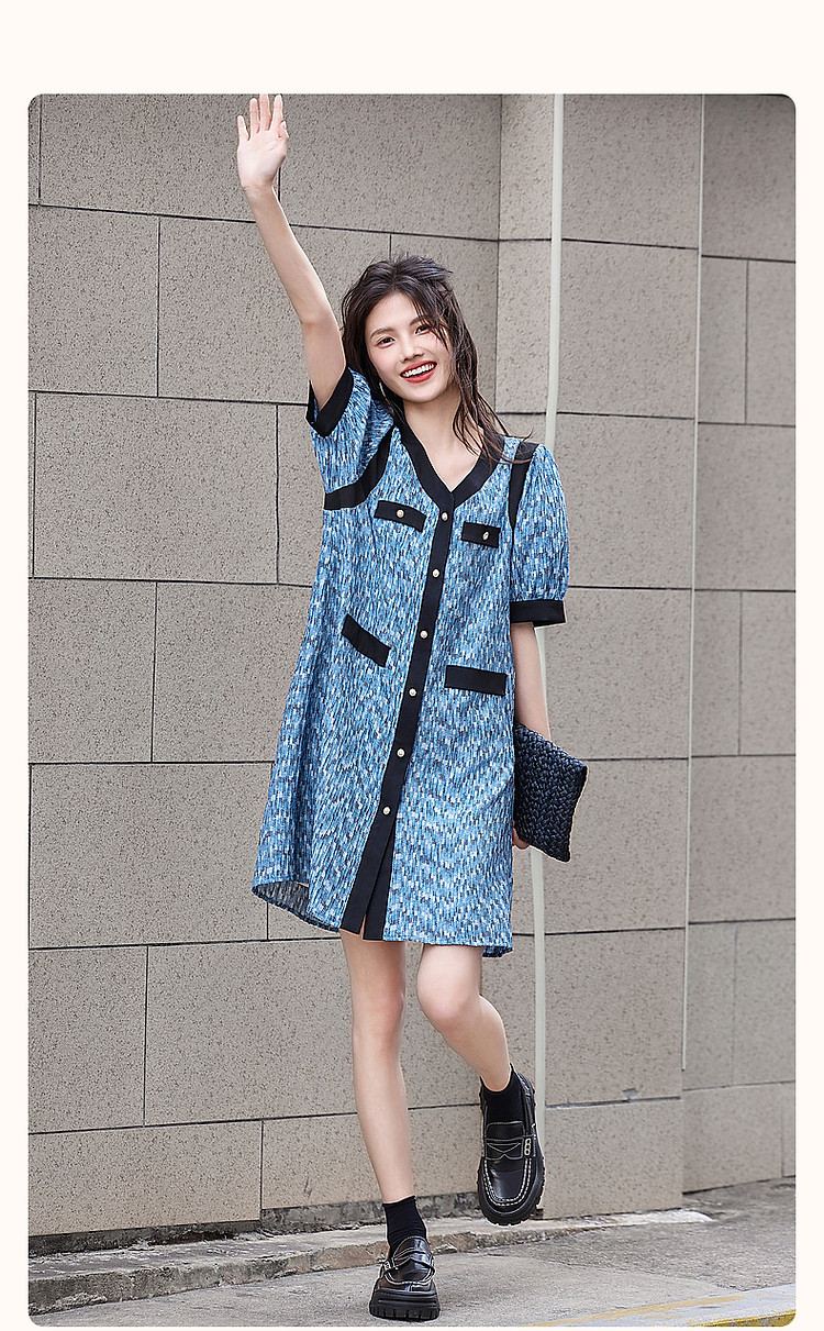 商品名称:【水波纹针织提花】夏静奢小香风V领泡泡袖拼色连衣裙女中长款 699841