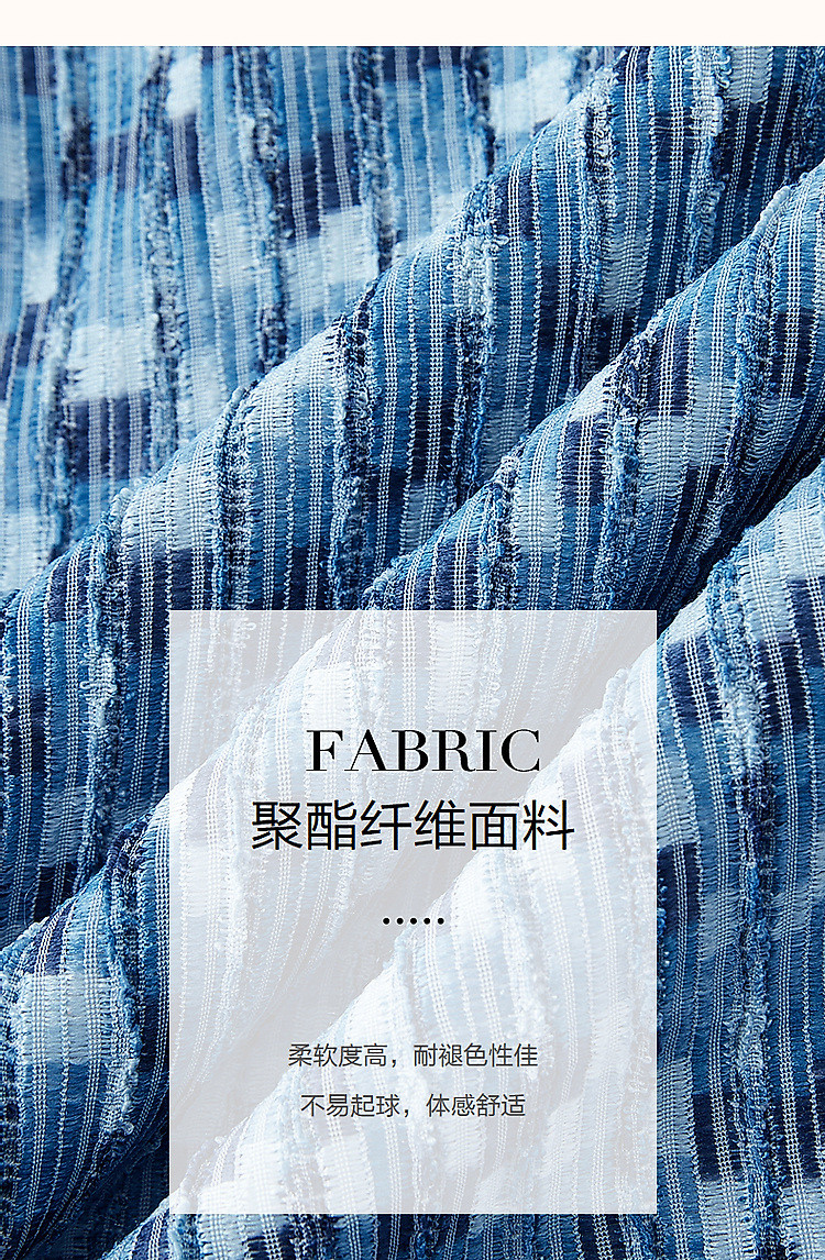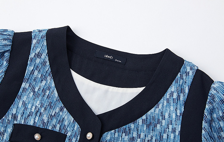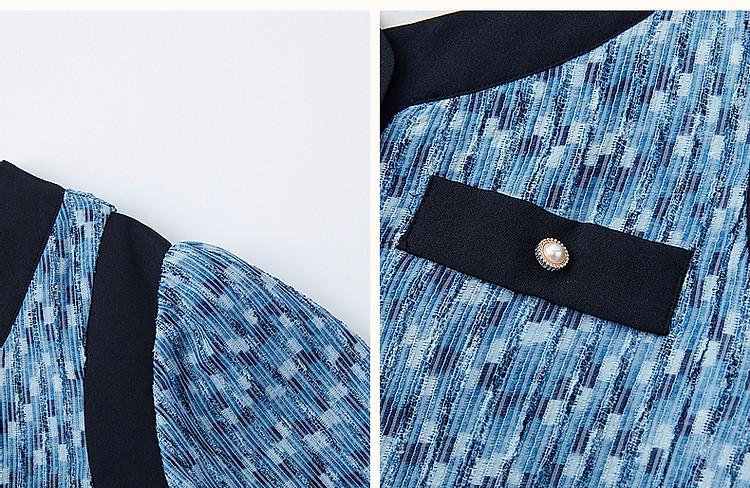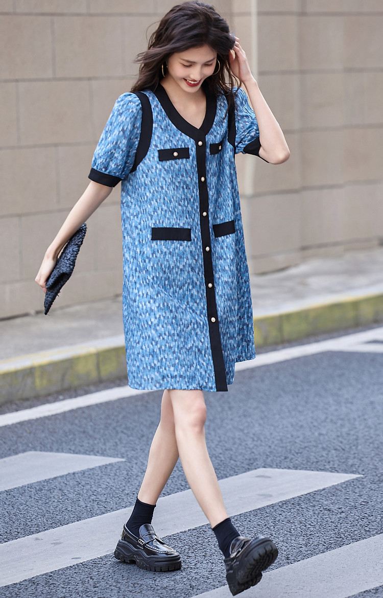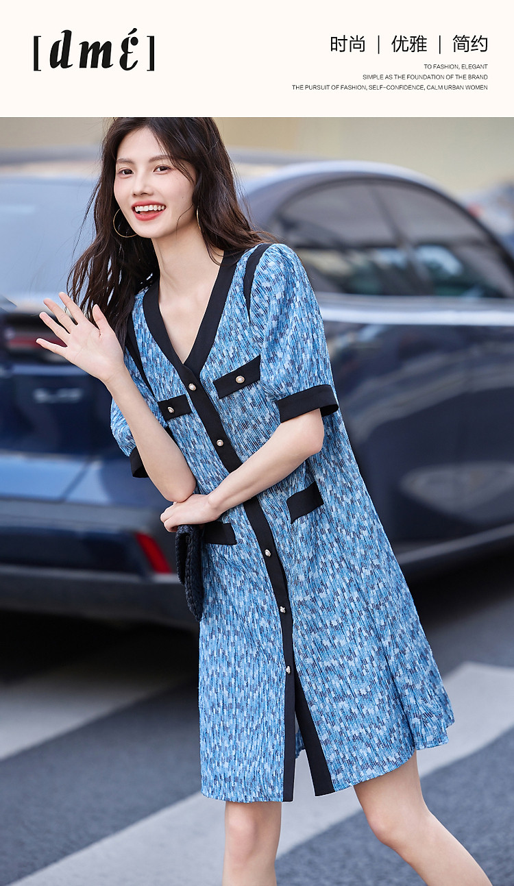 商品名称:【水波纹针织提花】夏静奢小香风V领泡泡袖拼色连衣裙女中长款 699841