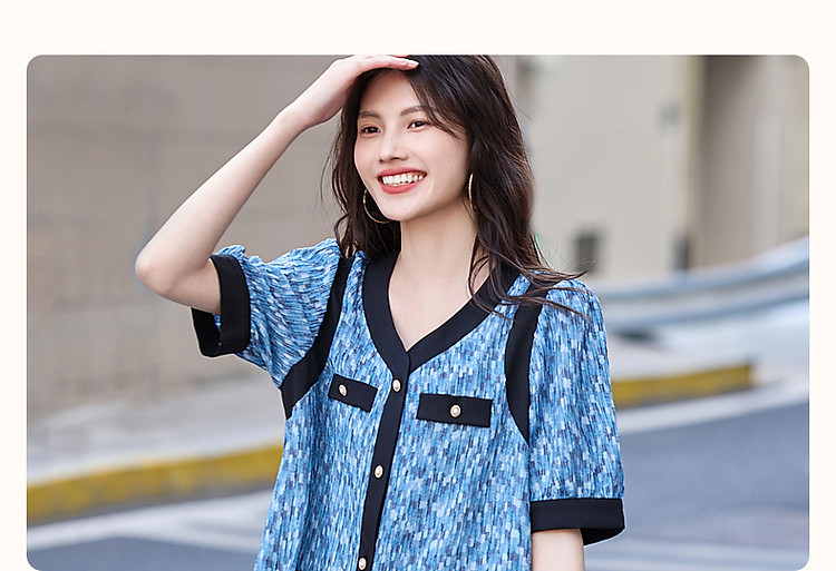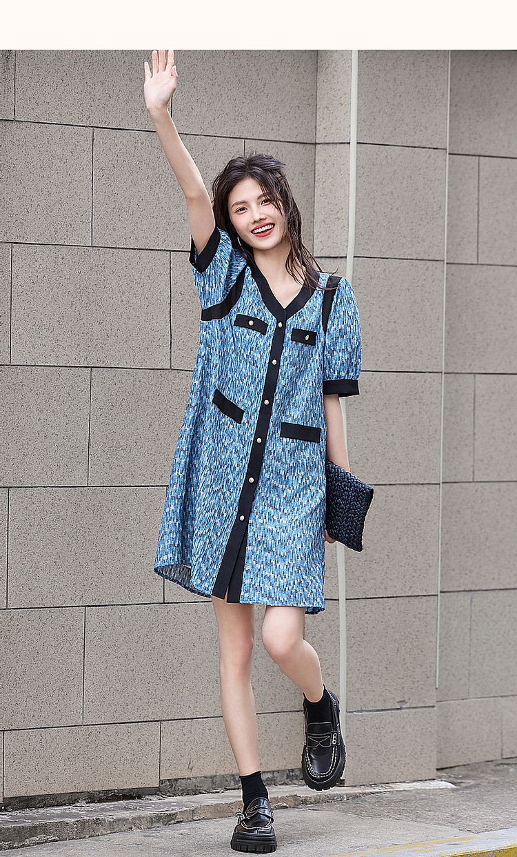 【水波纹针织提花】夏静奢小香风V领泡泡袖拼色连衣裙女中长款 699841