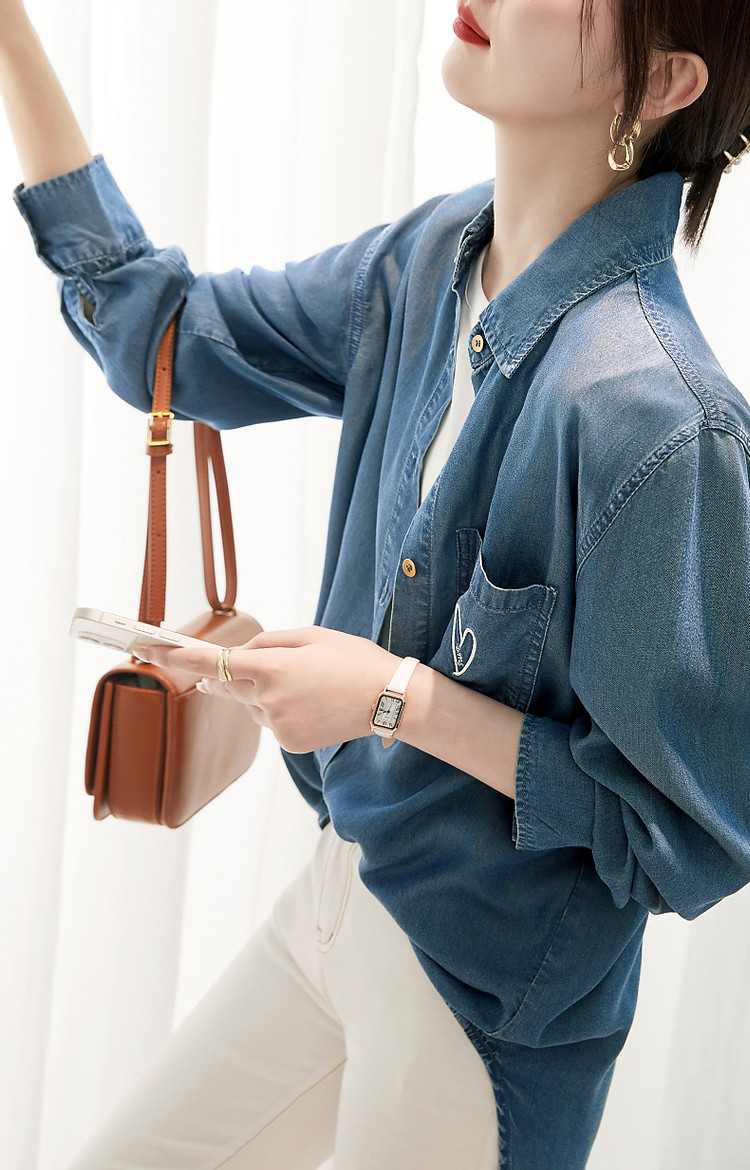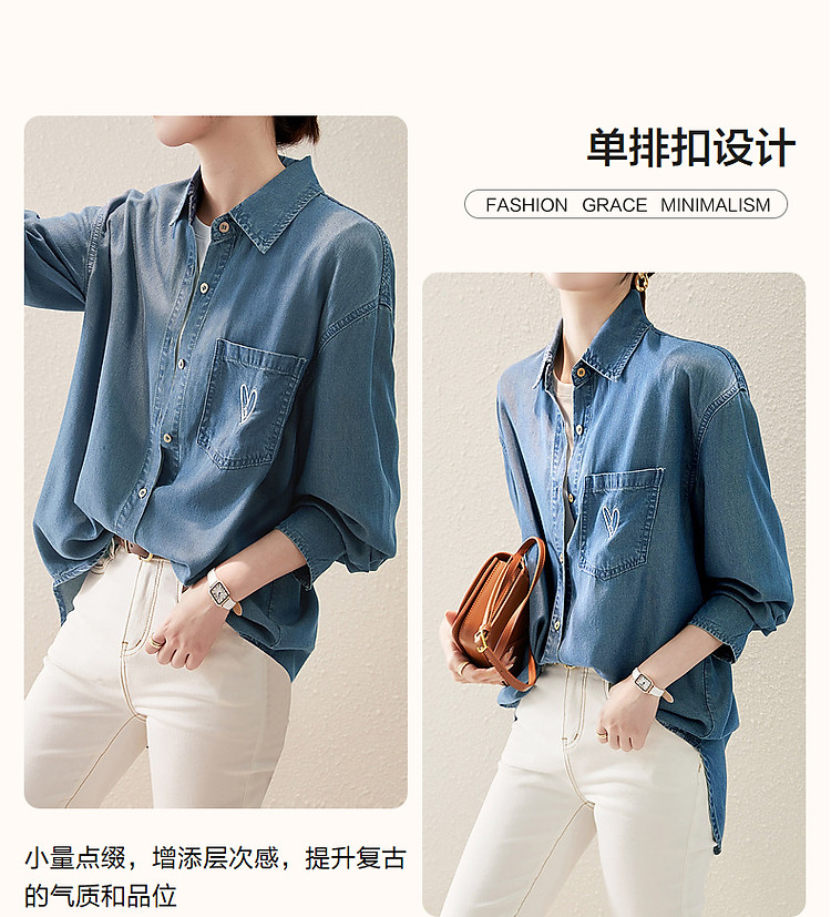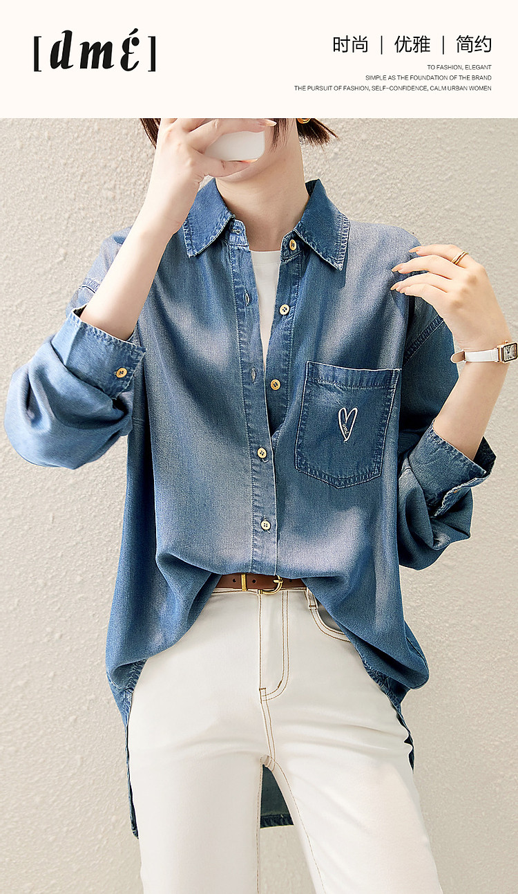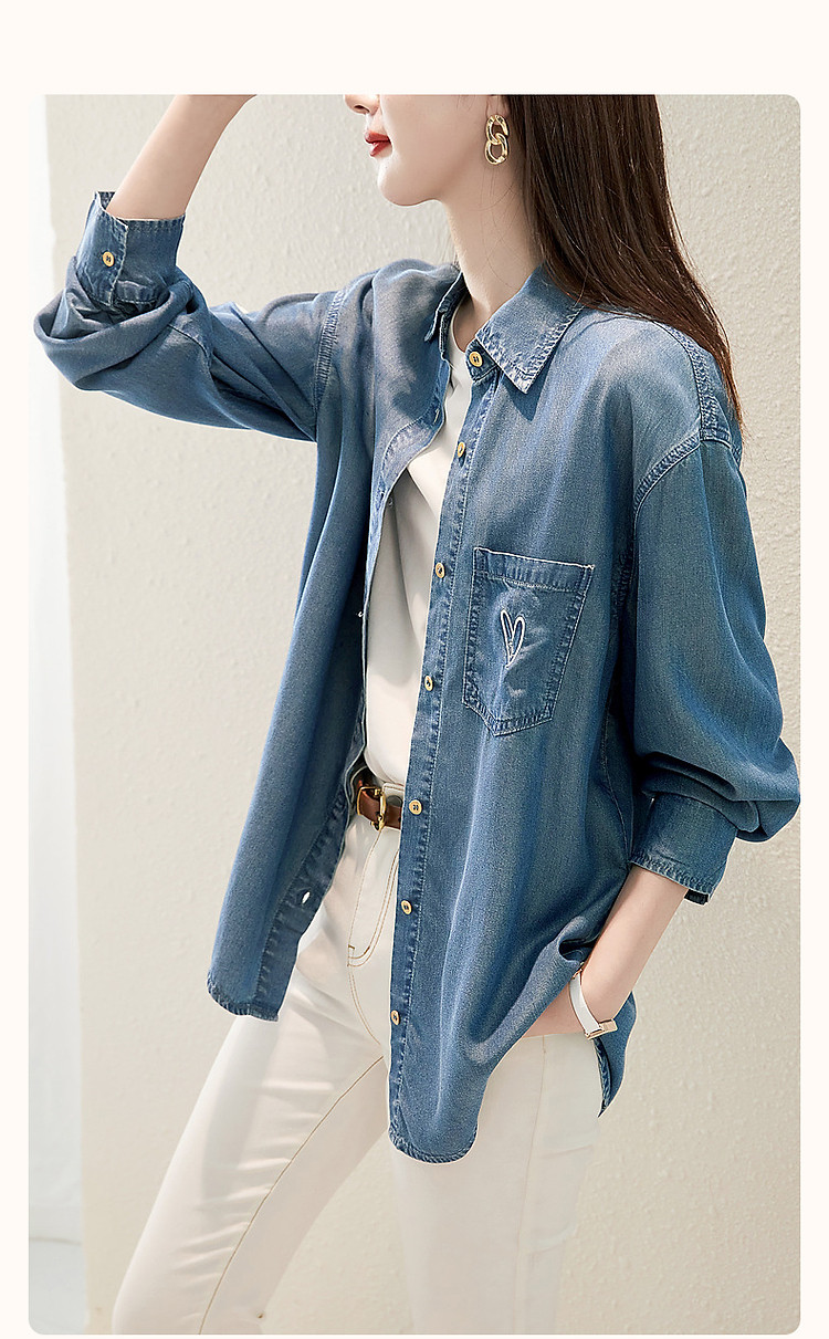 商品名称:【远方来信】春秋简约风云感棉牛仔衬衫爱心刺绣遮肉衬衣女装上衣 254145
