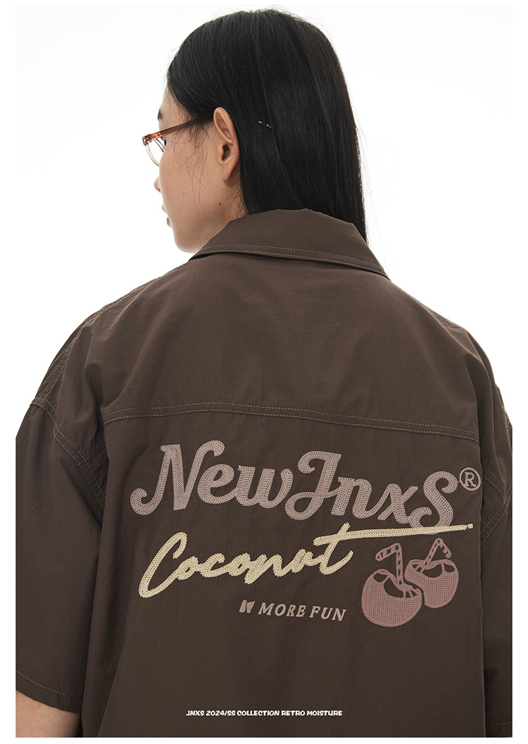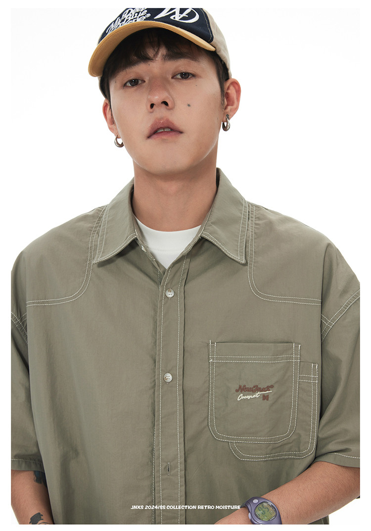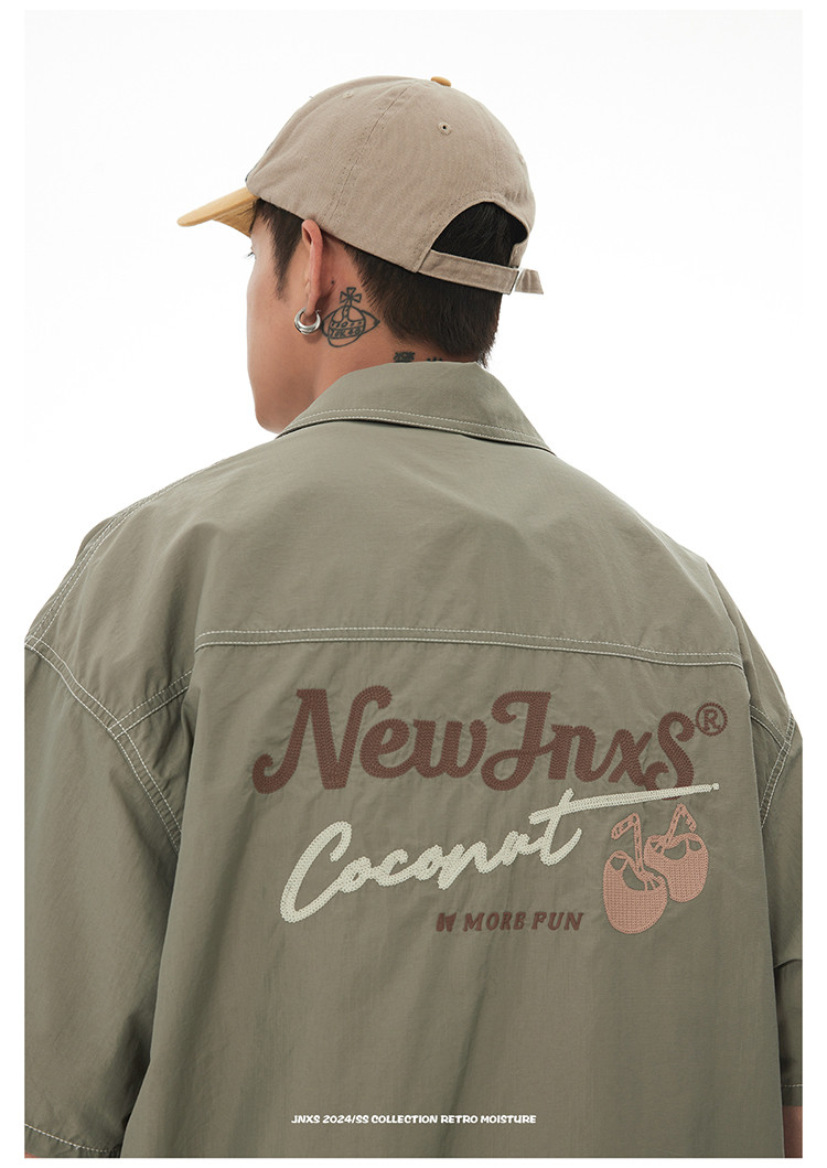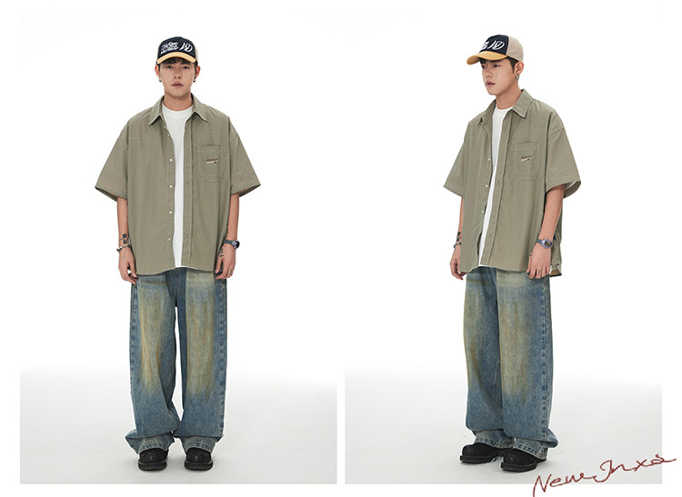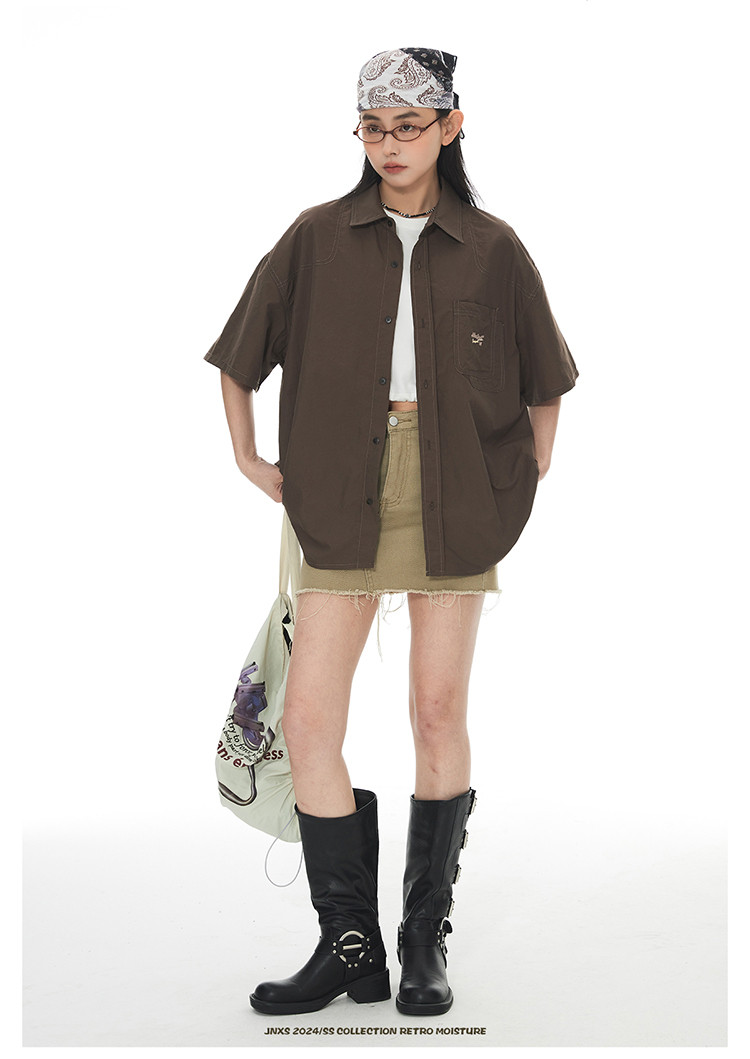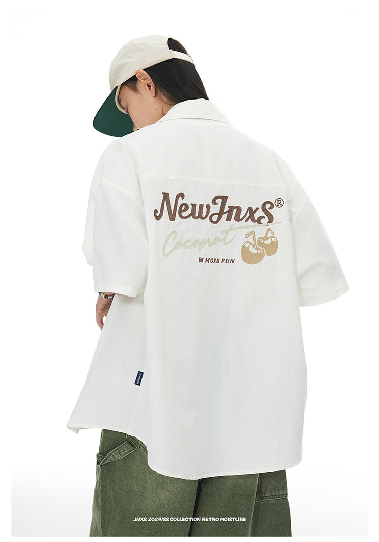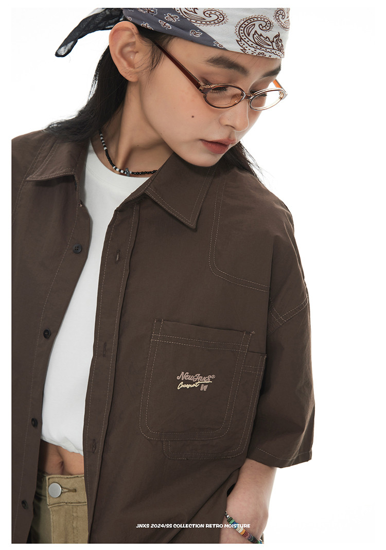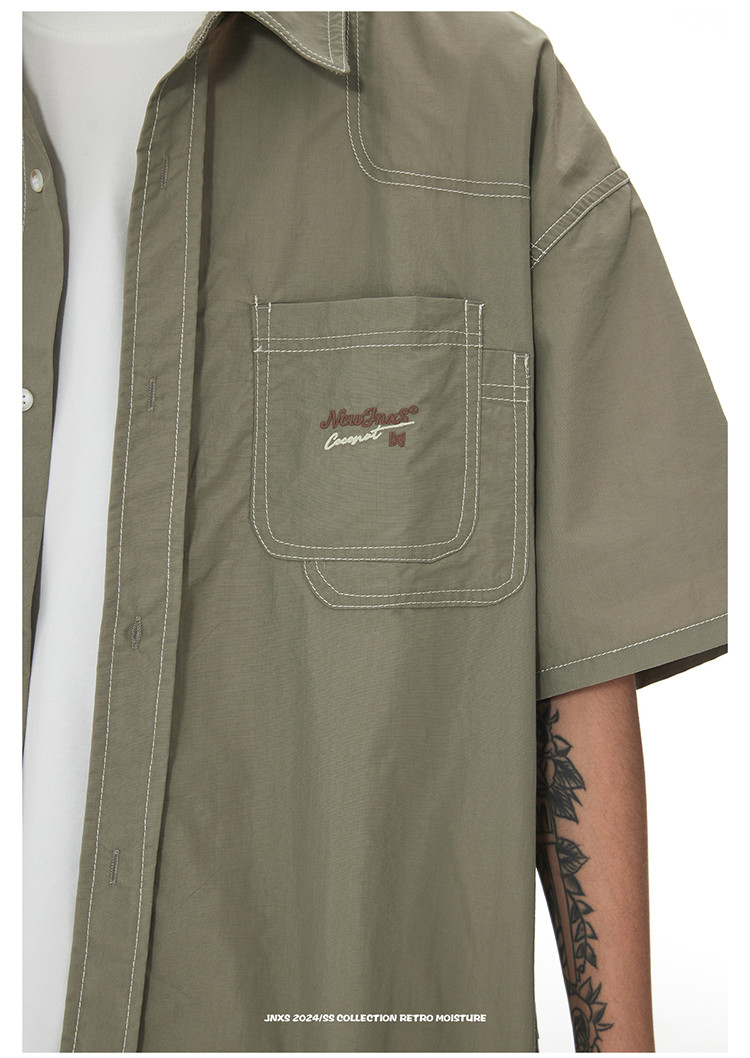 JNXS美式刺绣设计短袖衬衫夏季宽松男女国潮工装休闲衬衣 573905