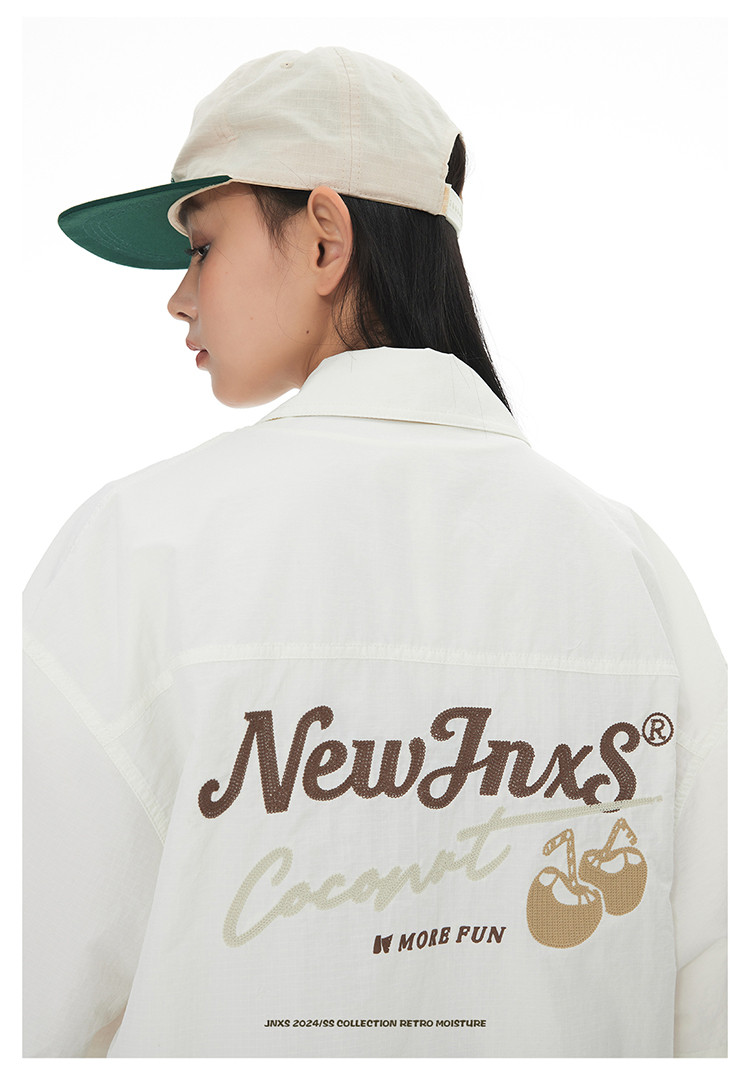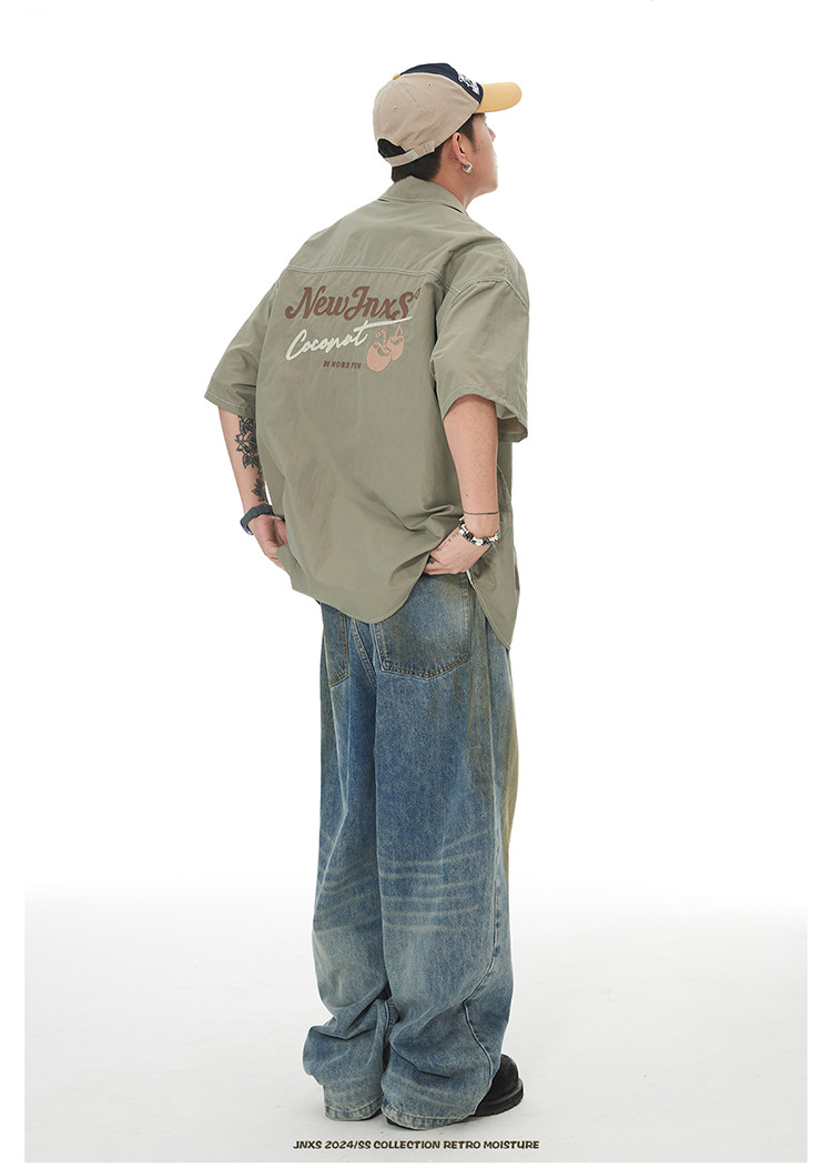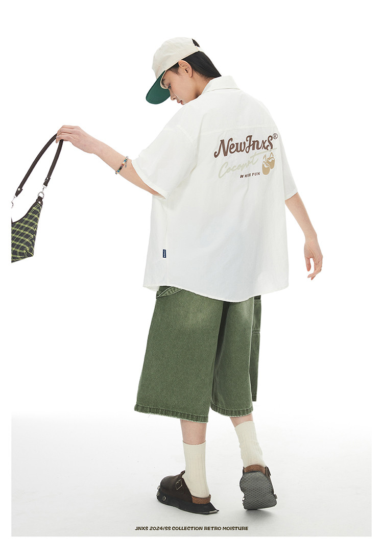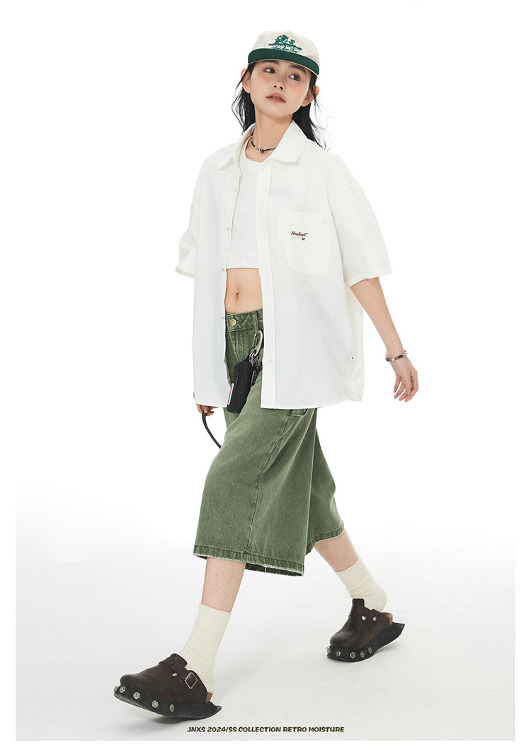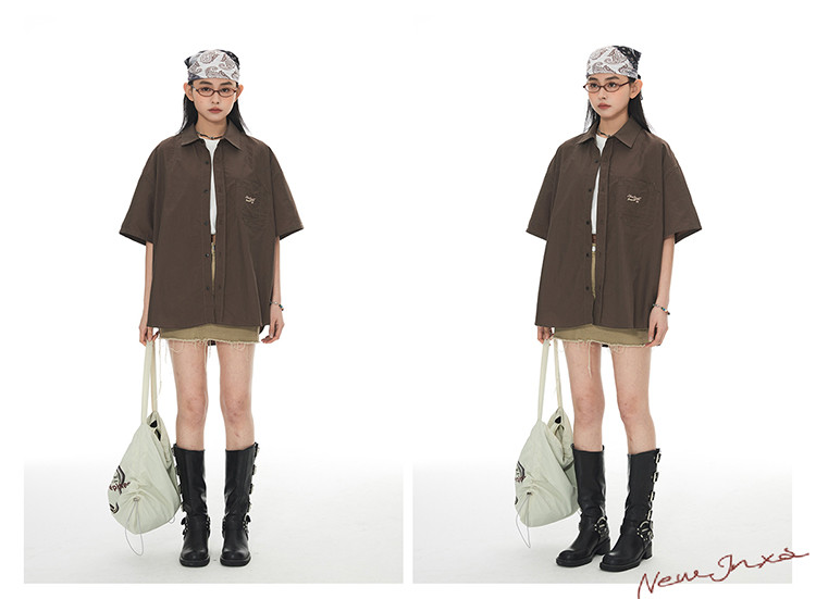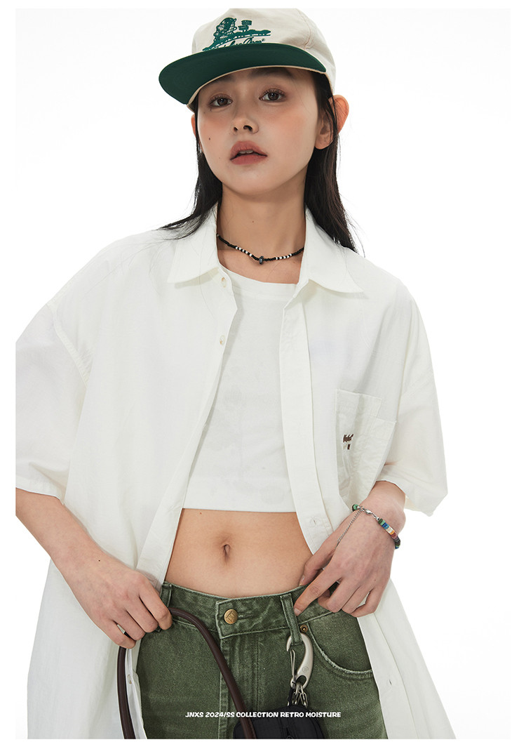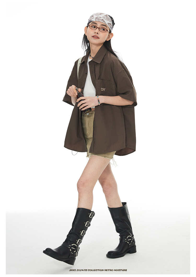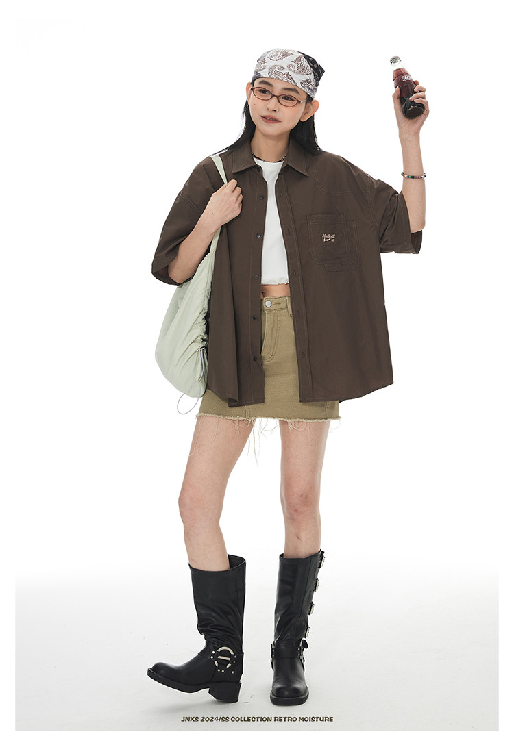 JNXS美式刺绣设计短袖衬衫夏季宽松男女国潮工装休闲衬衣 573905