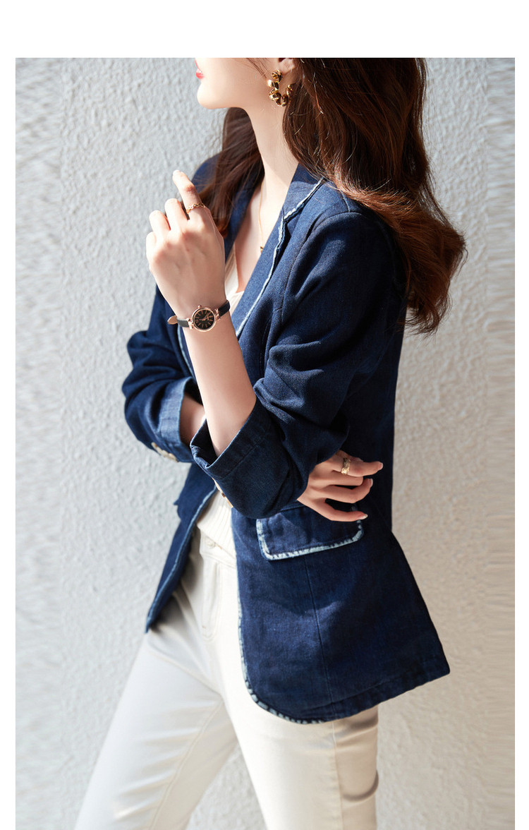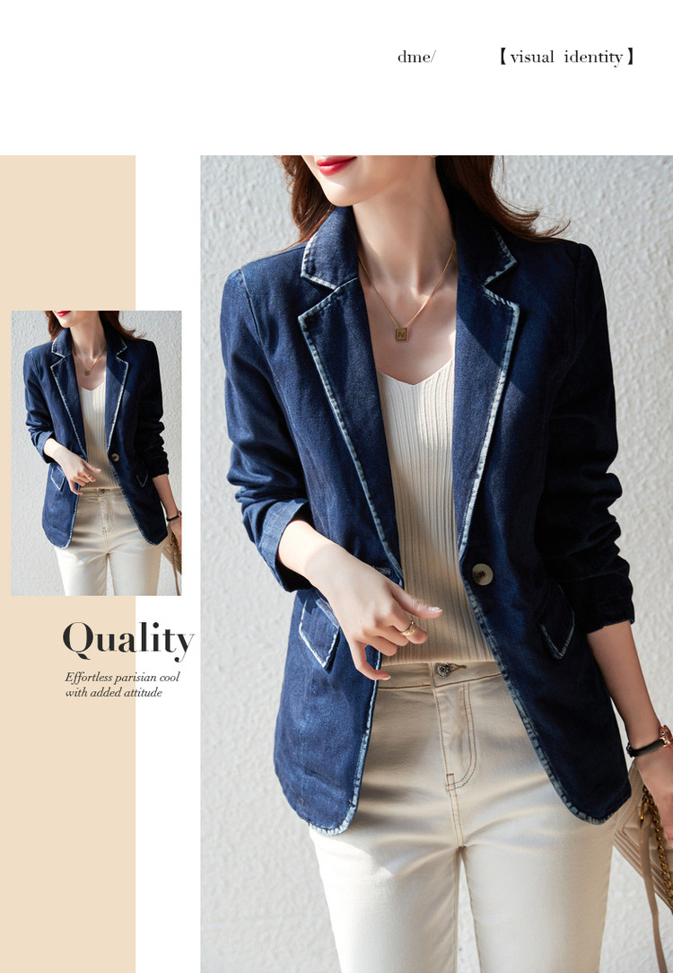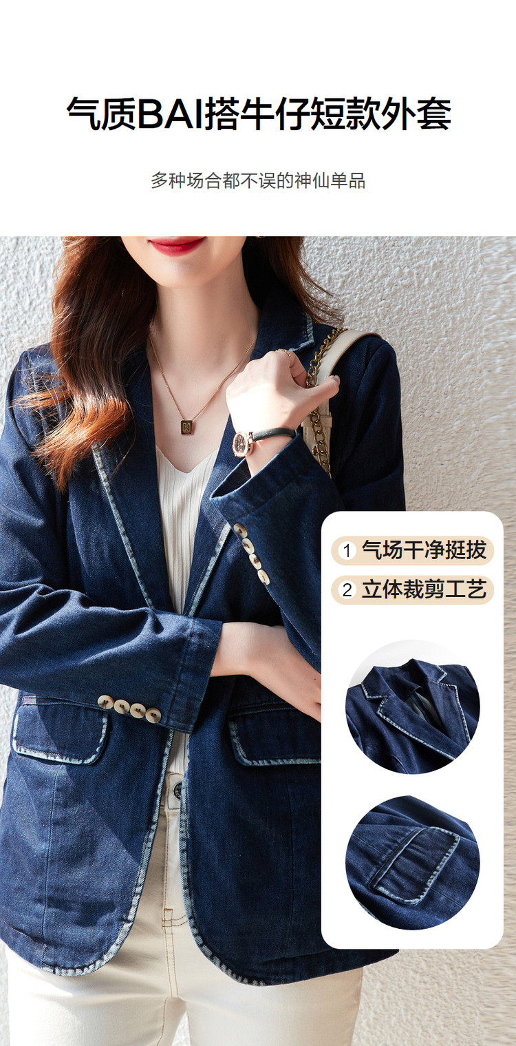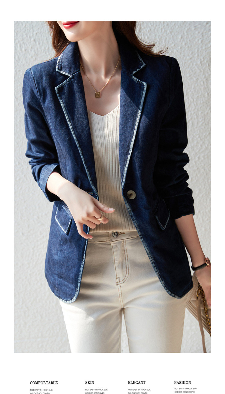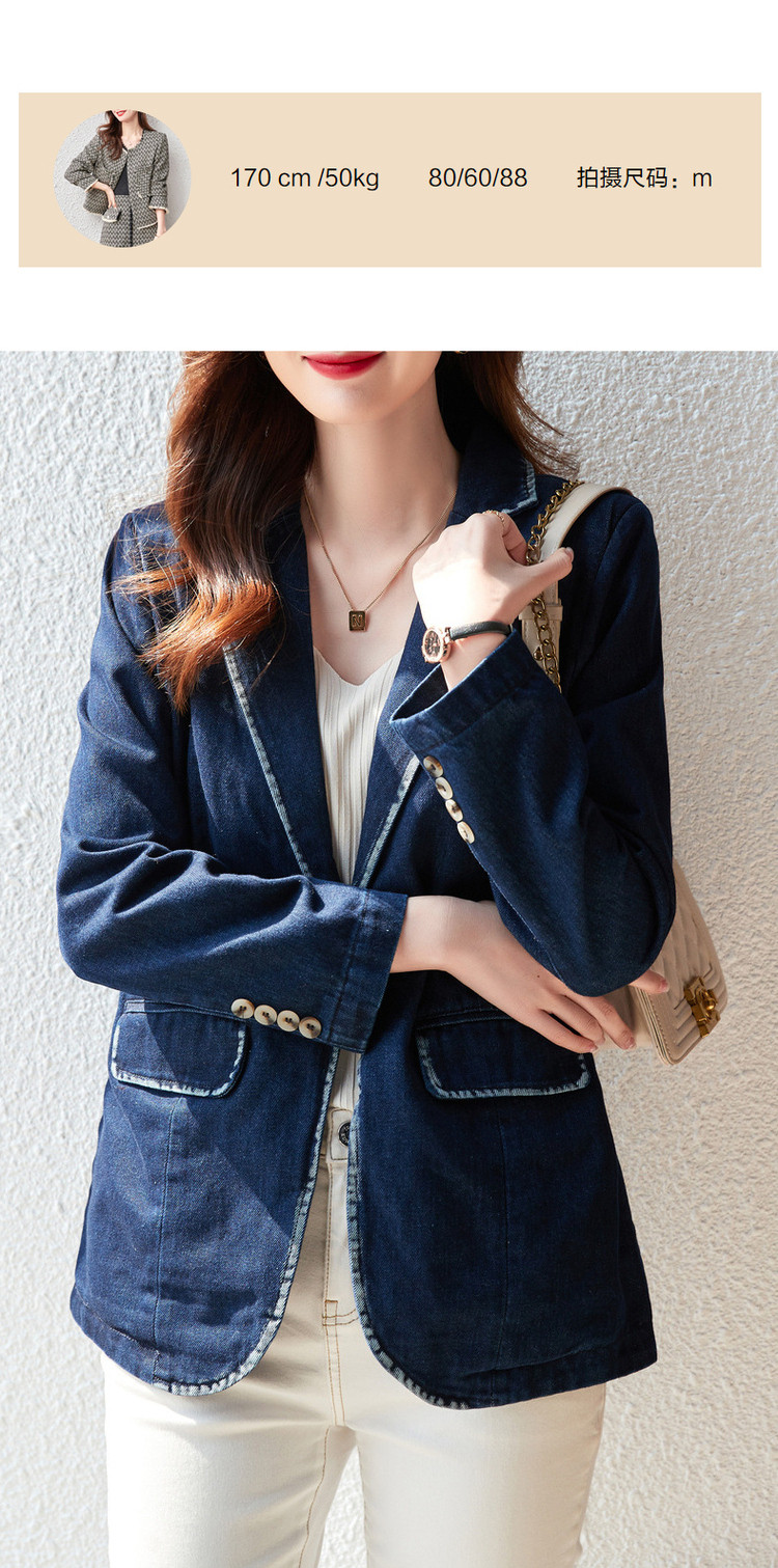 【智型丹宁】春秋通勤风云朵棉撞色边翻领一粒扣修身女式牛仔外套 171457
